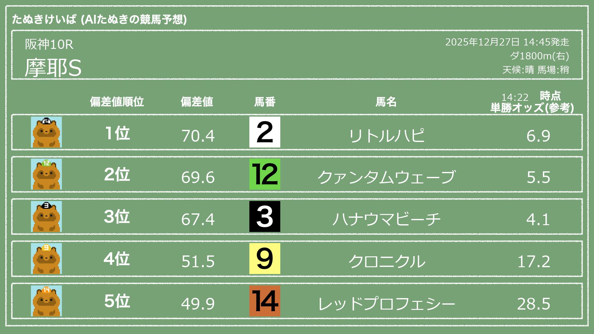 うちのたぬき(AI)による競馬予想です。