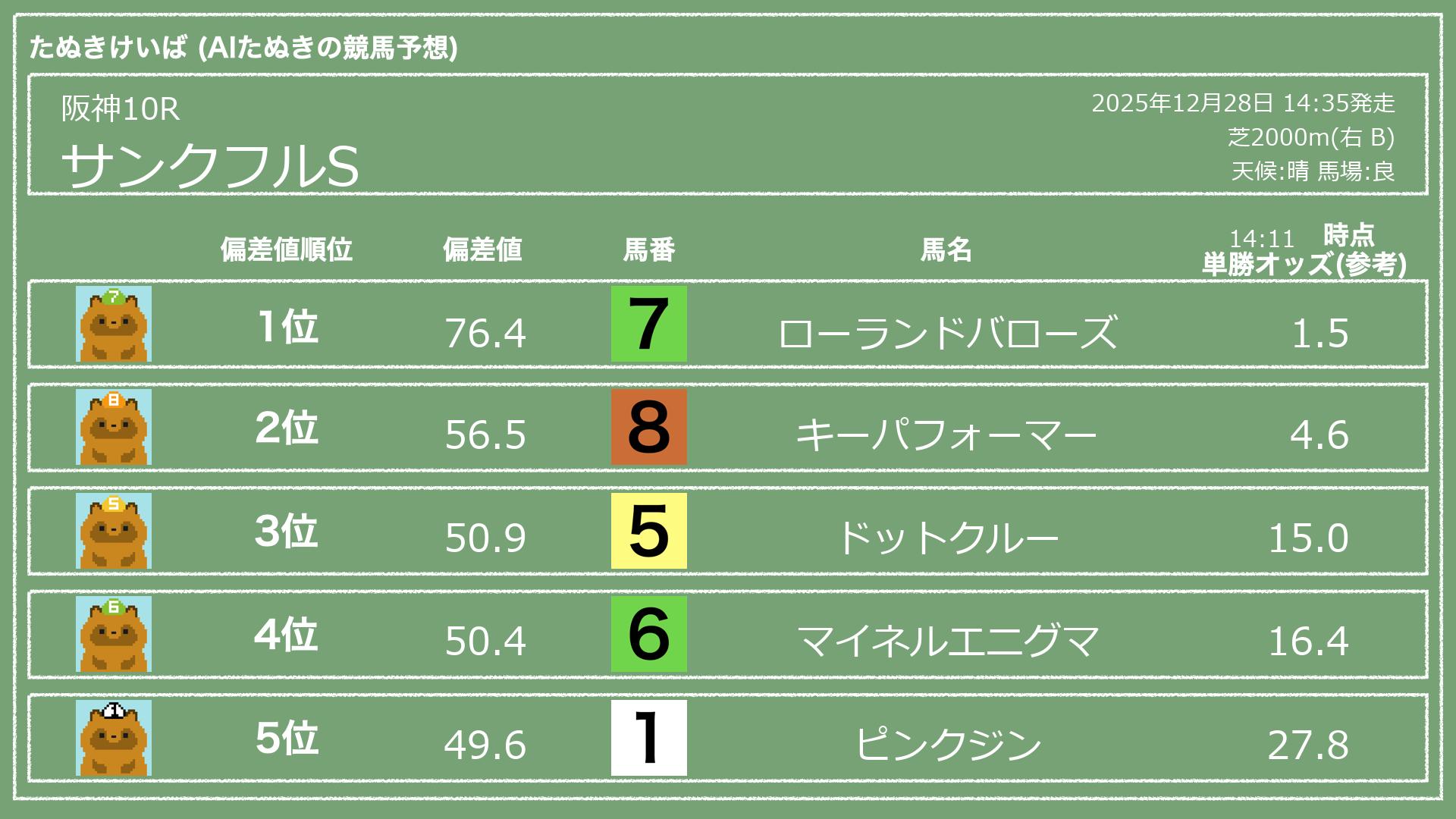 うちのたぬき(AI)による競馬予想です。レースごとに各馬の能力を偏差値で表現してみました。