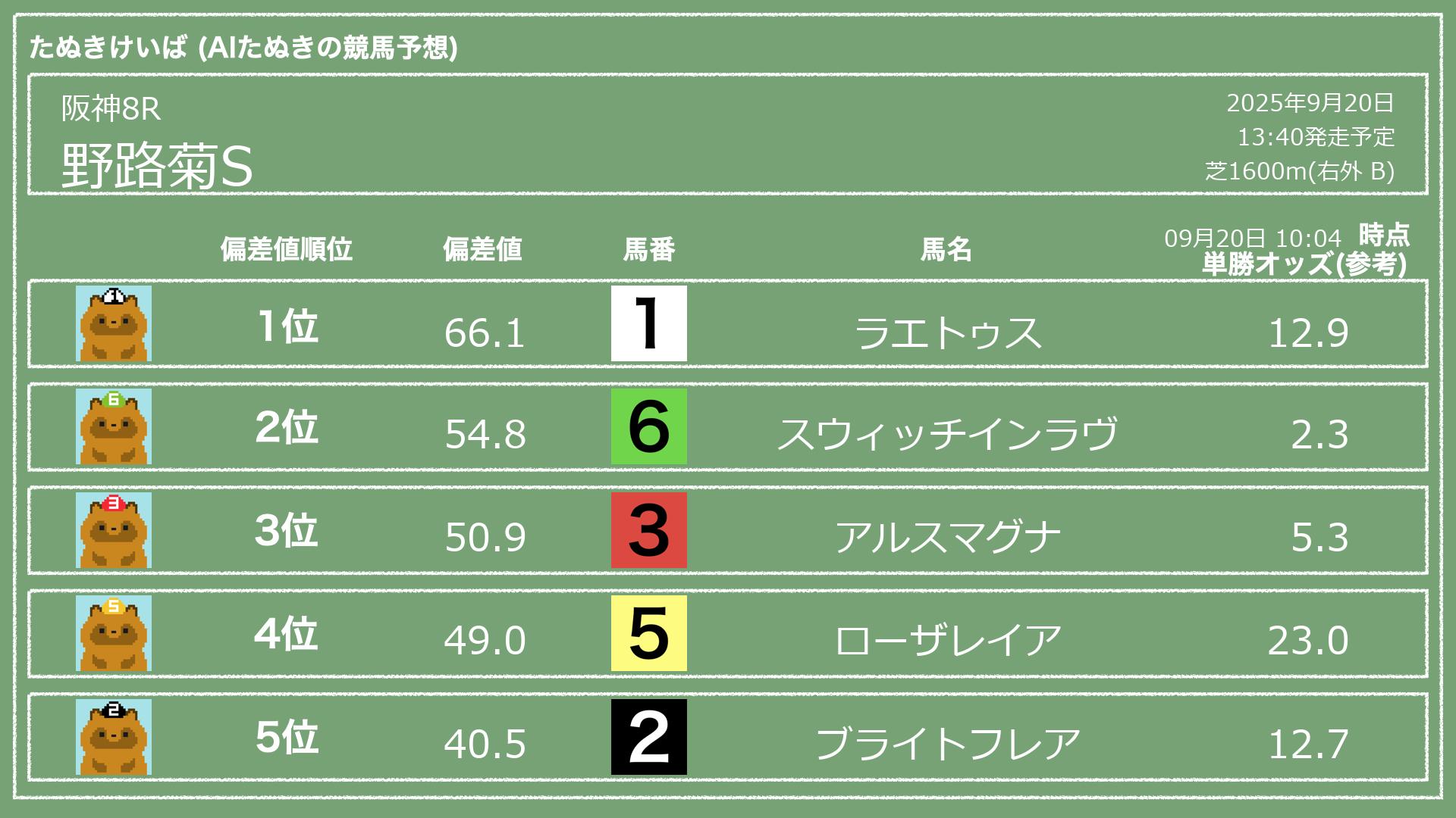 枠番 | 馬番 | 馬名 | 人気(予想時点) | オッズ(予想時点) | 馬券偏差値 | |