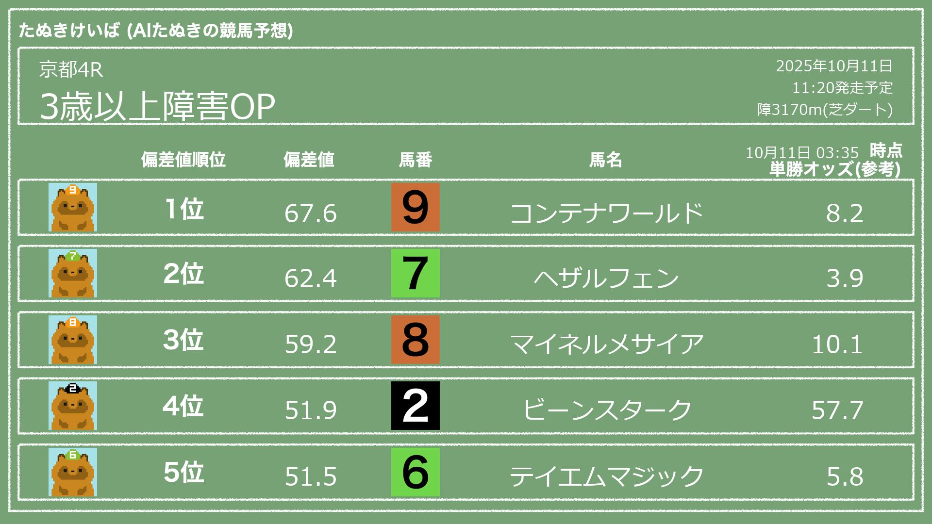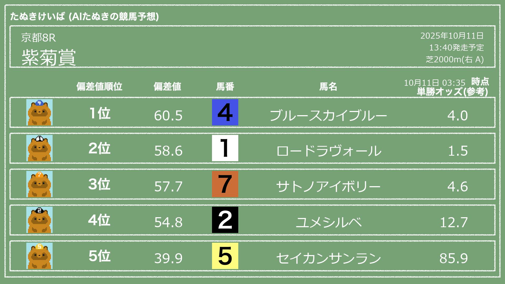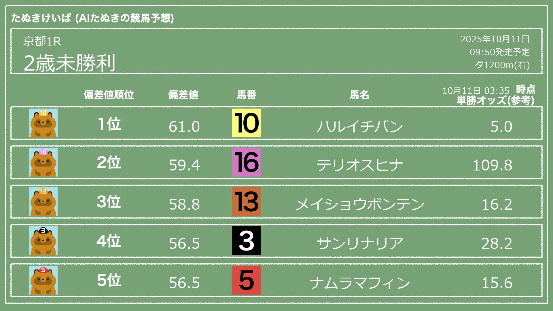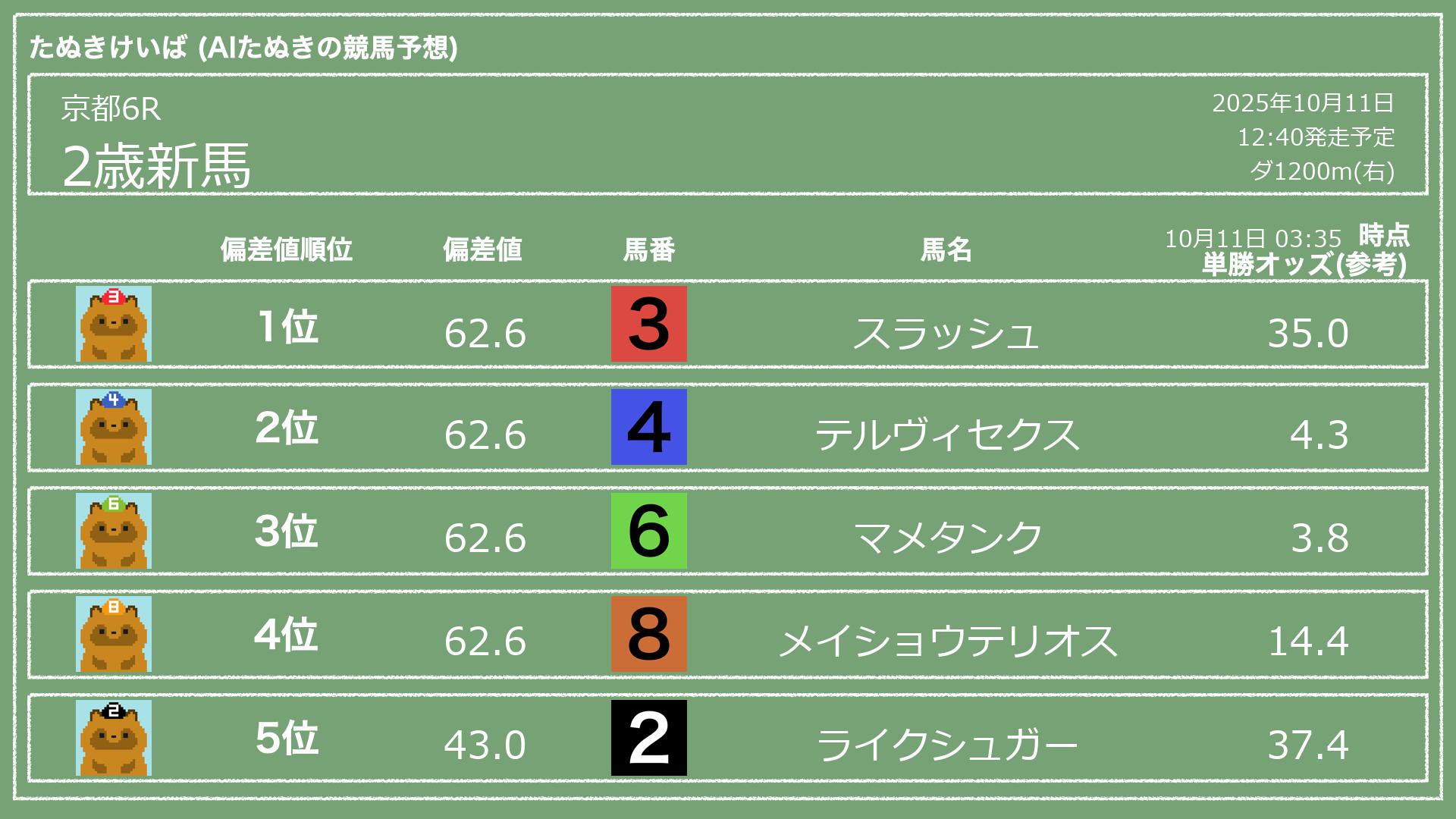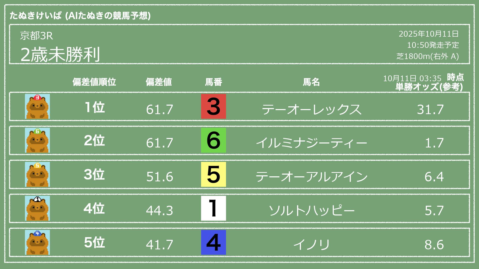 3 | 5 | 5 | テーオーアルアイン | 4 | 6.4 | 51.6 |