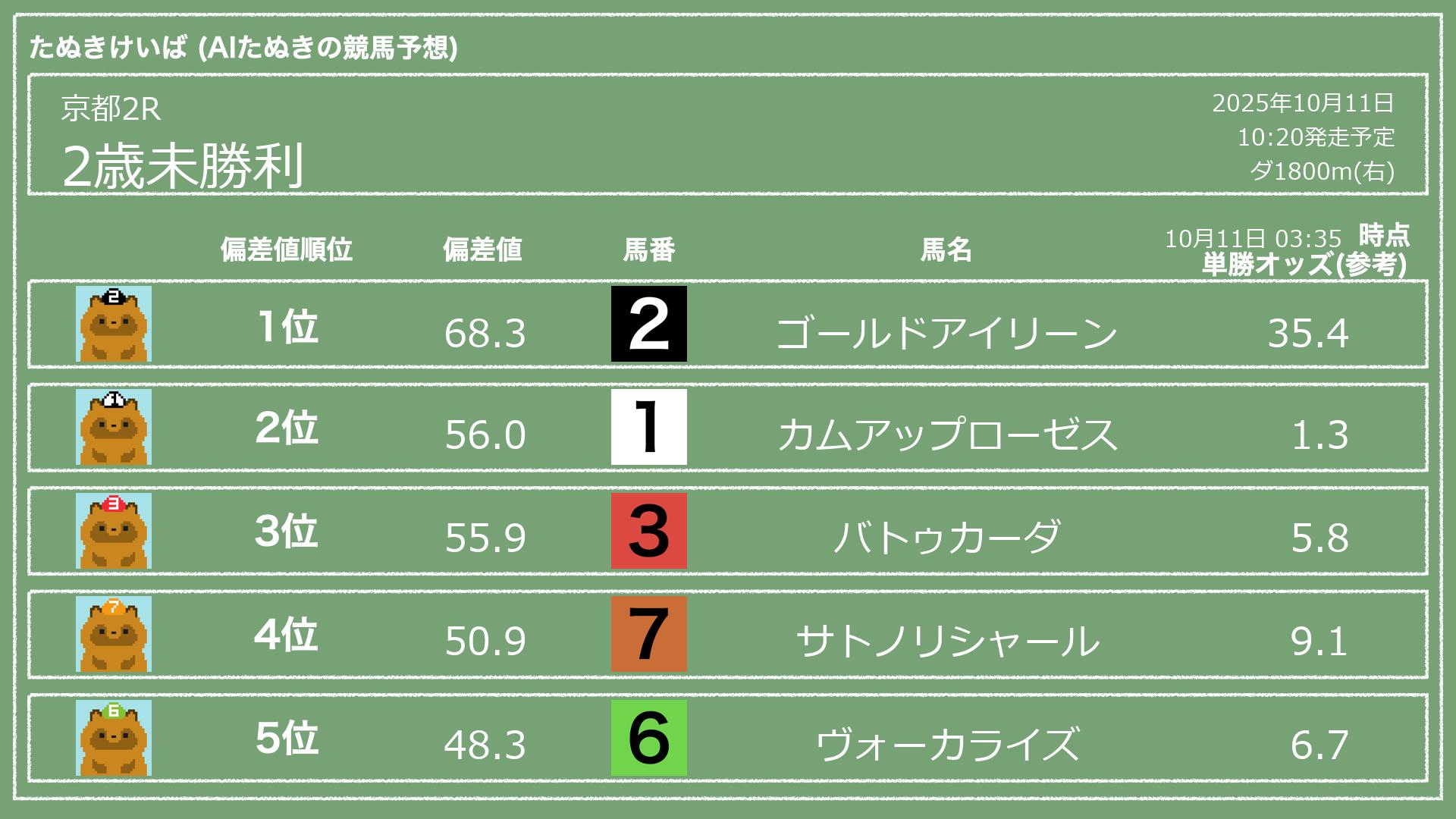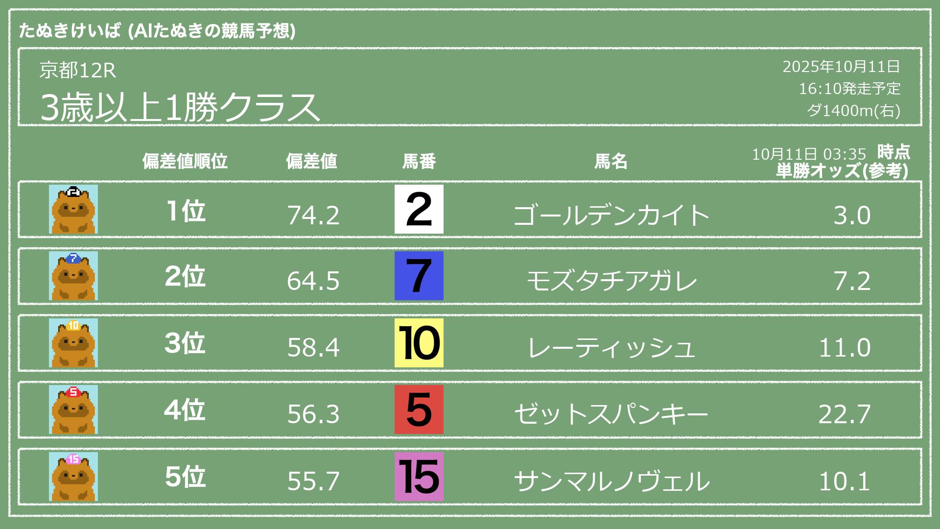 1 | 1 | 2 | ゴールデンカイト | 1 | 3.0 | 74.2 |