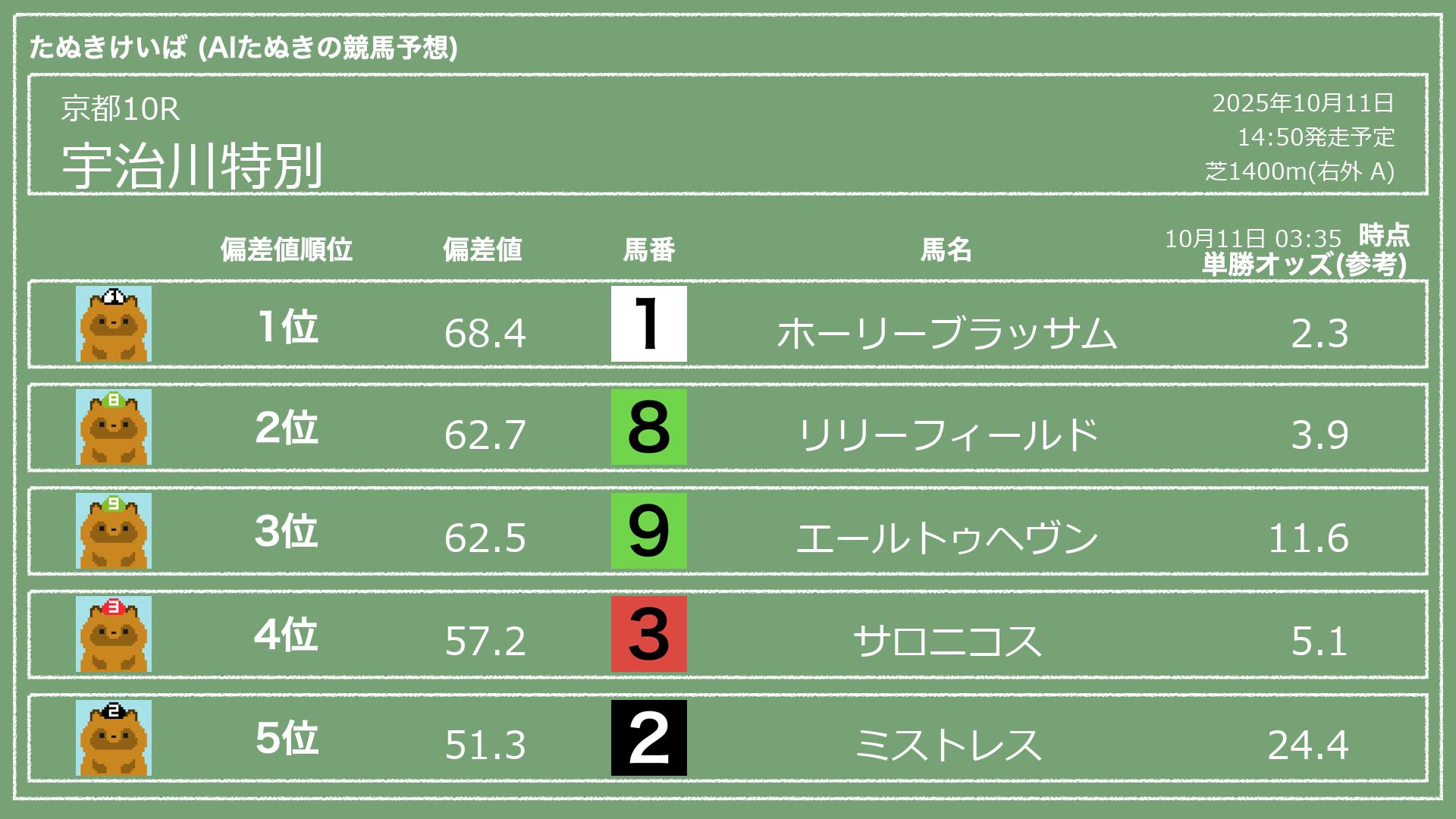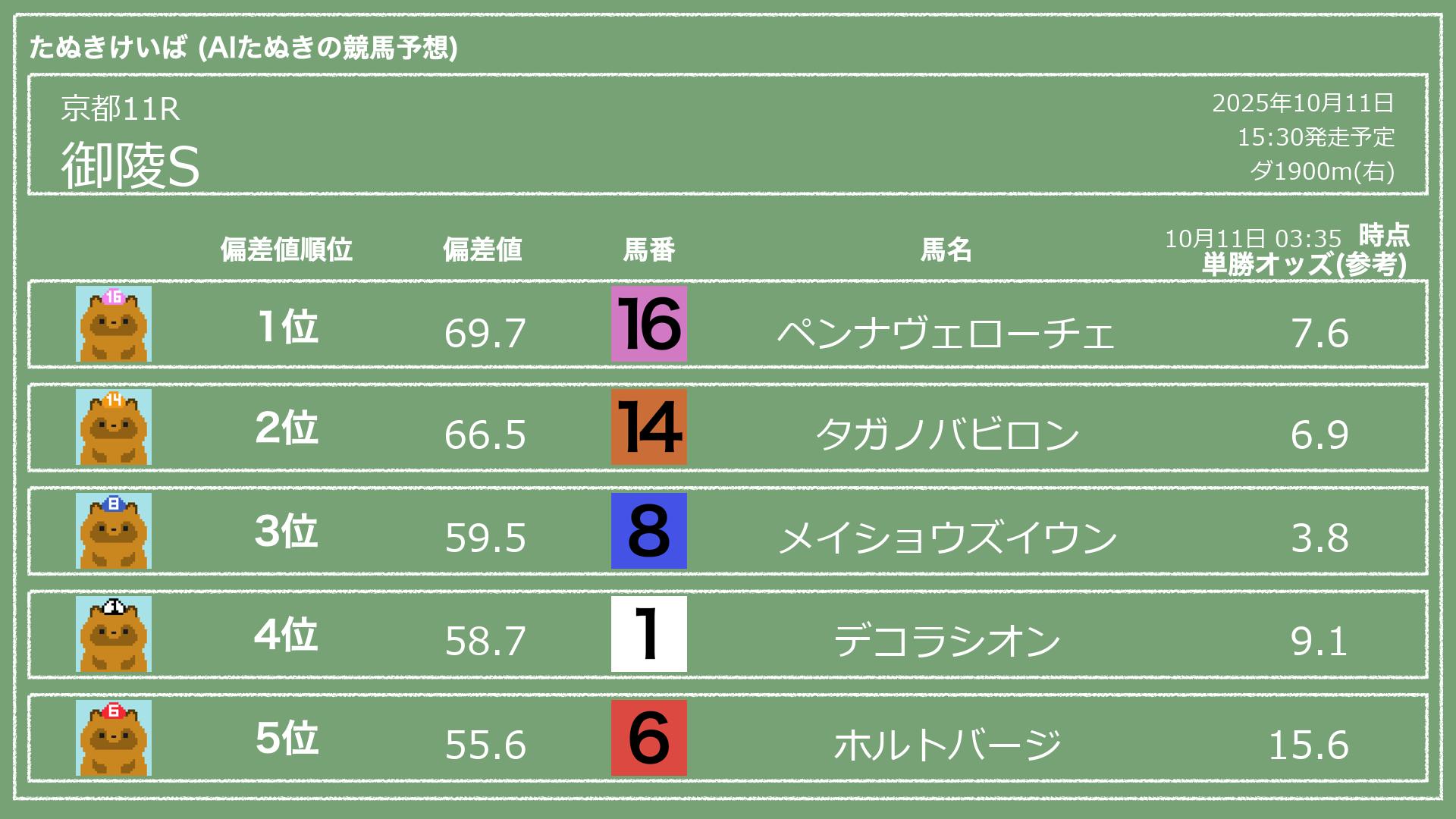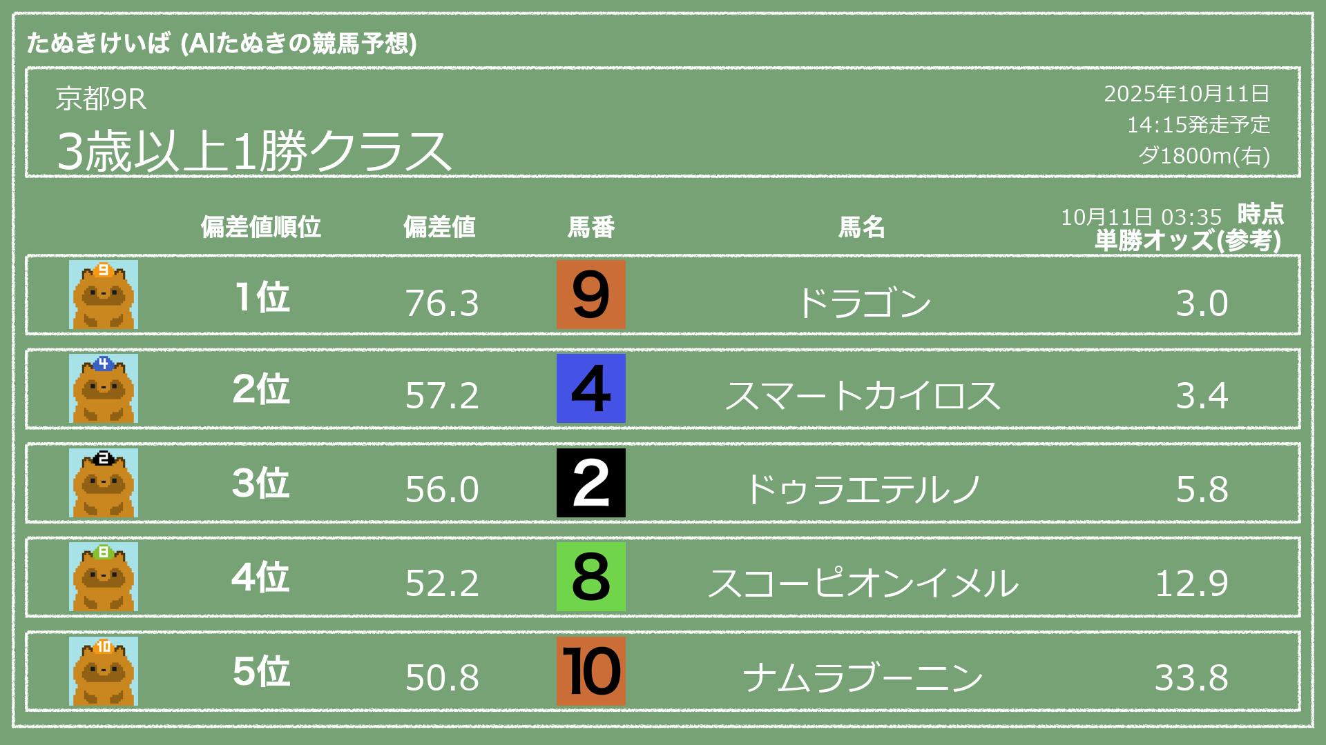 枠番 | 馬番 | 馬名 | 人気(予想時点) | オッズ(予想時点) | 馬券偏差値 | |