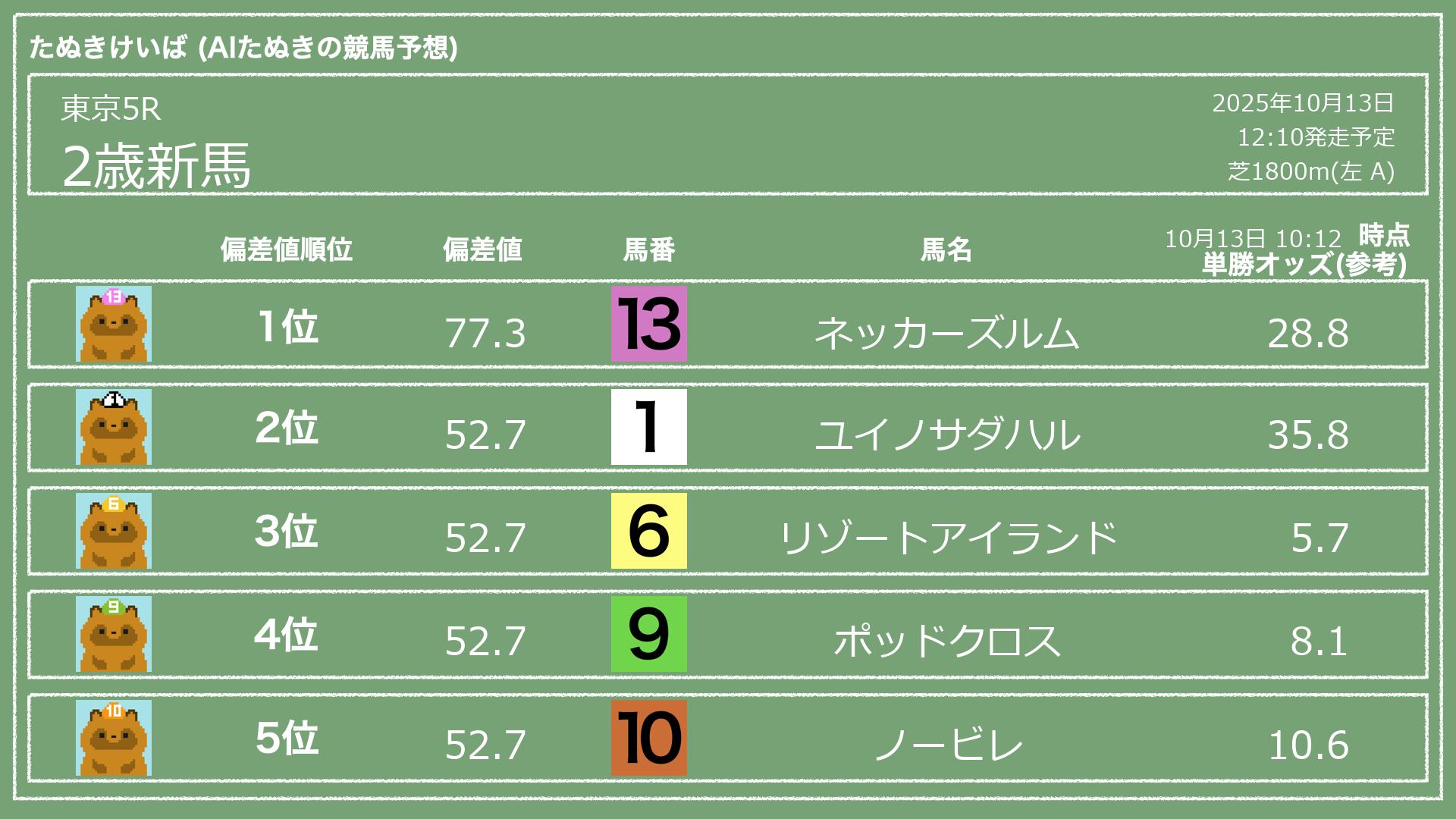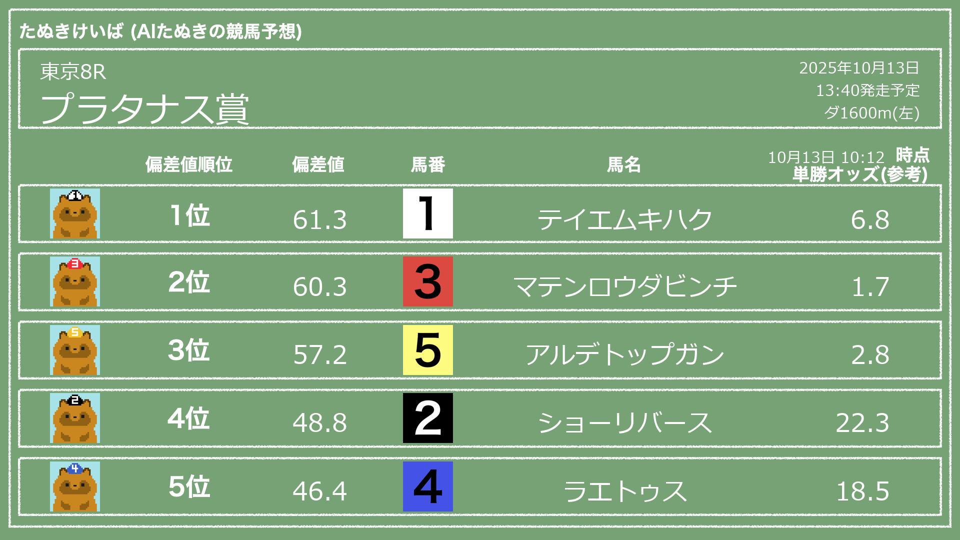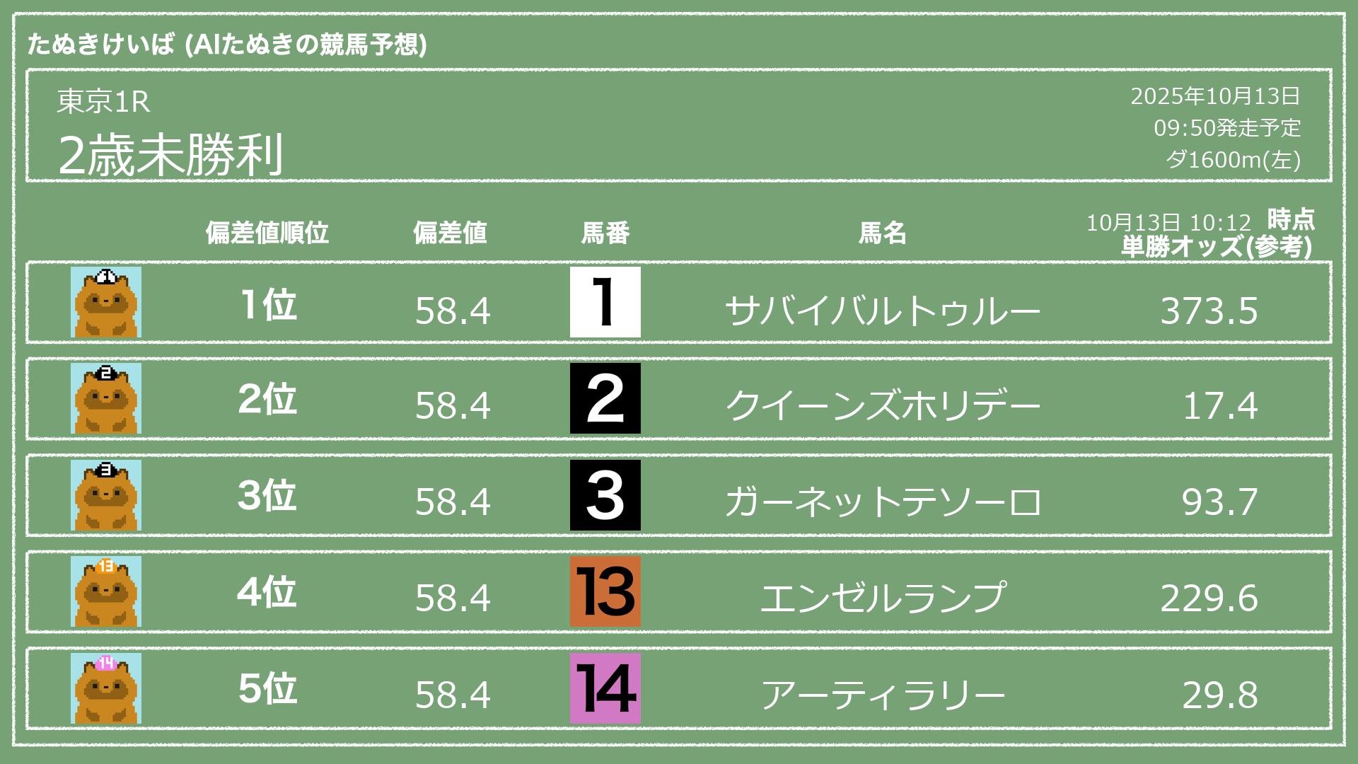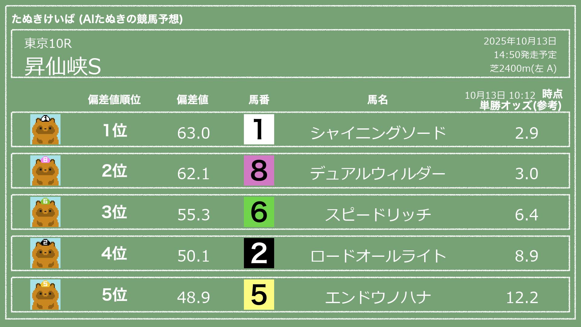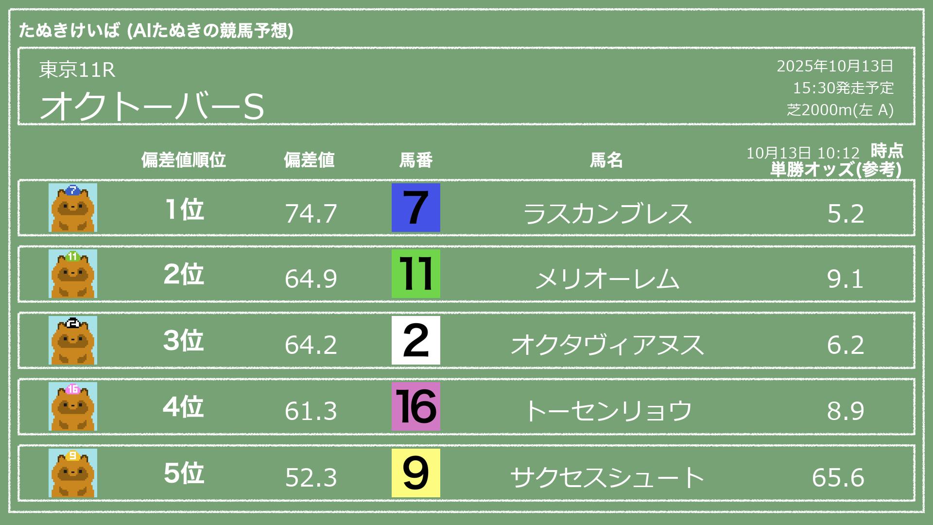 枠番 | 馬番 | 馬名 | 人気(予想時点) | オッズ(予想時点) | 馬券偏差値 | |