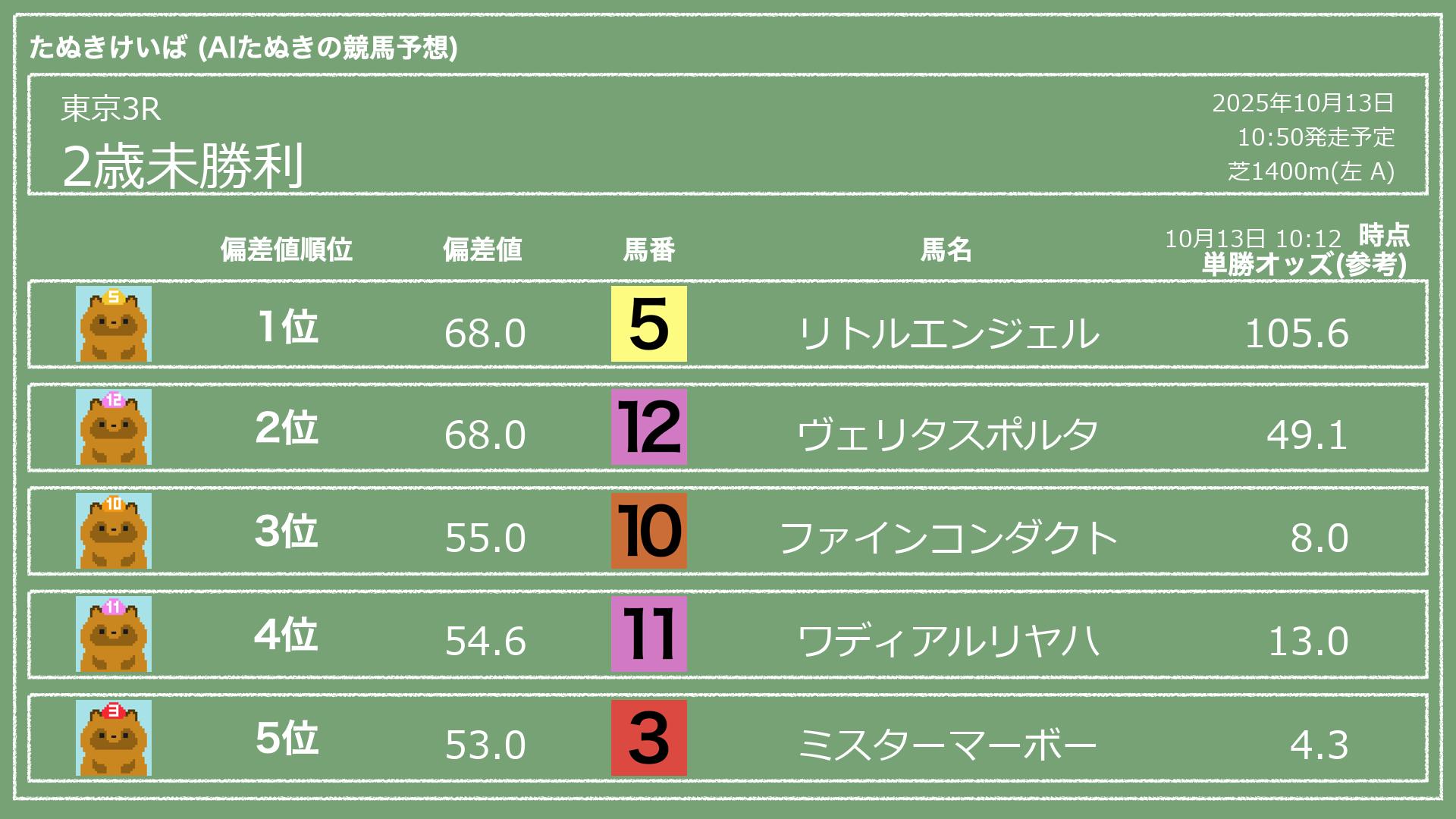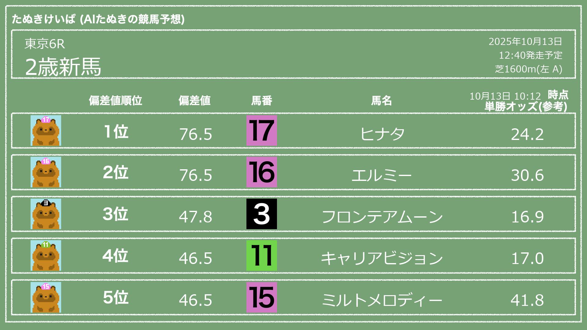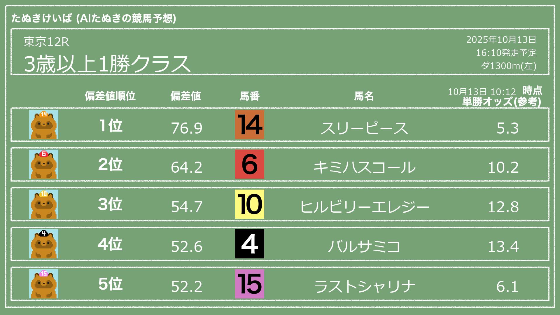 12 | 2 | 2 | トーアマリシテン | 13 | 71.5 | 40.2 |