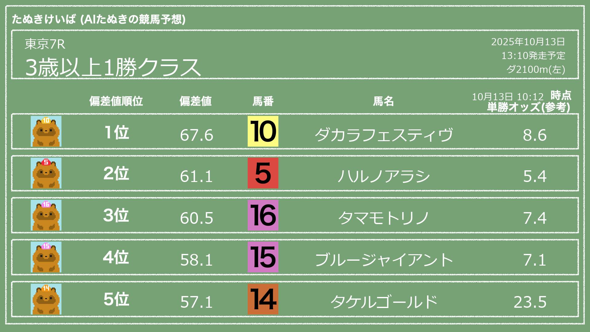 3 | 8 | 16 | タマモトリノ | 3 | 7.4 | 60.5 |