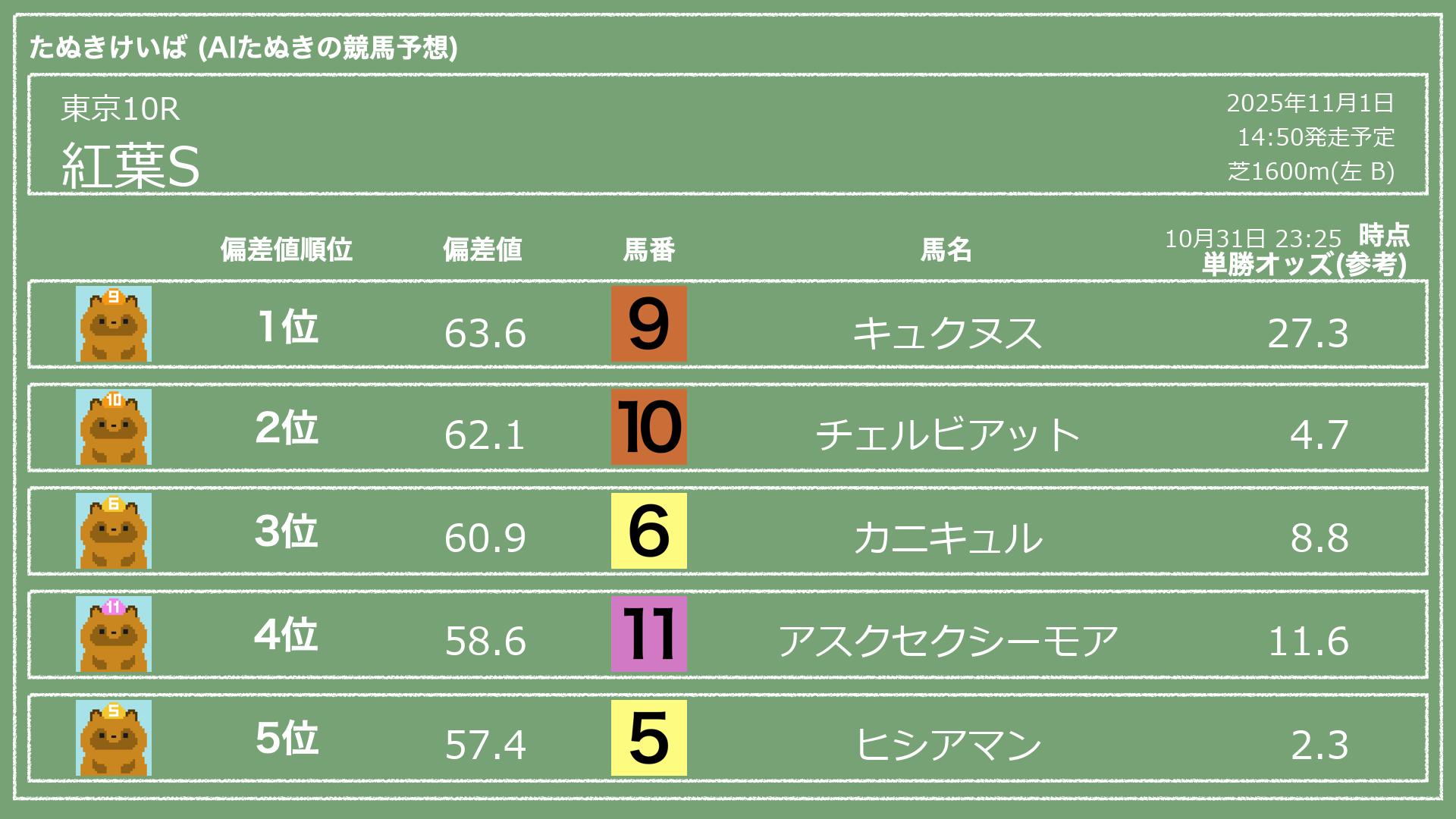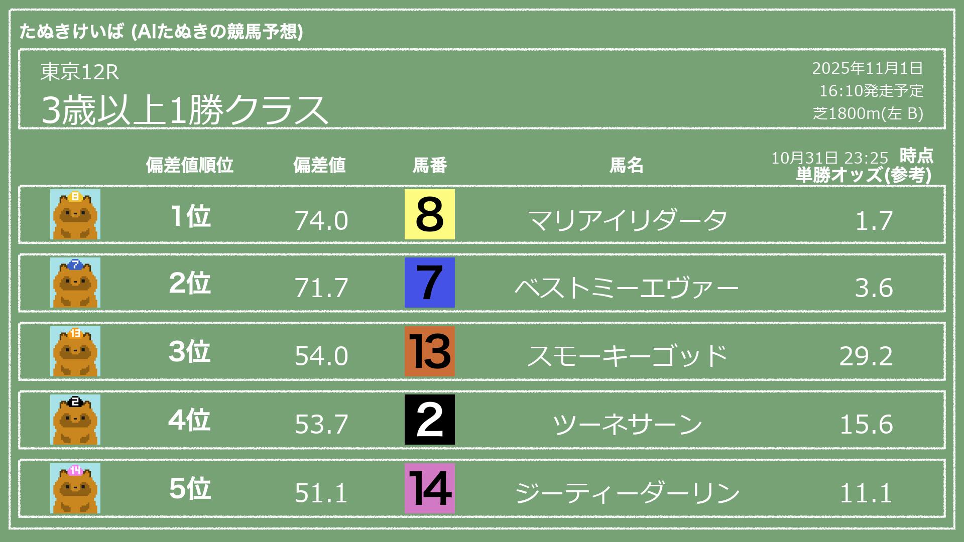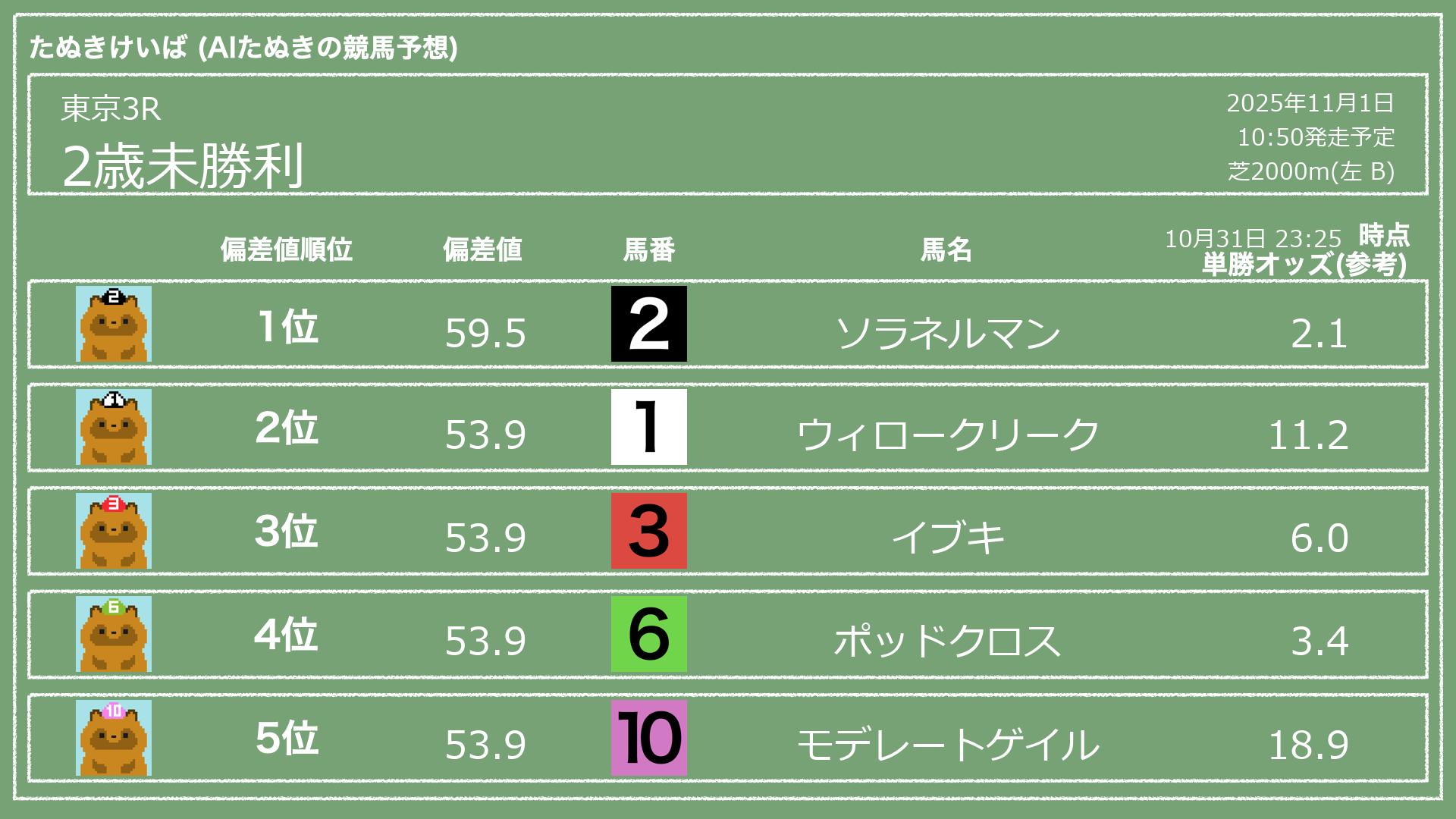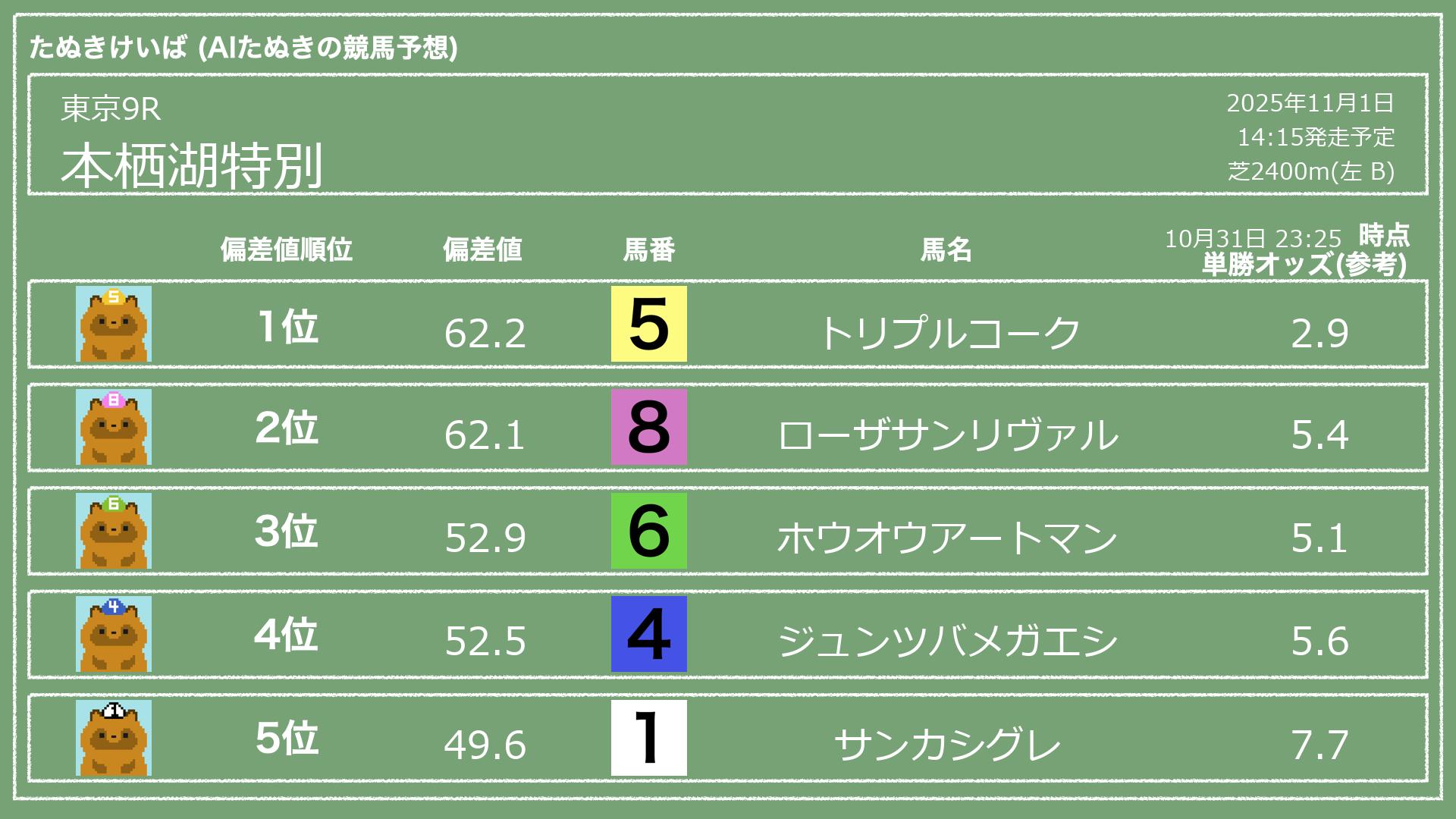 | 枠番 | 馬番 | 馬名 | 人気(予想時点) | オッズ(予想時点) | 馬券偏差値 | |