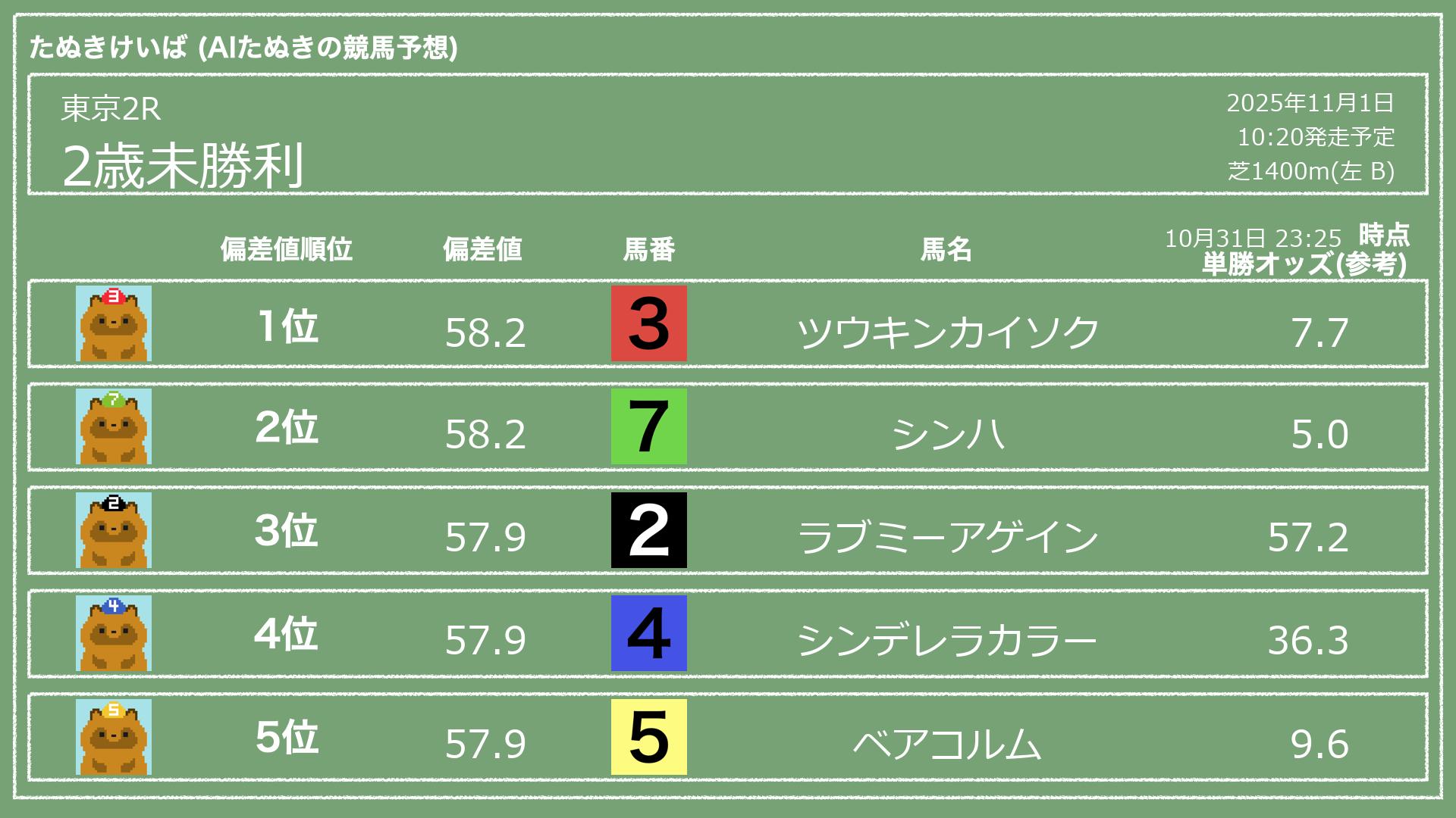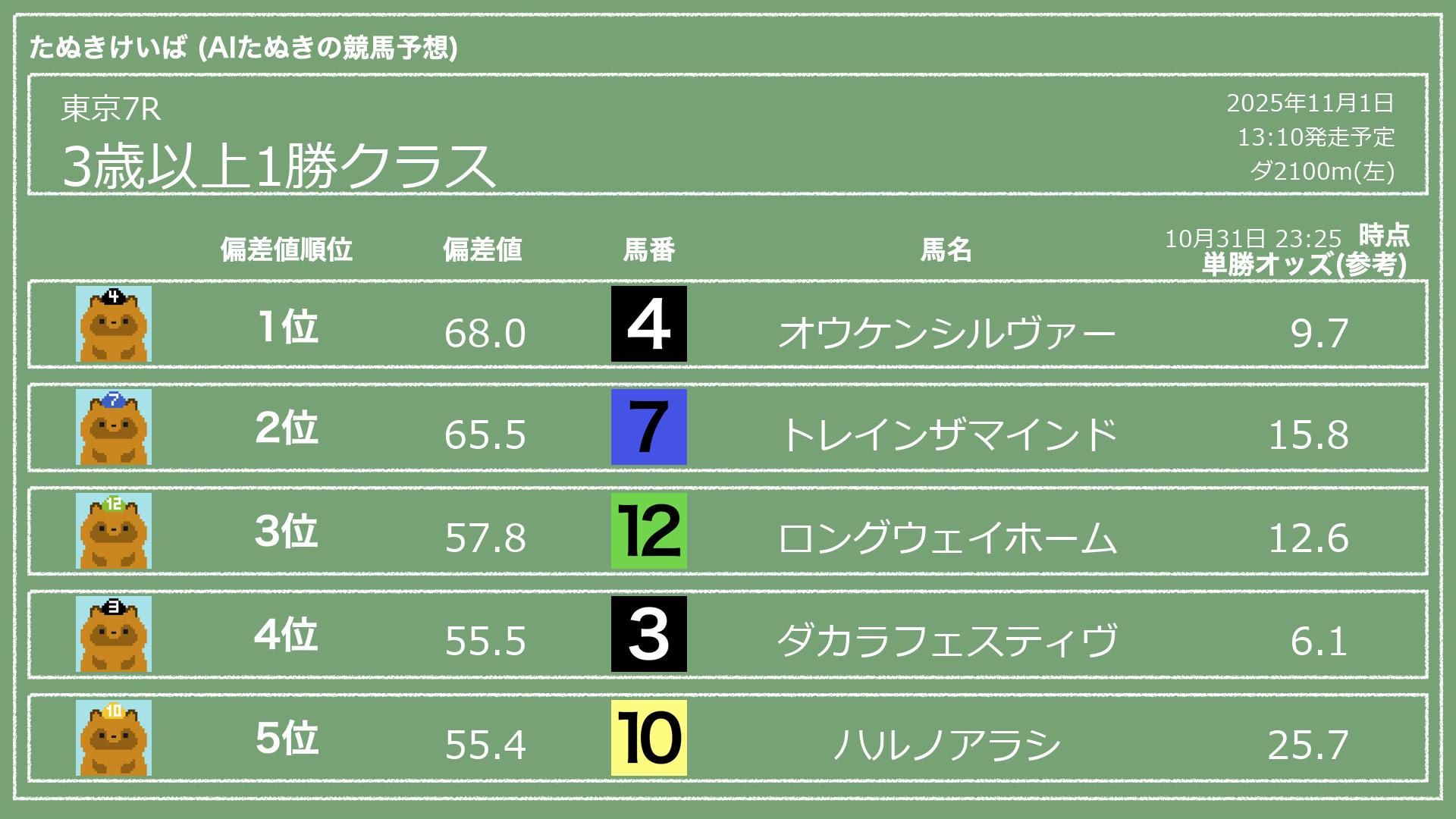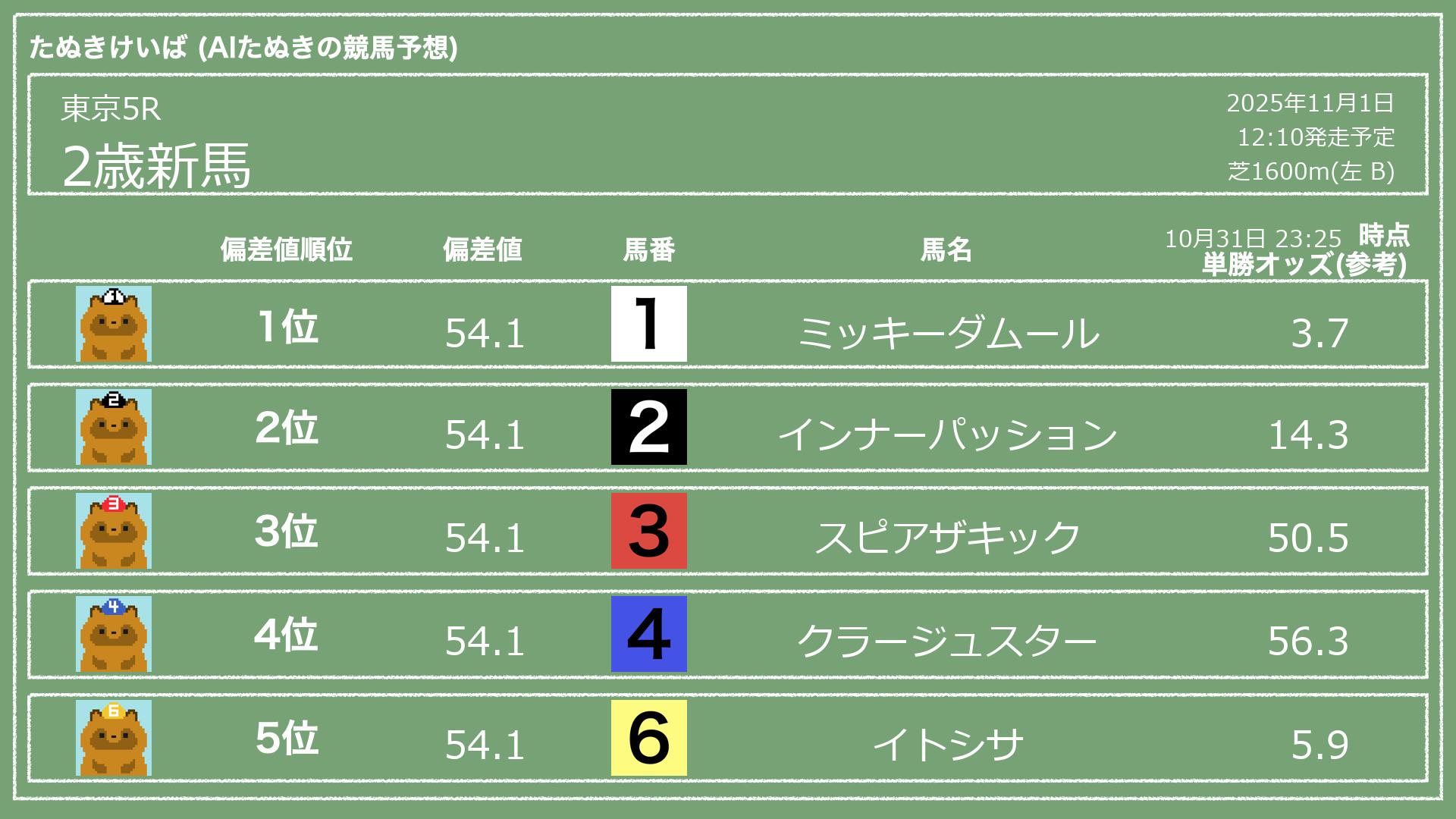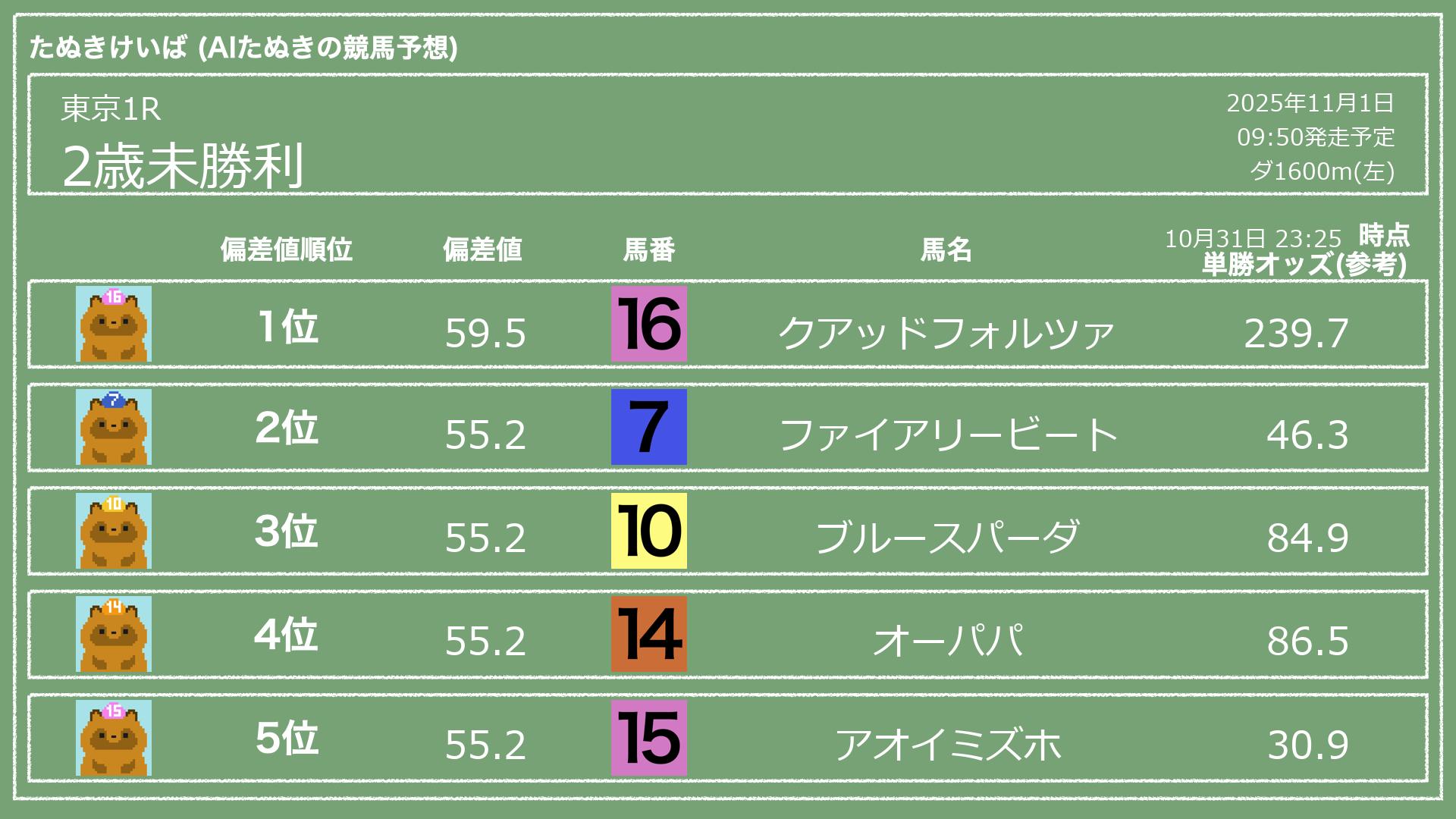 | 枠番 | 馬番 | 馬名 | 人気(予想時点) | オッズ(予想時点) | 馬券偏差値 | |