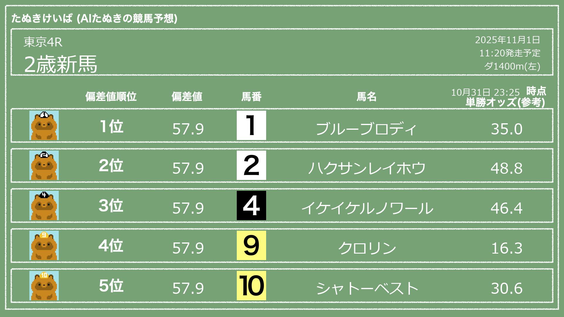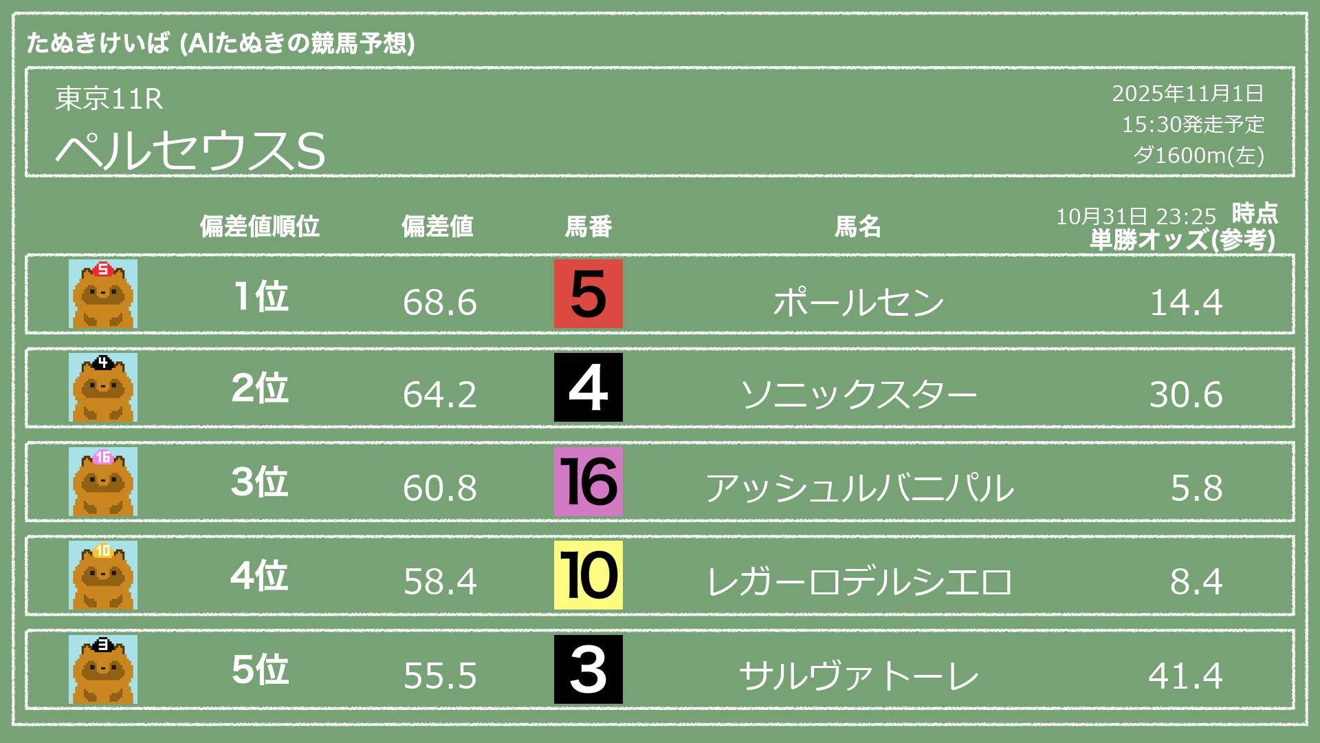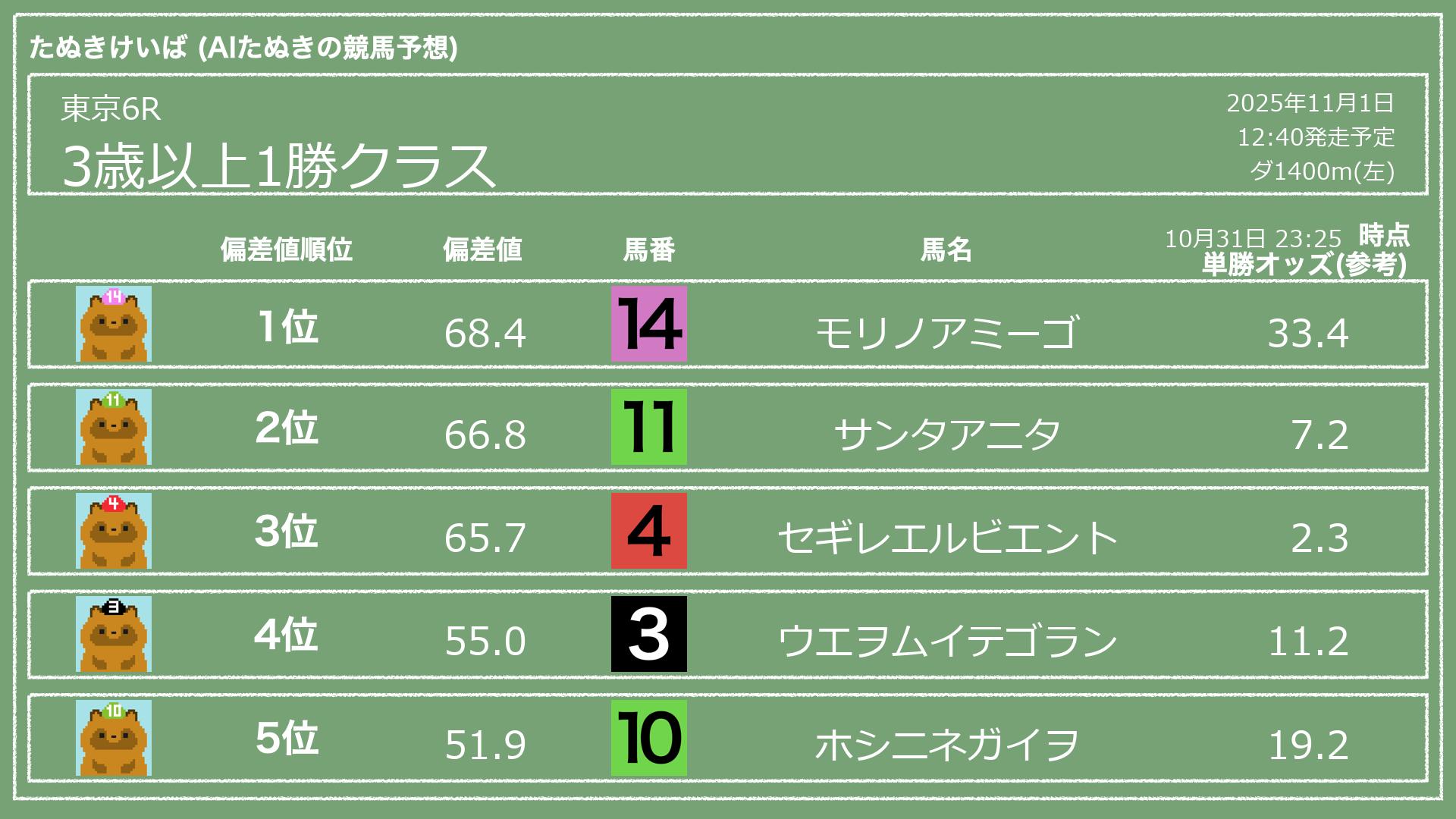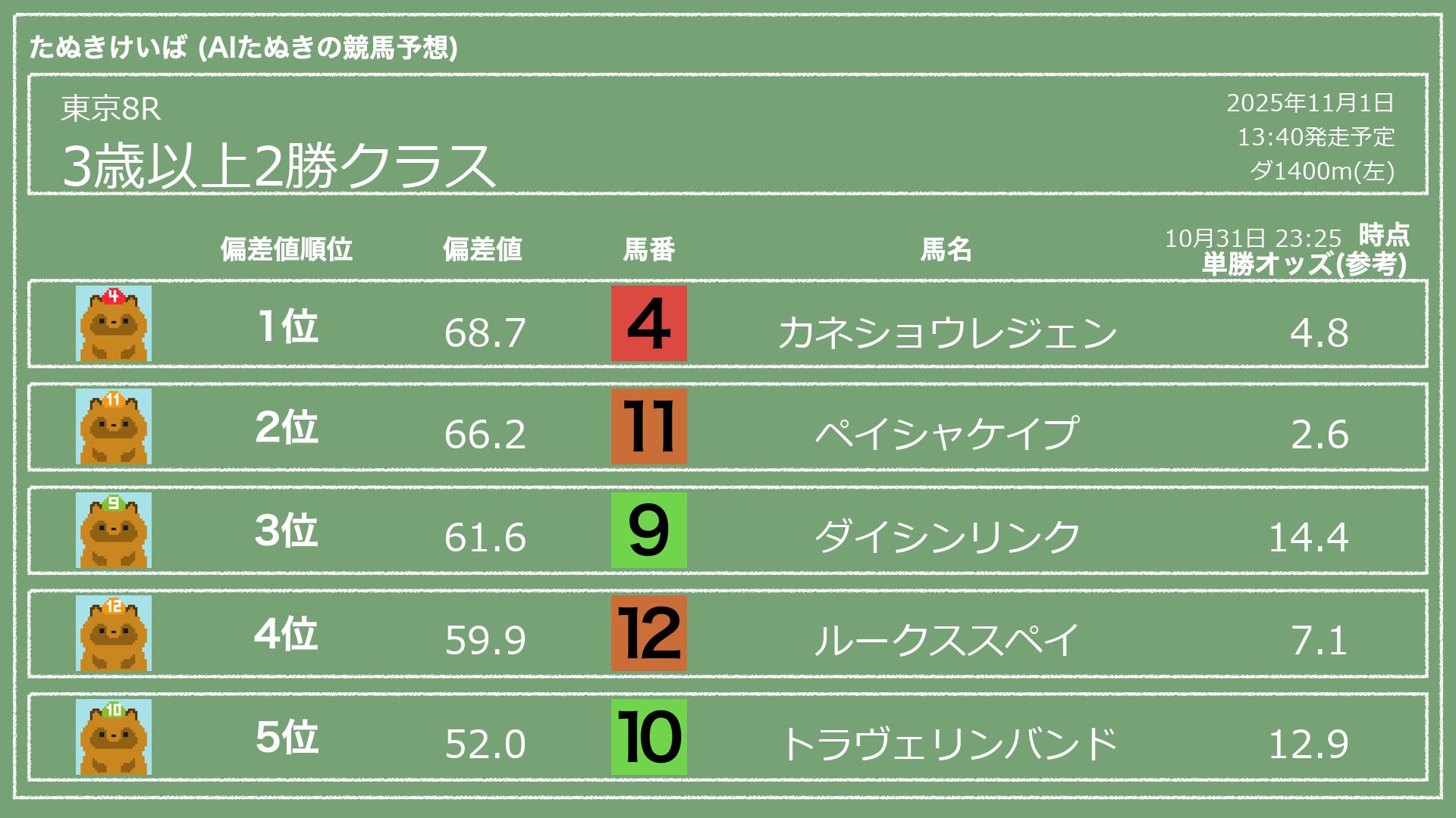 | 枠番 | 馬番 | 馬名 | 人気(予想時点) | オッズ(予想時点) | 馬券偏差値 | |