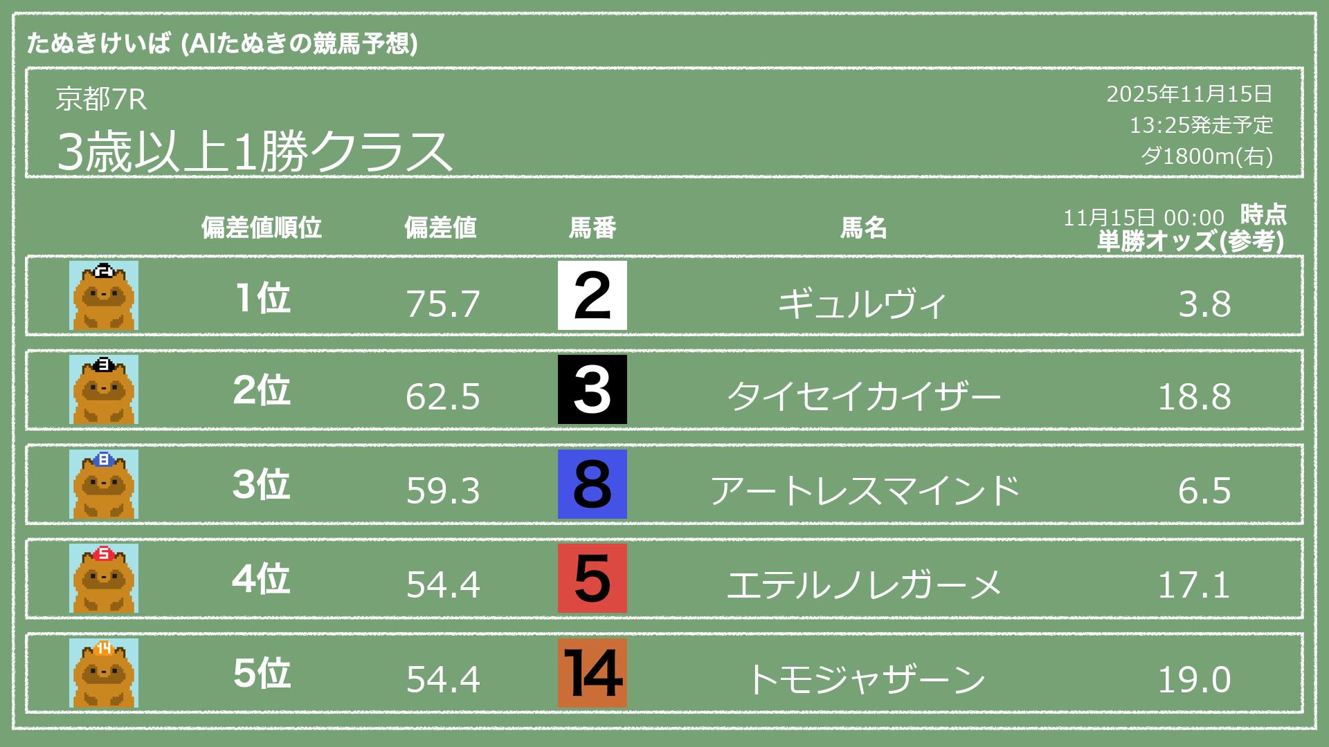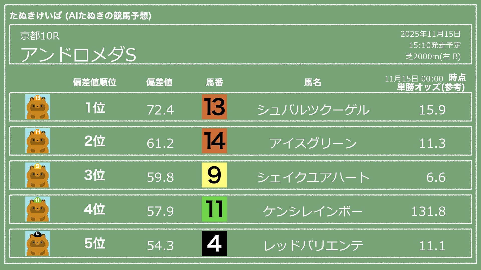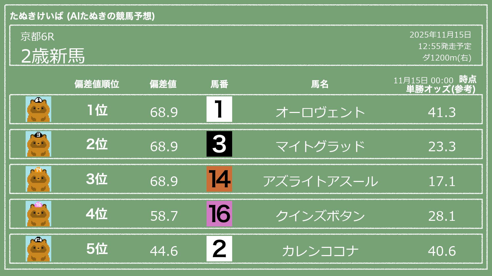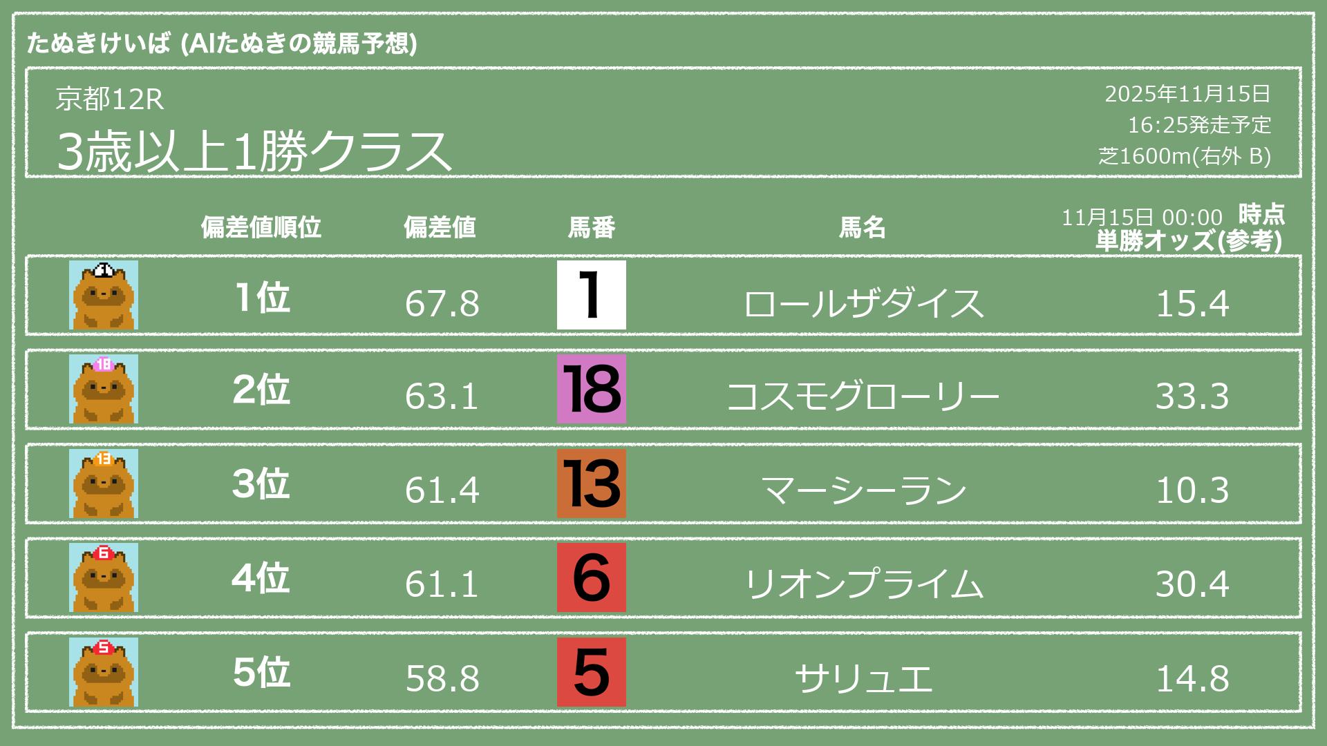 | 枠番 | 馬番 | 馬名 | 人気(予想時点) | オッズ(予想時点) | 馬券偏差値 | |