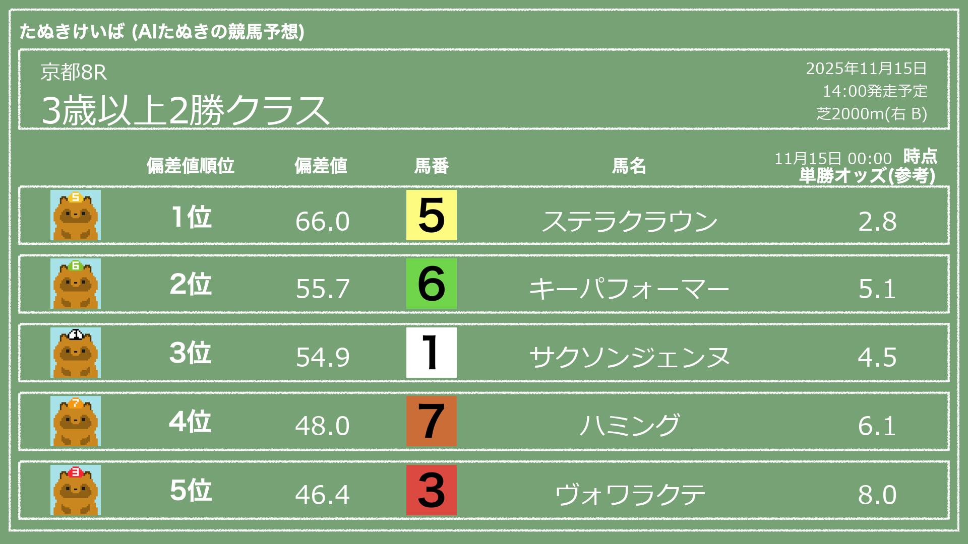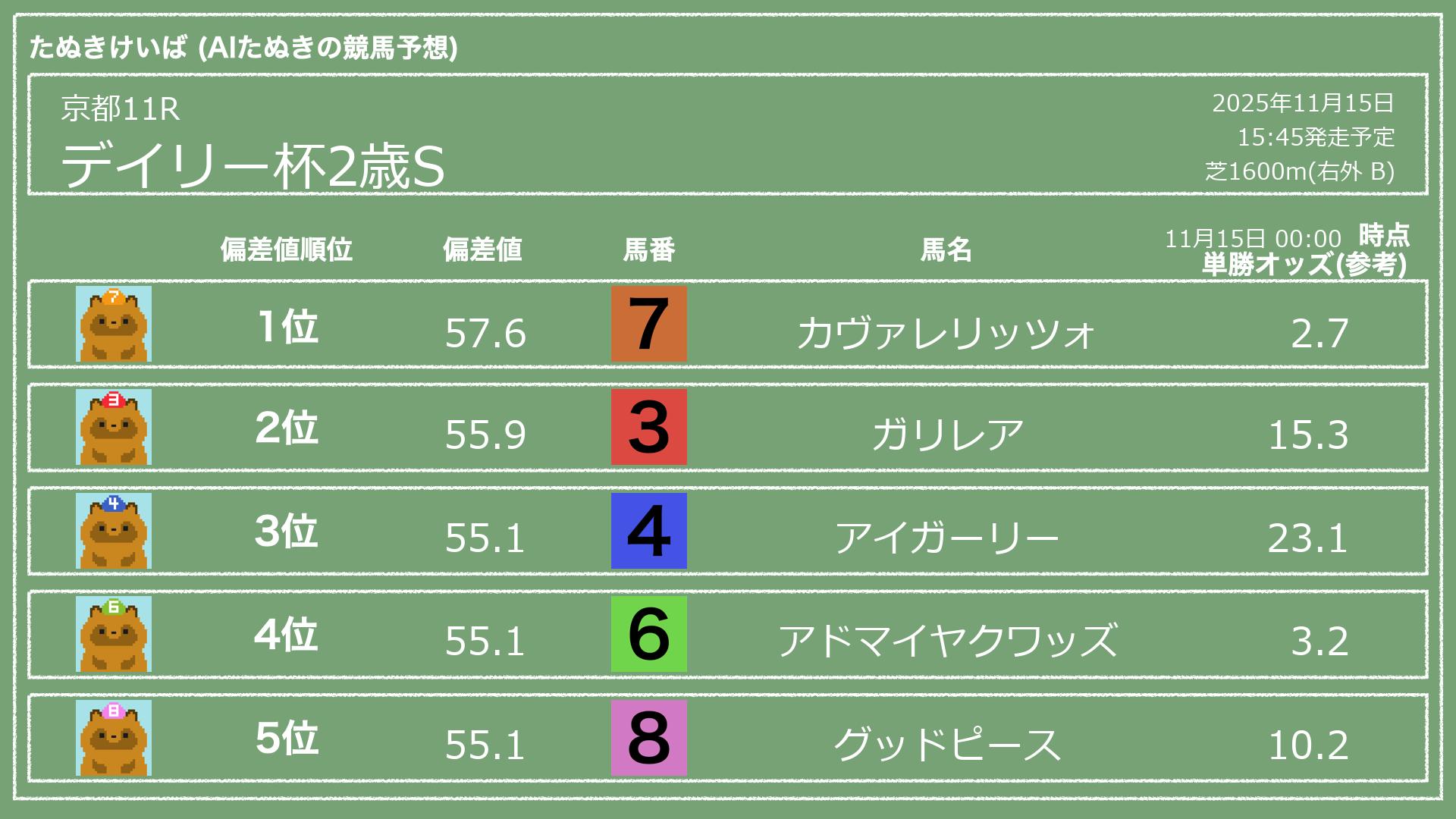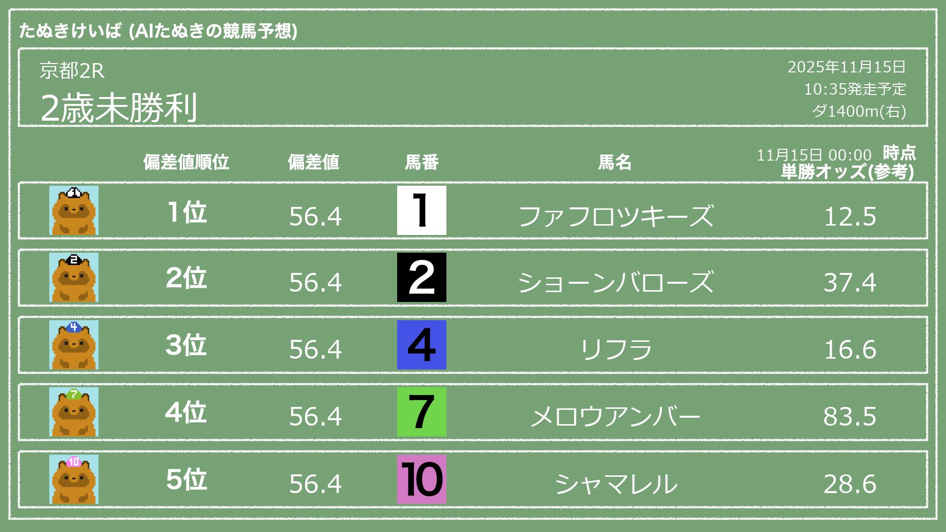 | 枠番 | 馬番 | 馬名 | 人気(予想時点) | オッズ(予想時点) | 馬券偏差値 | |