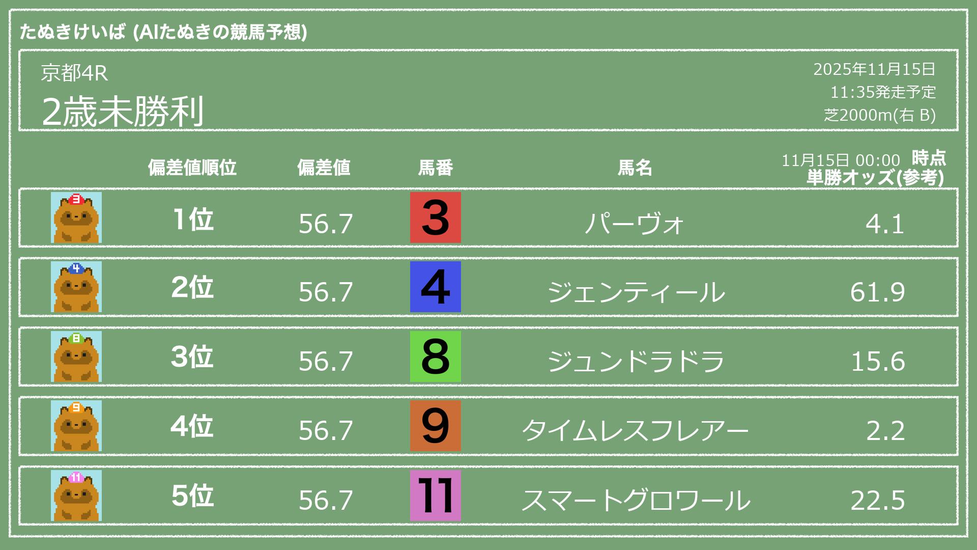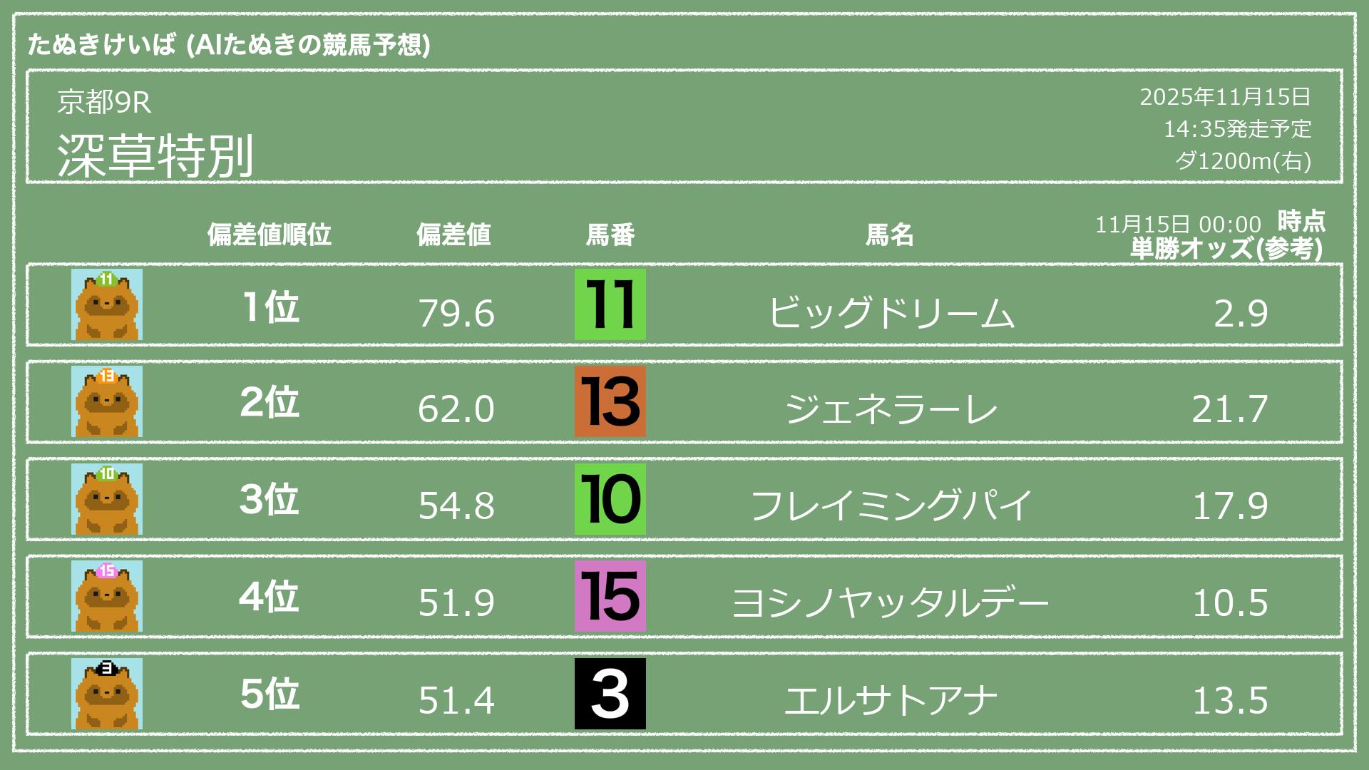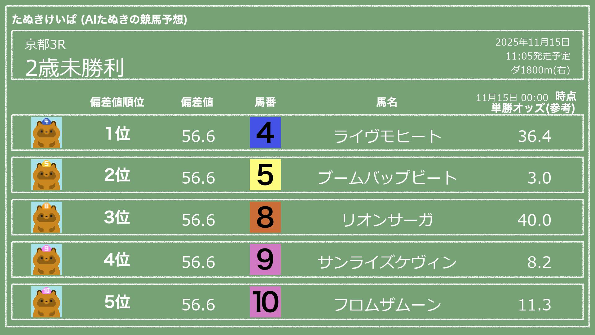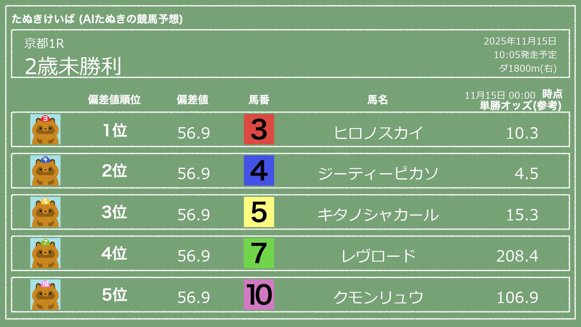 | 枠番 | 馬番 | 馬名 | 人気(予想時点) | オッズ(予想時点) | 馬券偏差値 | |