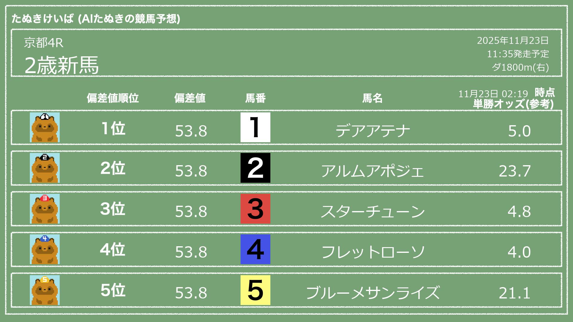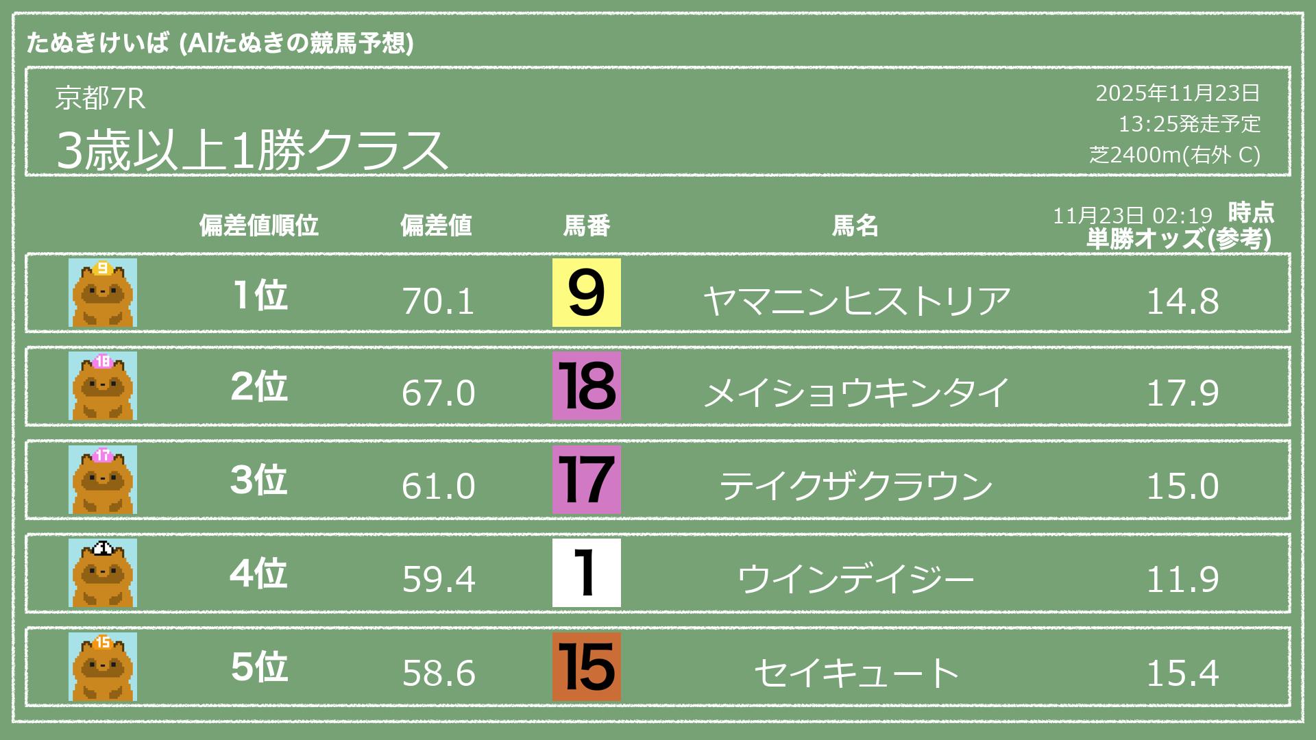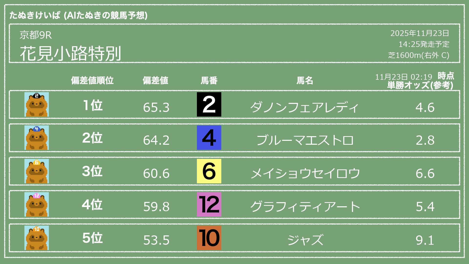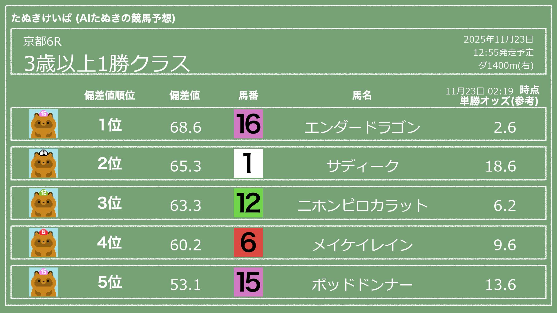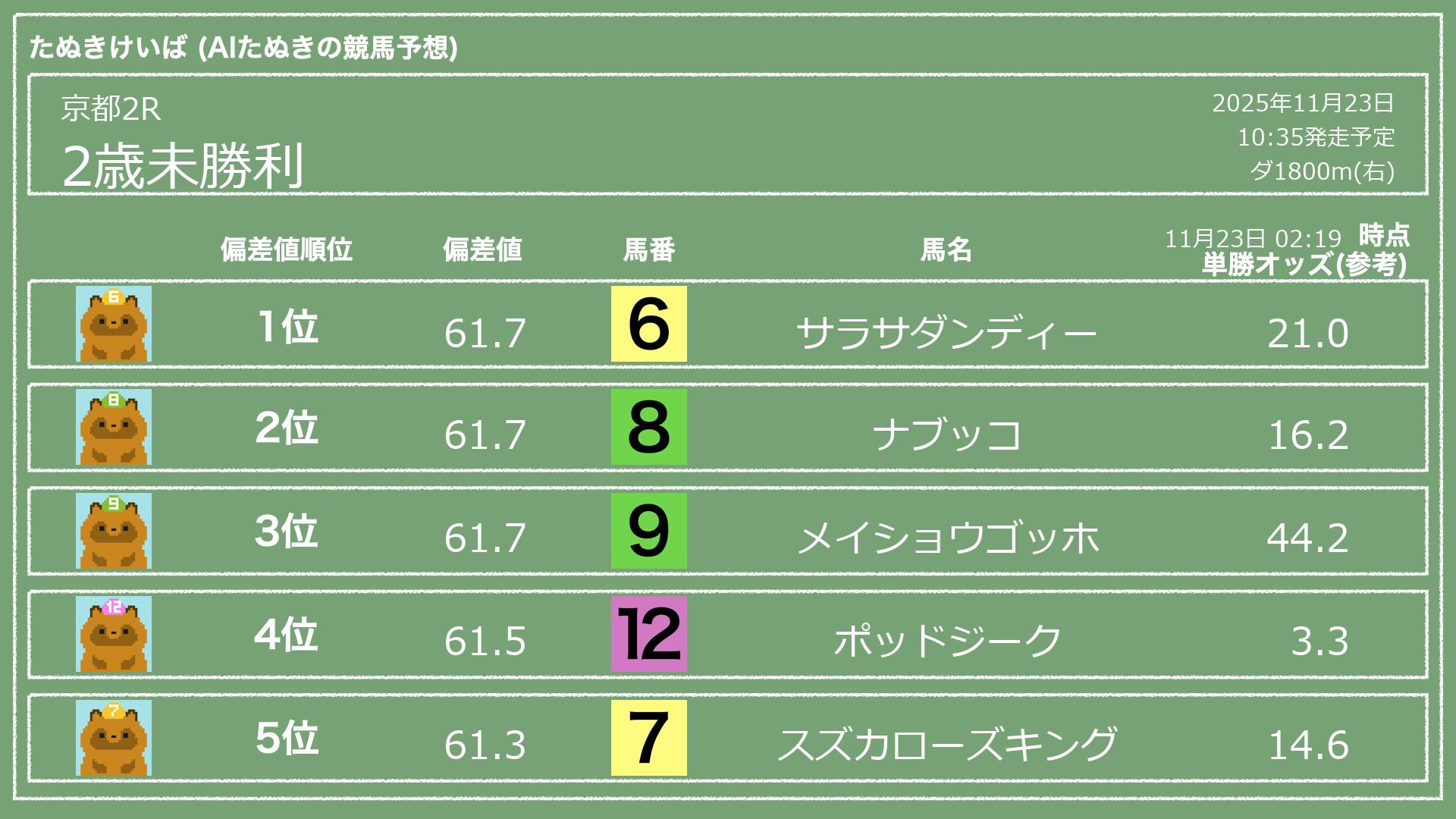 | 枠番 | 馬番 | 馬名 | 人気(予想時点) | オッズ(予想時点) | 馬券偏差値 | |