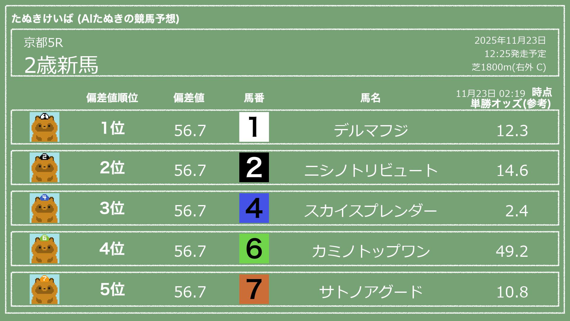| 5 | 7 | 7 | サトノアグード | 5 | 10.8 | 56.7 |