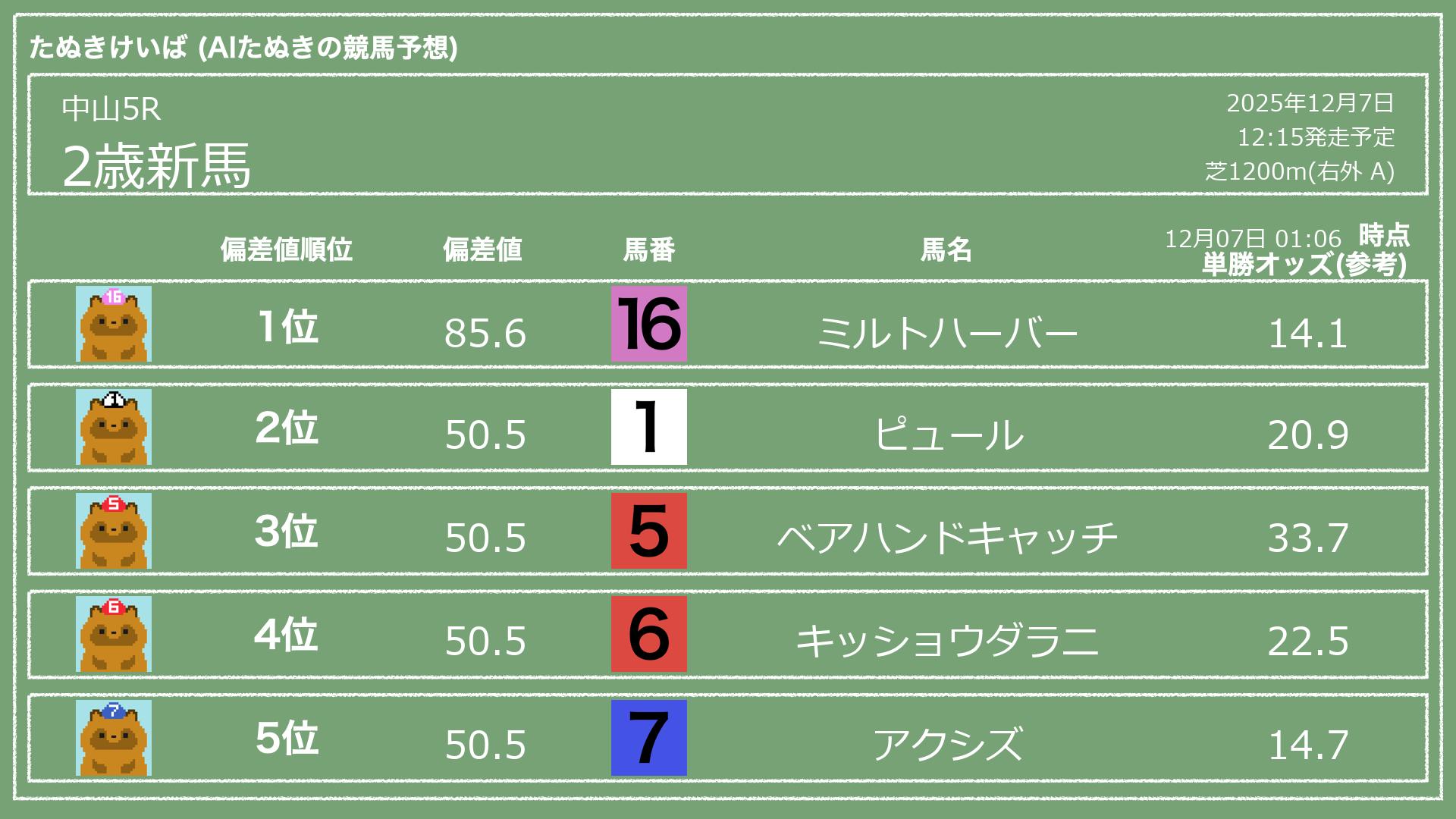 | 1 | 5 | 5 | サトノソティラス | 4 | 8.2 | 64.2 |