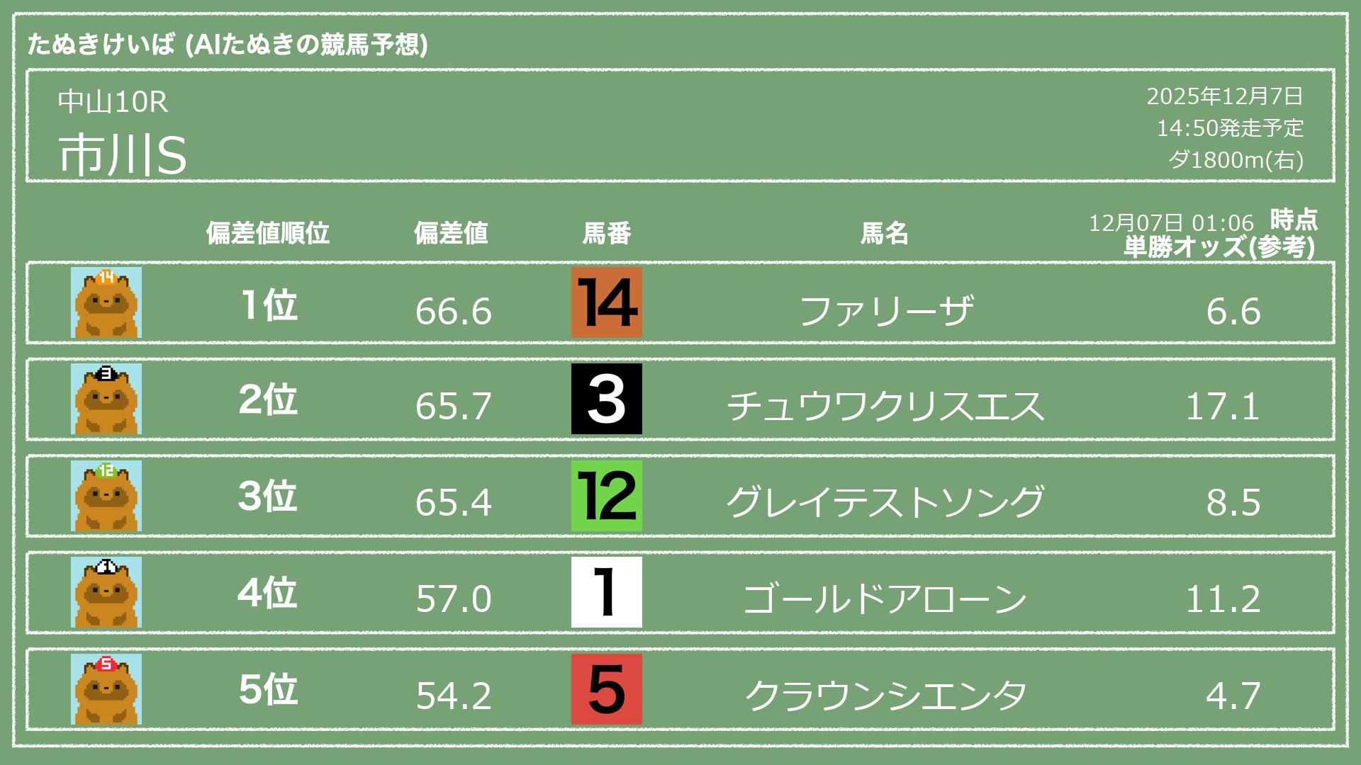 | 枠番 | 馬番 | 馬名 | 人気(予想時点) | オッズ(予想時点) | 馬券偏差値 | |