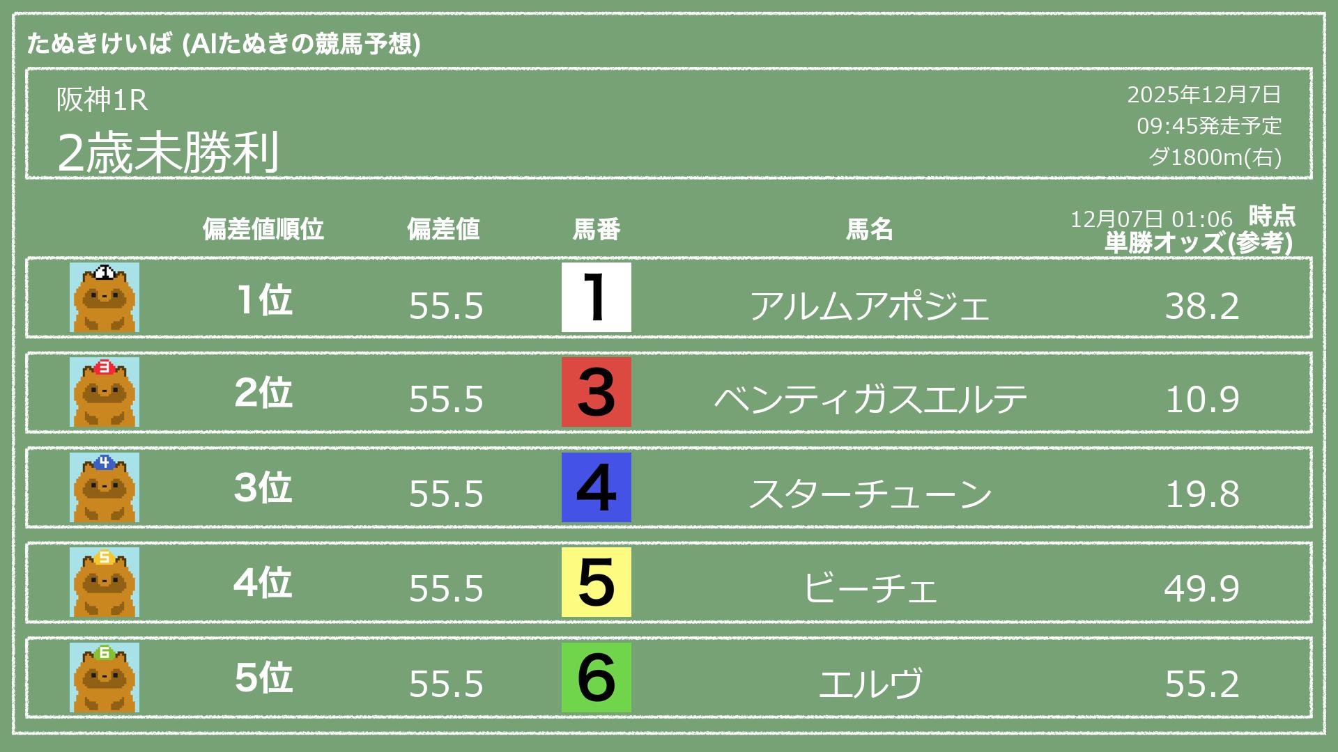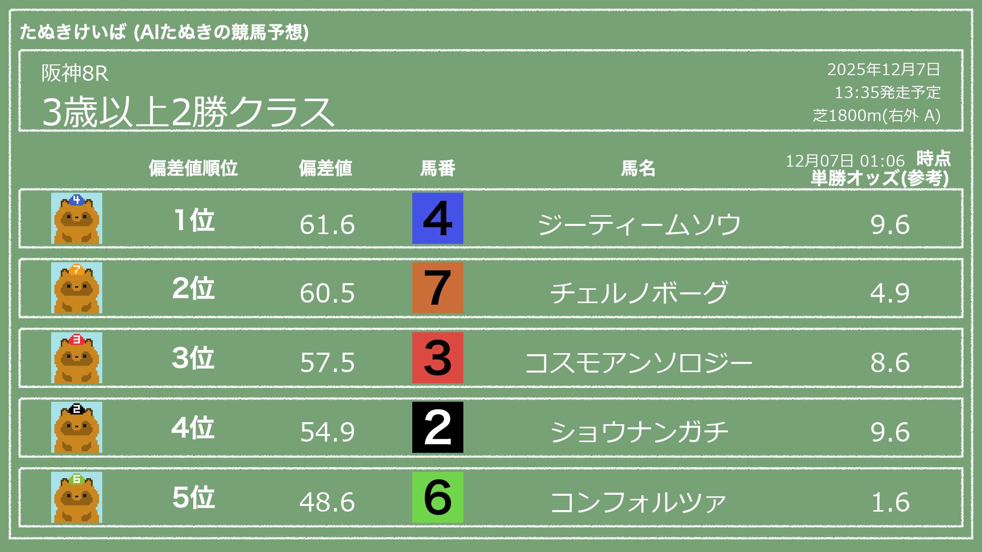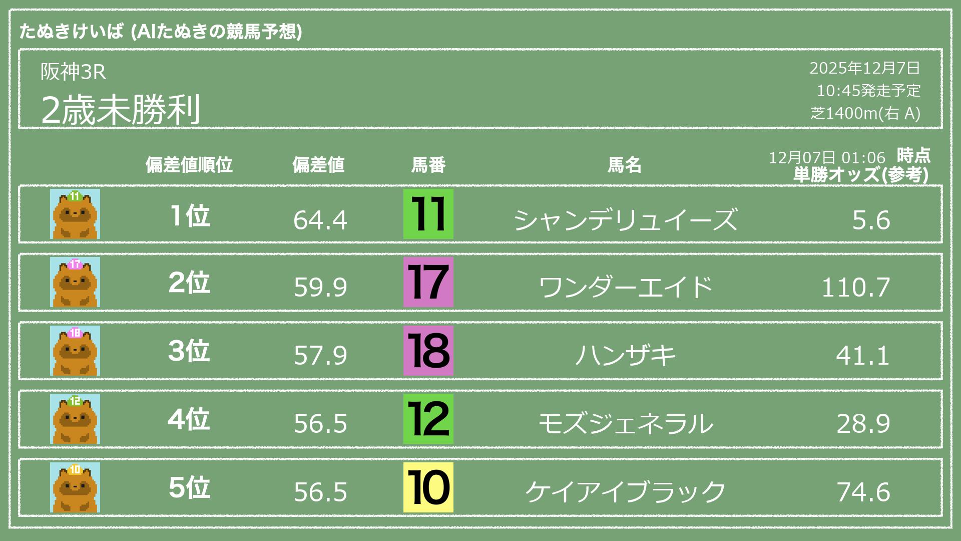 | 枠番 | 馬番 | 馬名 | 人気(予想時点) | オッズ(予想時点) | 馬券偏差値 | |