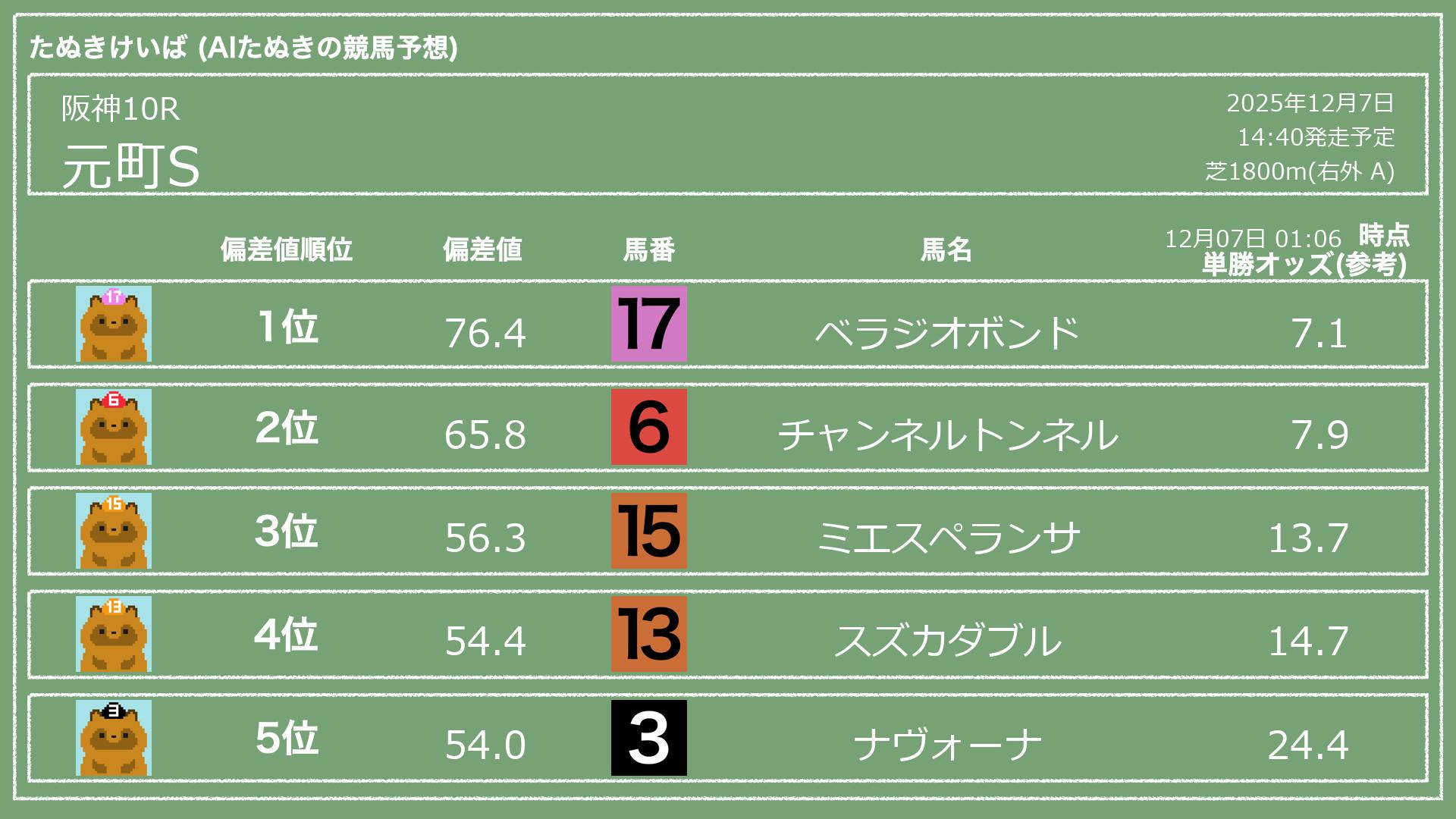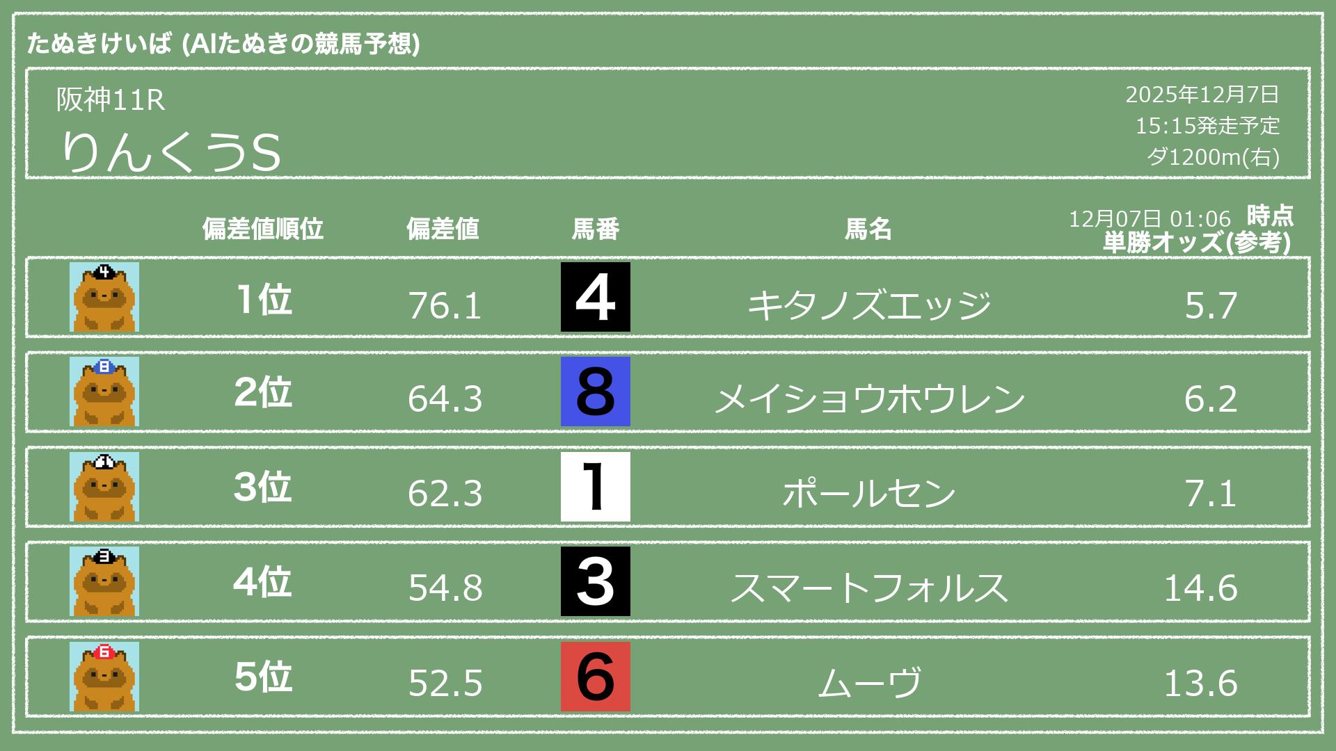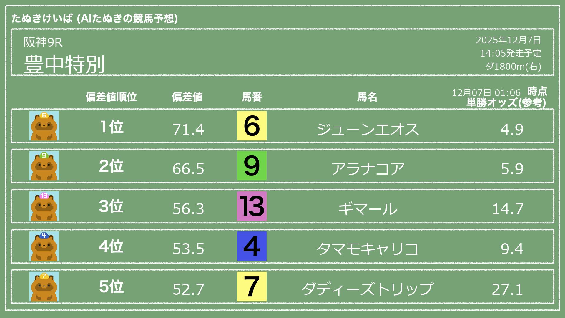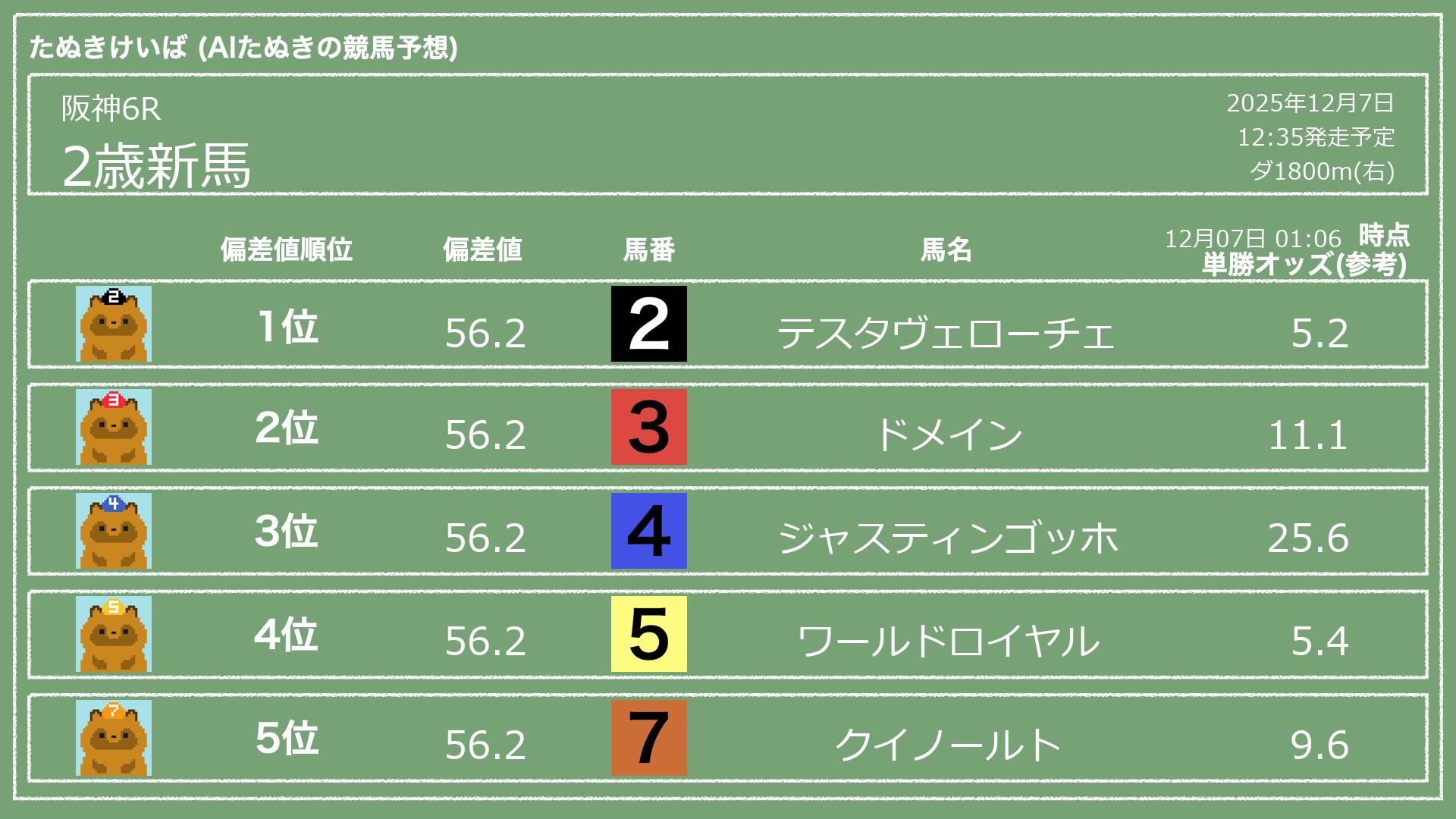 | 枠番 | 馬番 | 馬名 | 人気(予想時点) | オッズ(予想時点) | 馬券偏差値 | |