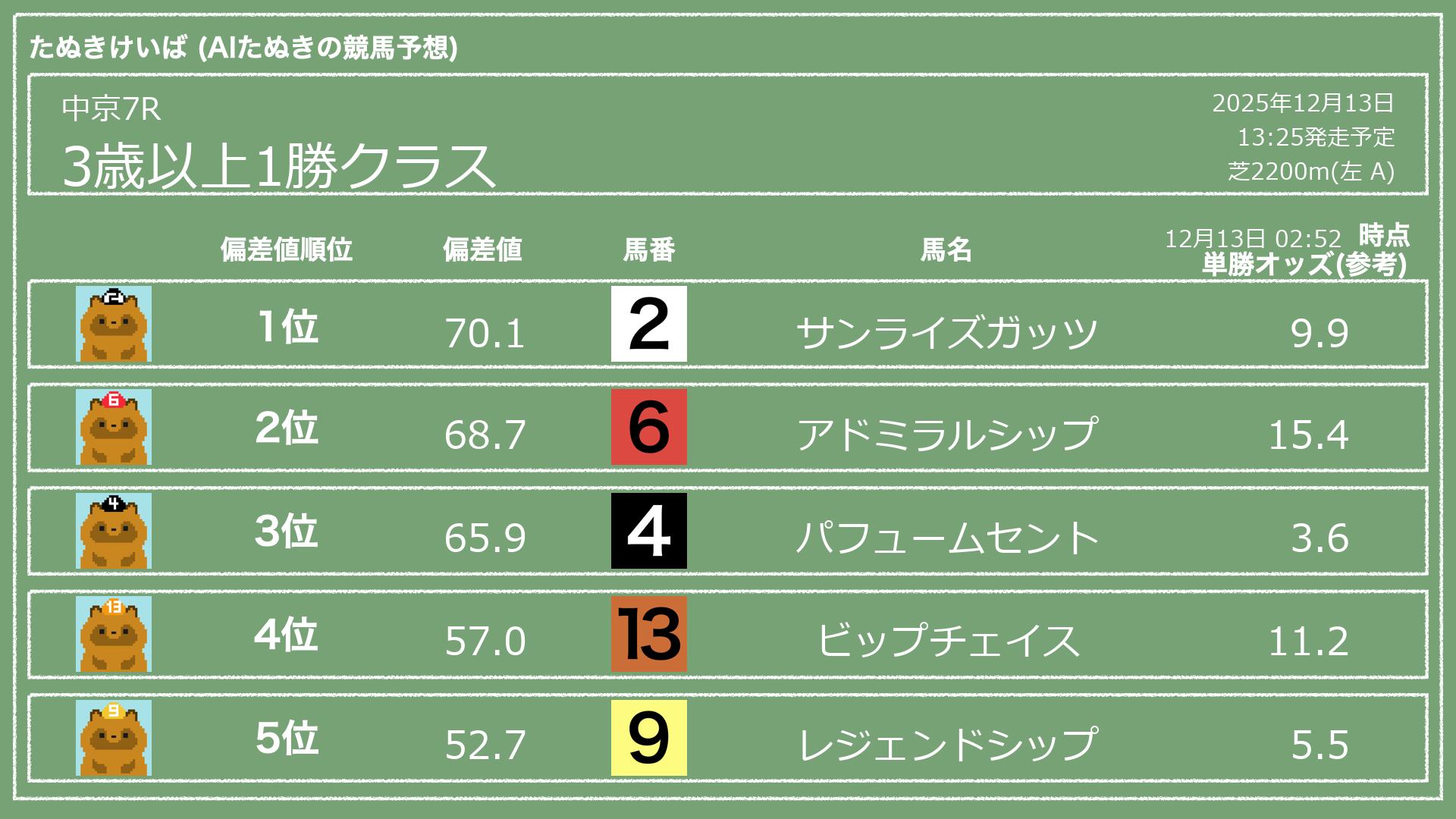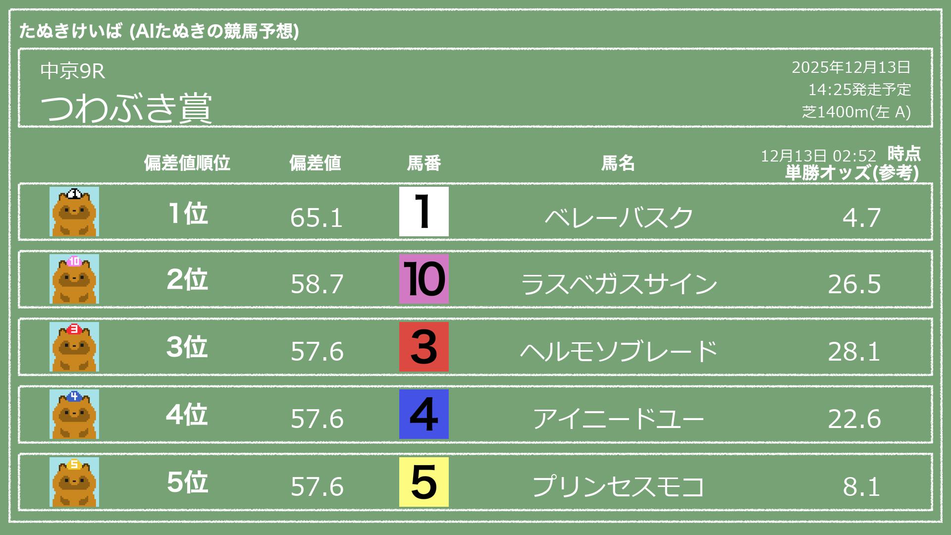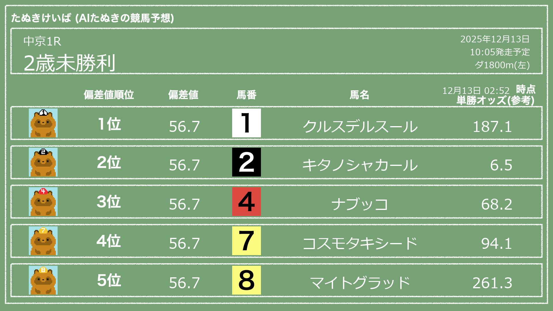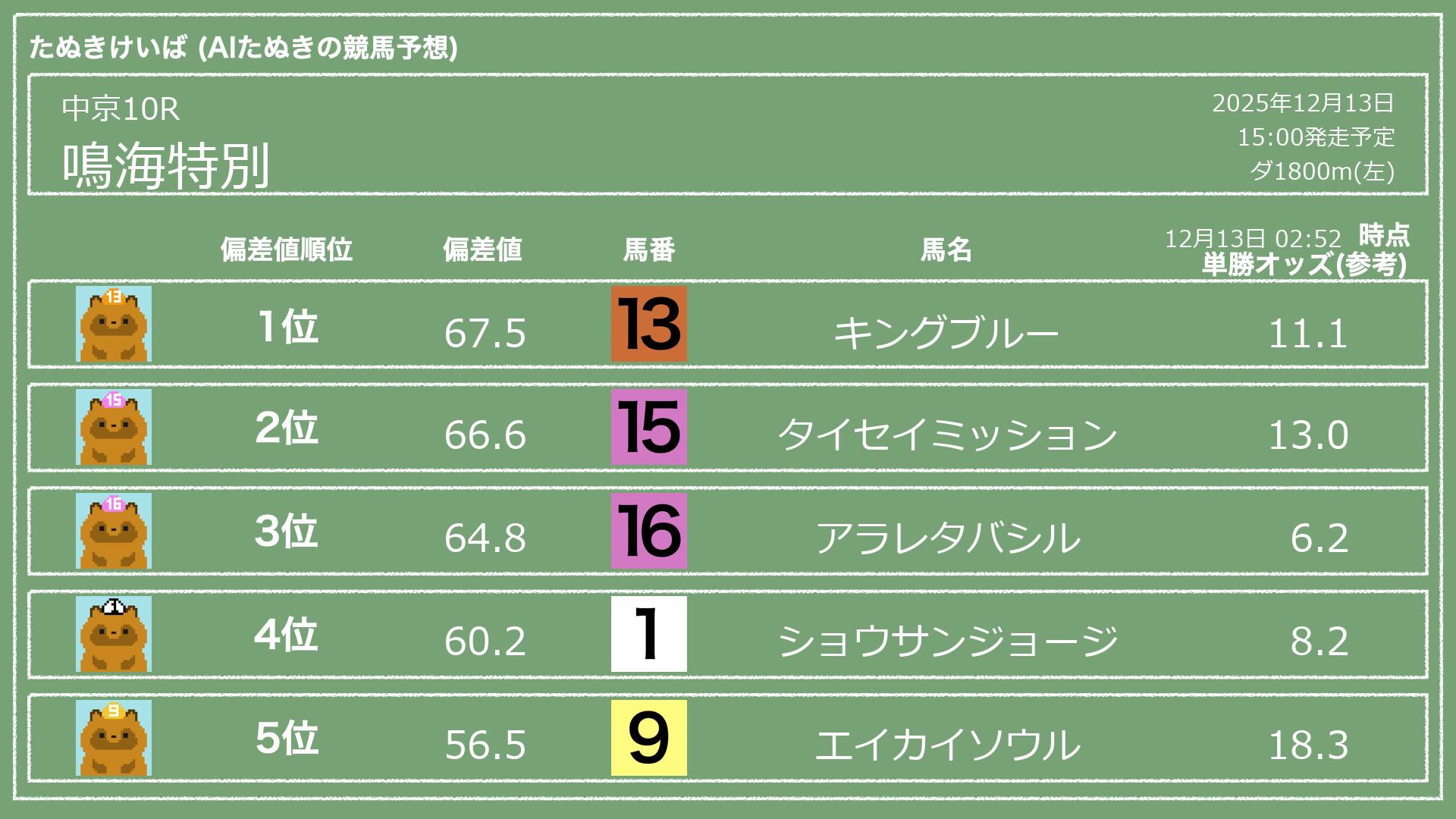 | 枠番 | 馬番 | 馬名 | 人気(予想時点) | オッズ(予想時点) | 馬券偏差値 | |