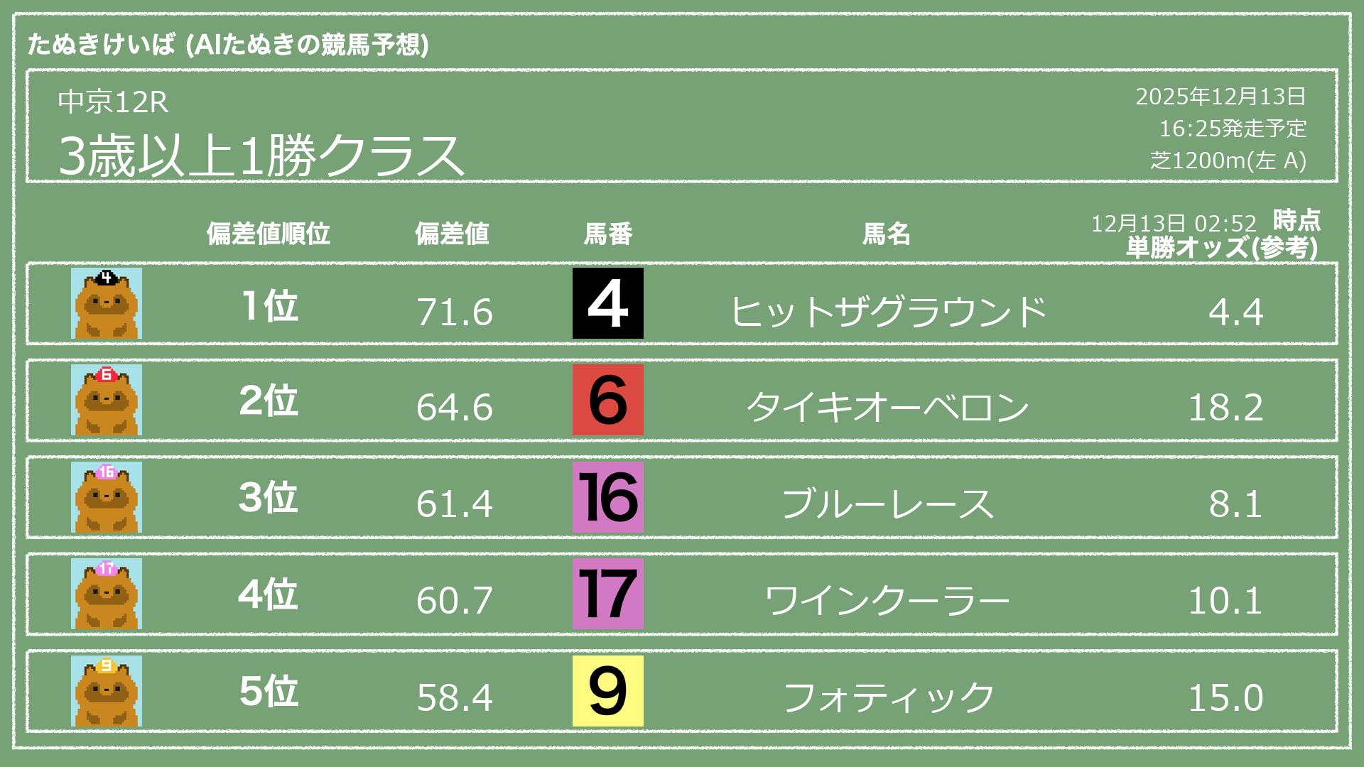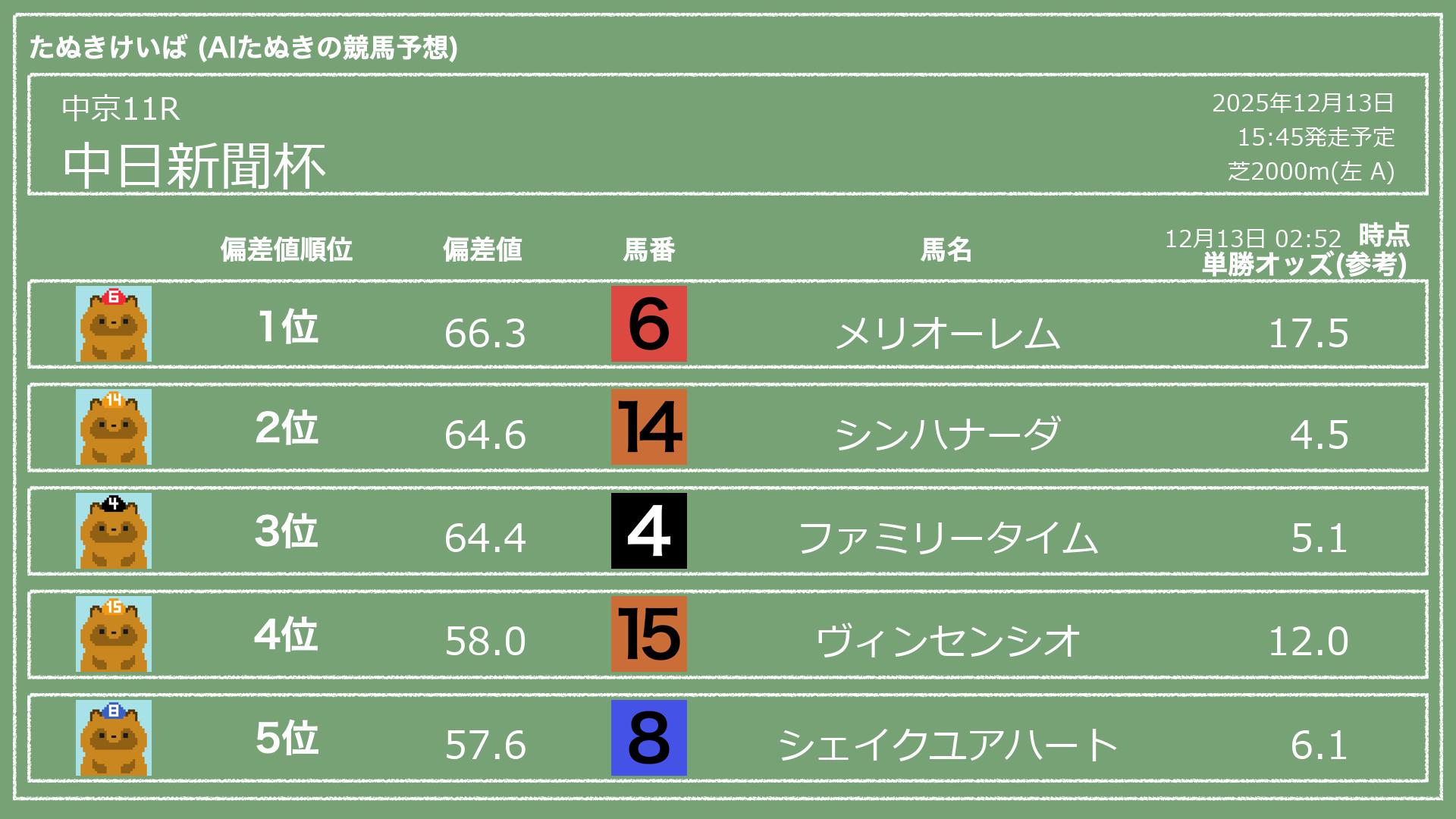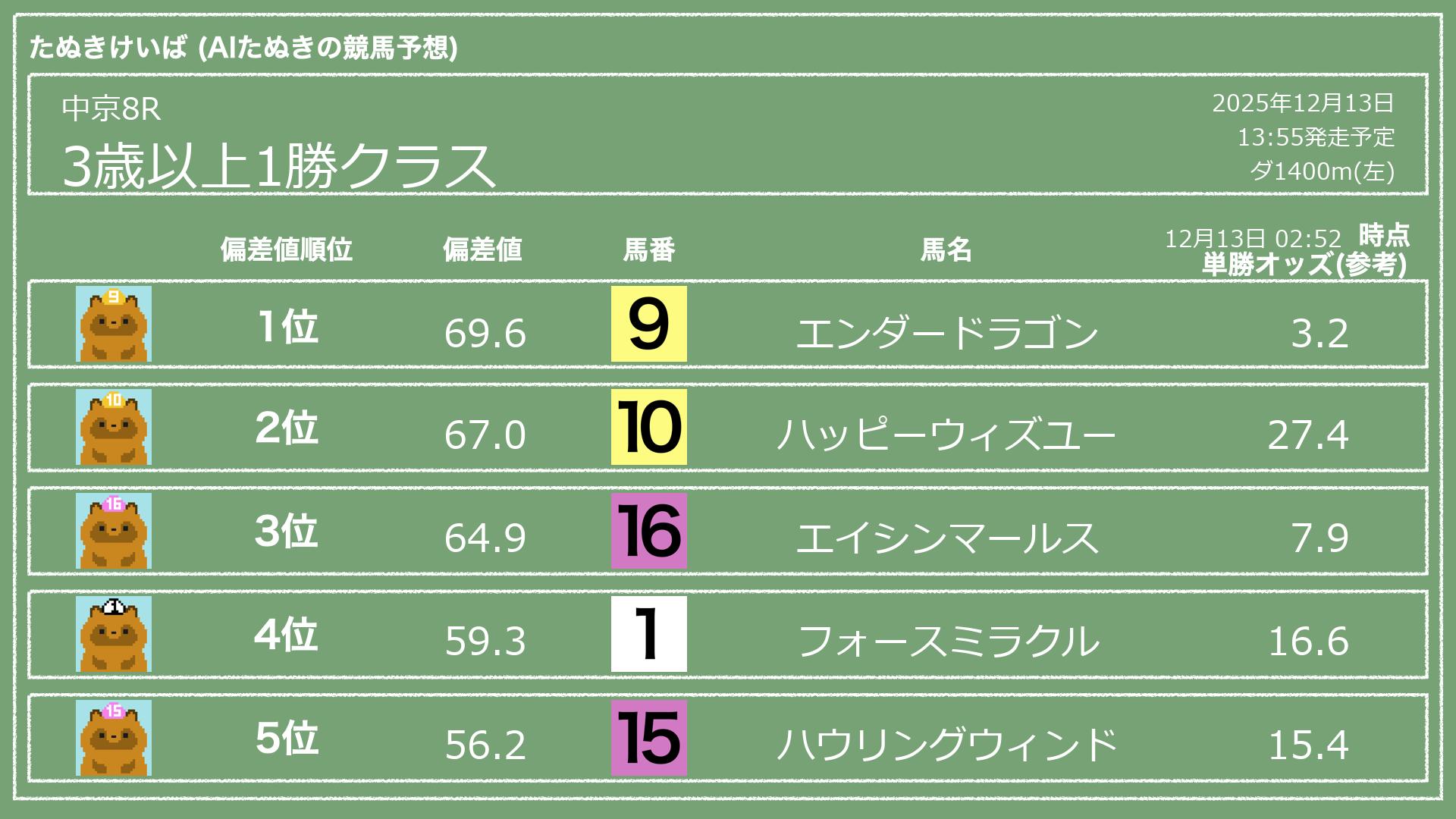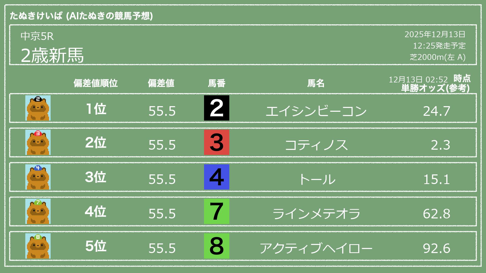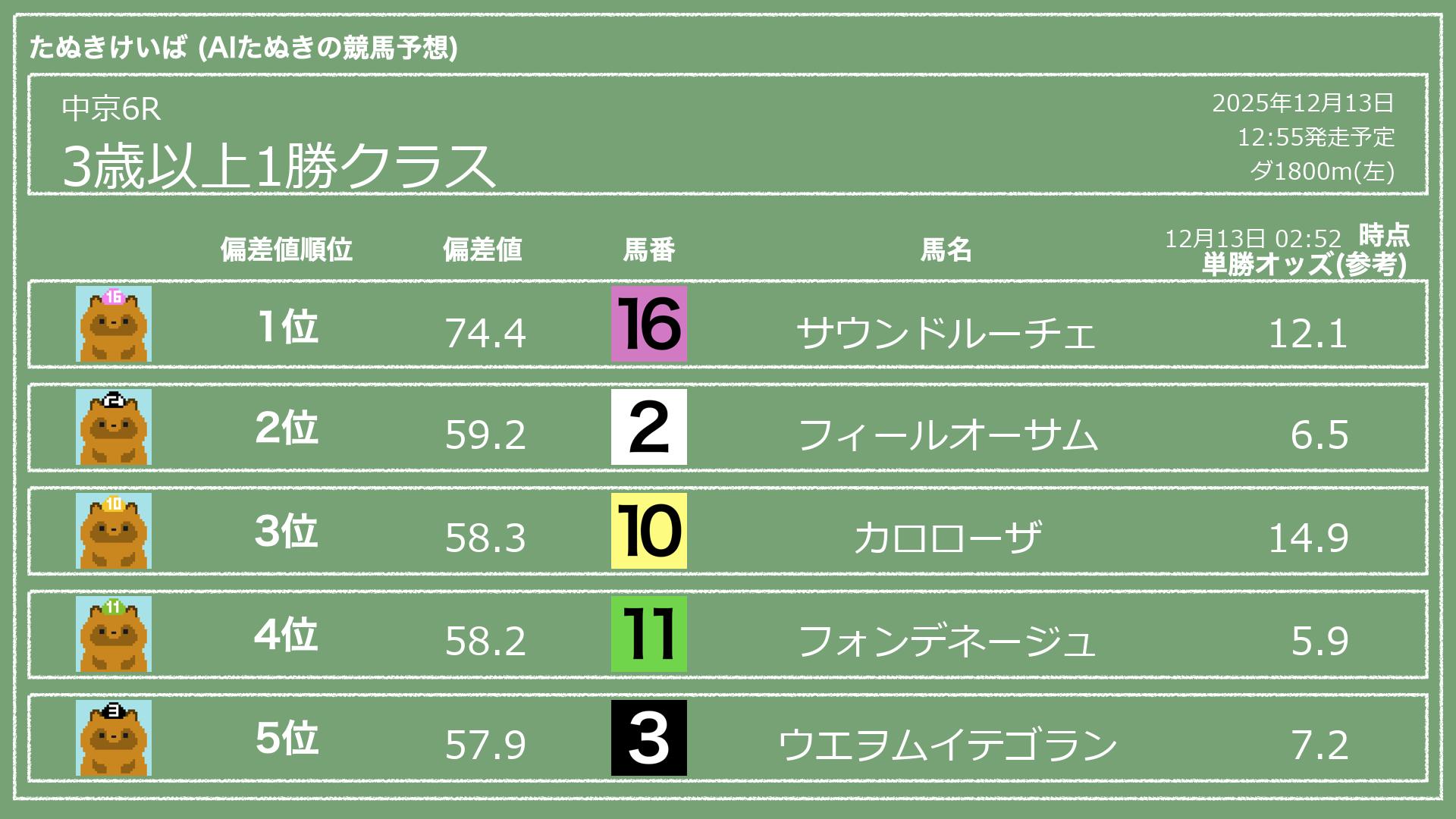 | 枠番 | 馬番 | 馬名 | 人気(予想時点) | オッズ(予想時点) | 馬券偏差値 | |