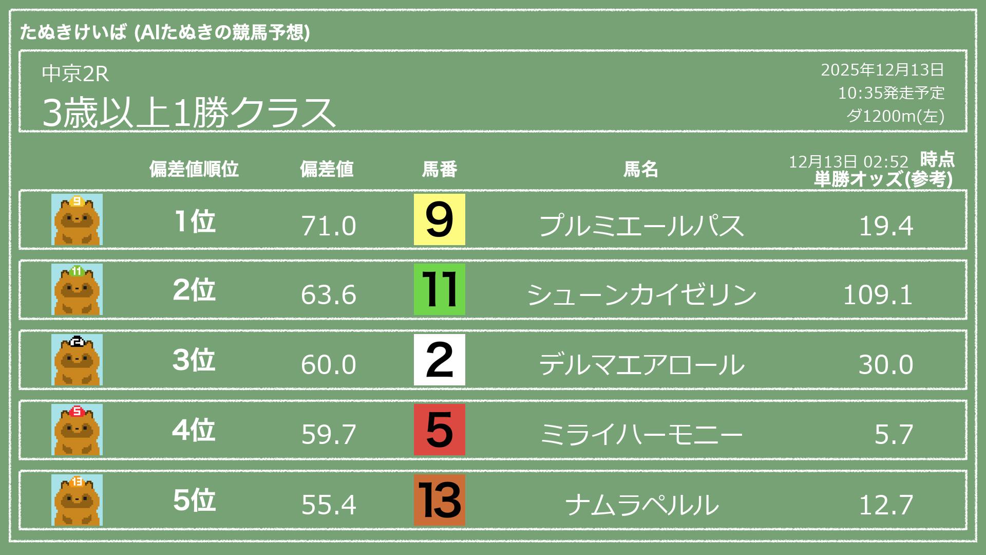| 5 | 7 | 13 | ナムラペルル | 5 | 12.7 | 55.4 |