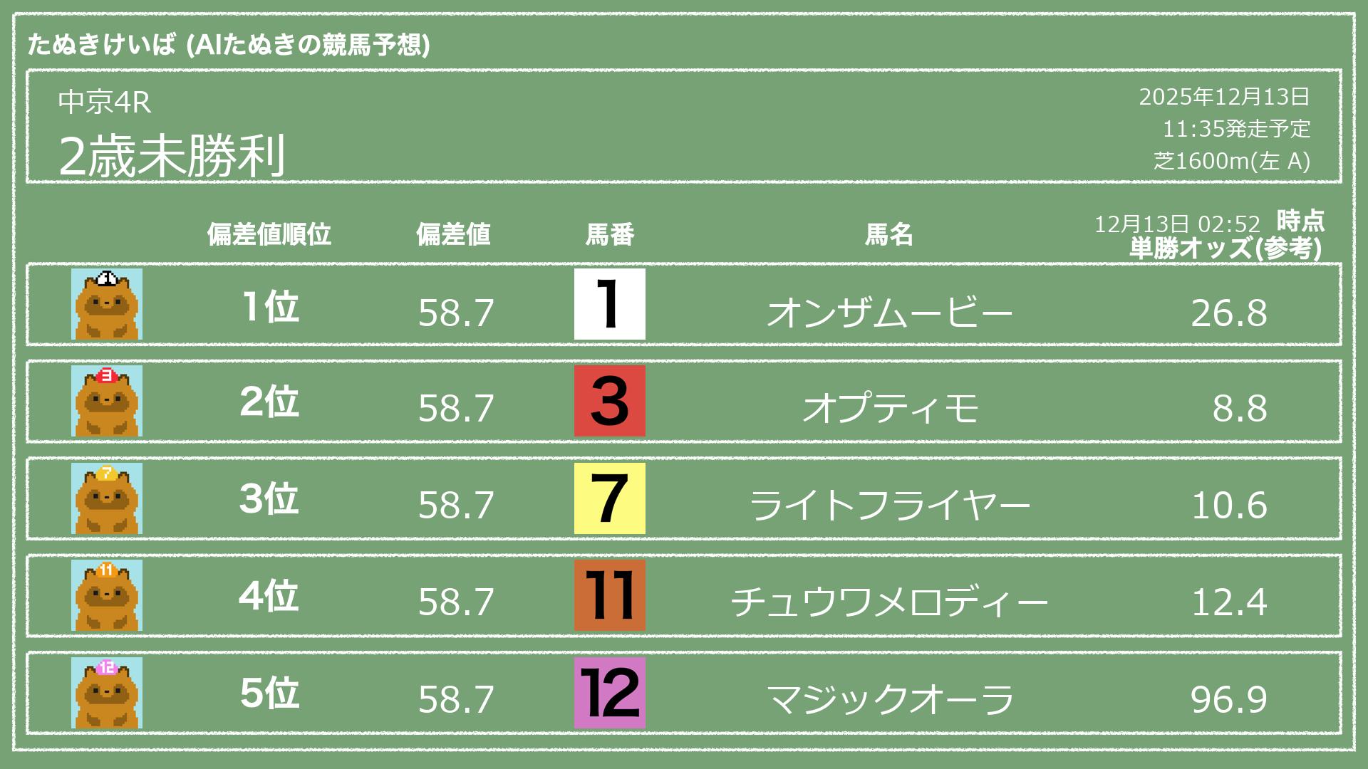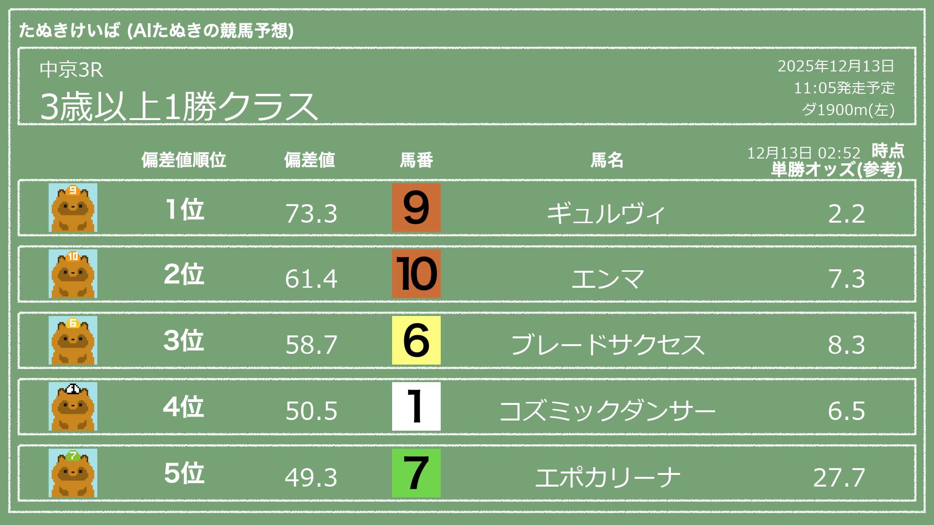 | 13 | 3 | 5 | オニャンコポン | 10 | 18.7 | 43.7 |