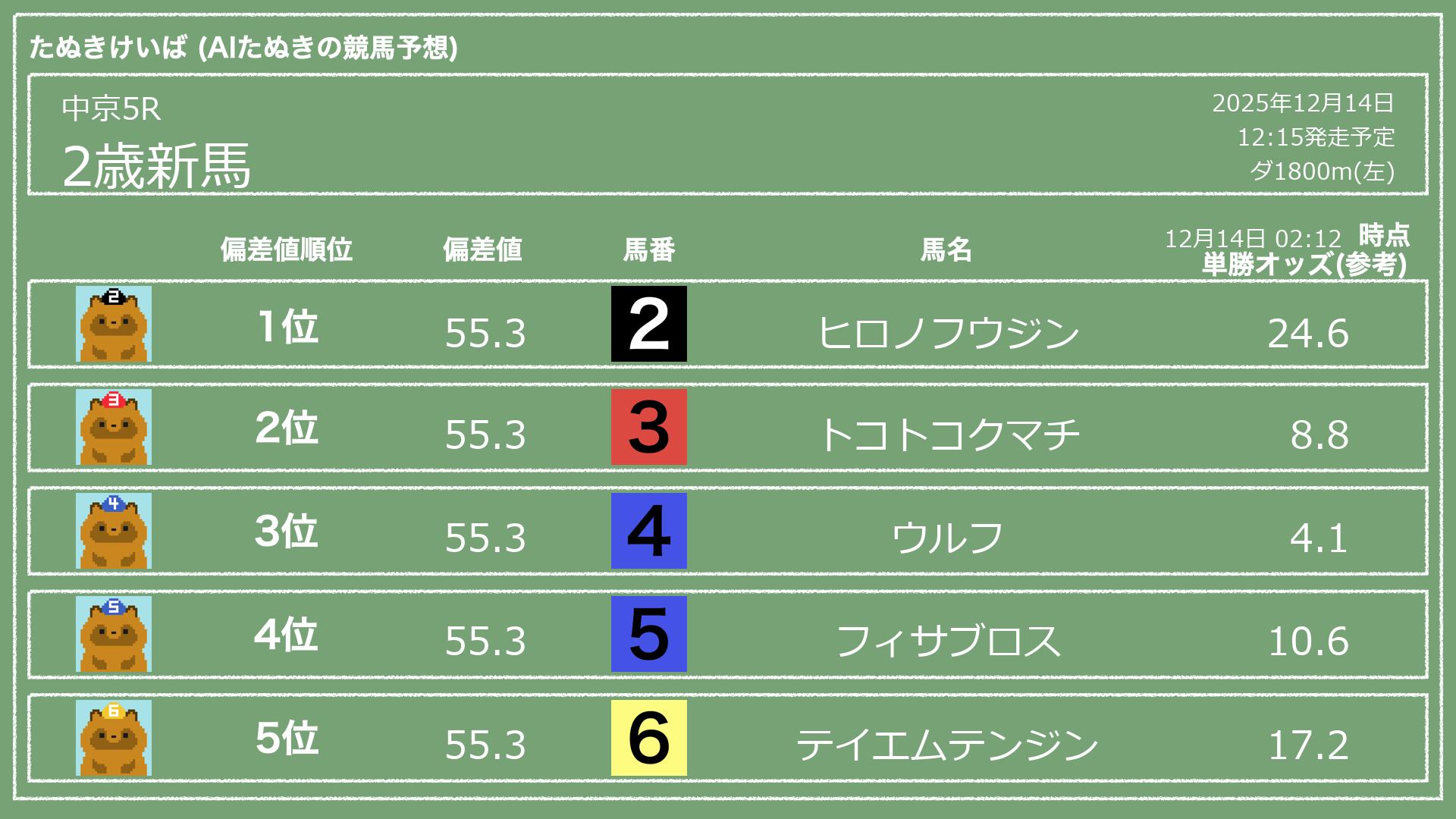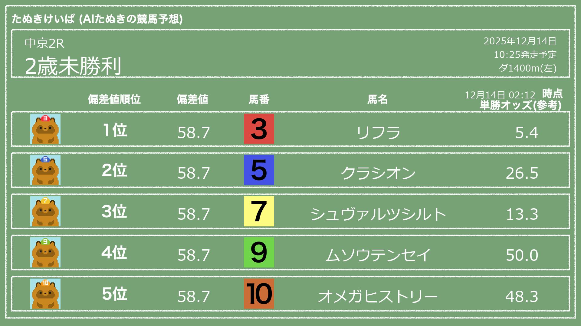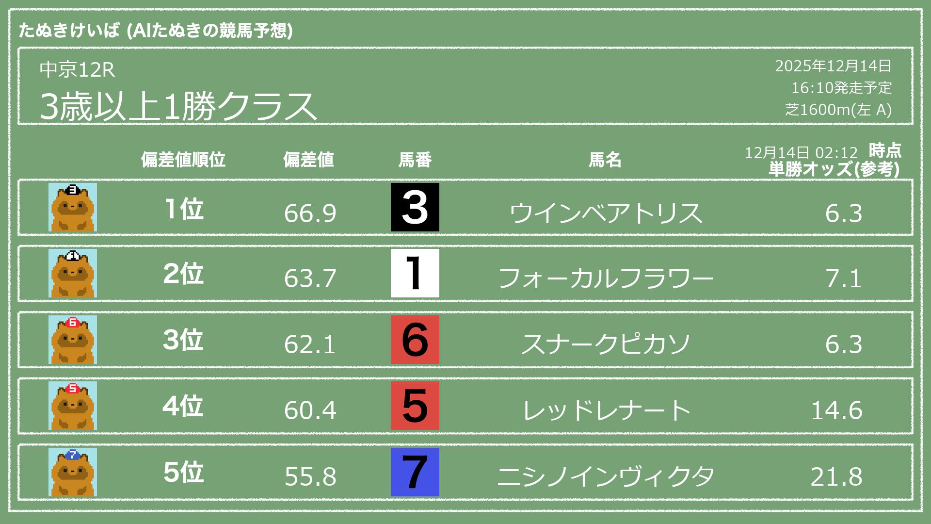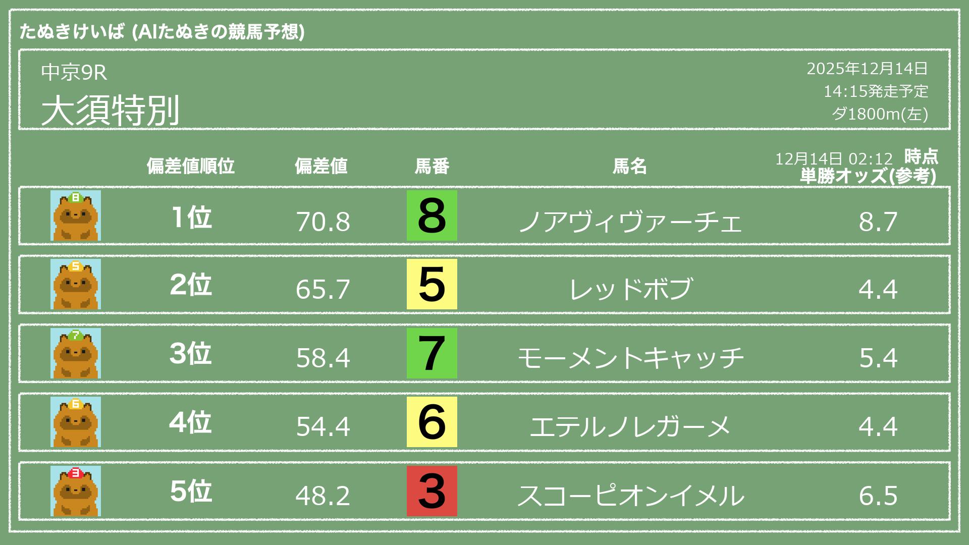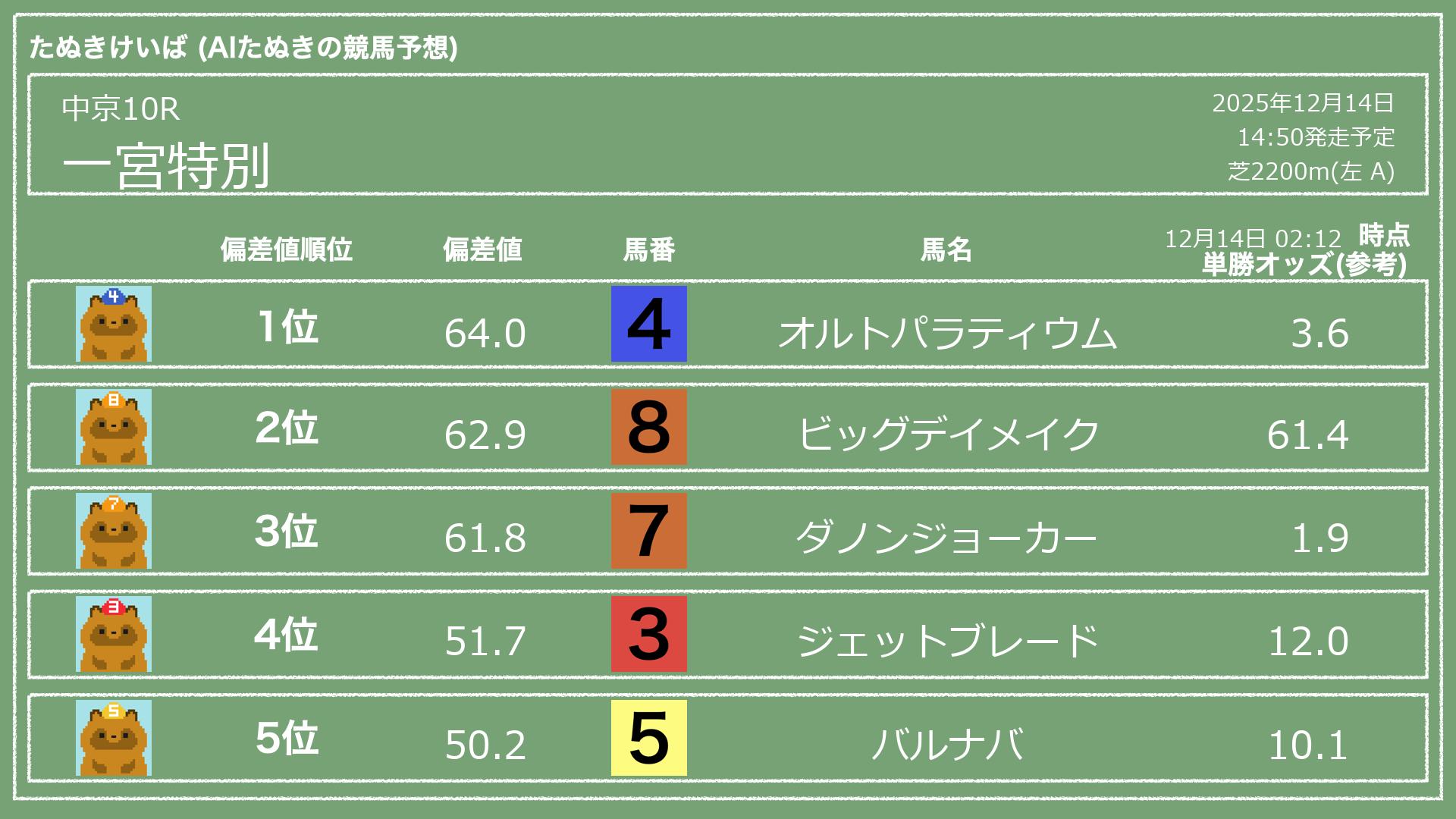 | 枠番 | 馬番 | 馬名 | 人気(予想時点) | オッズ(予想時点) | 馬券偏差値 | |