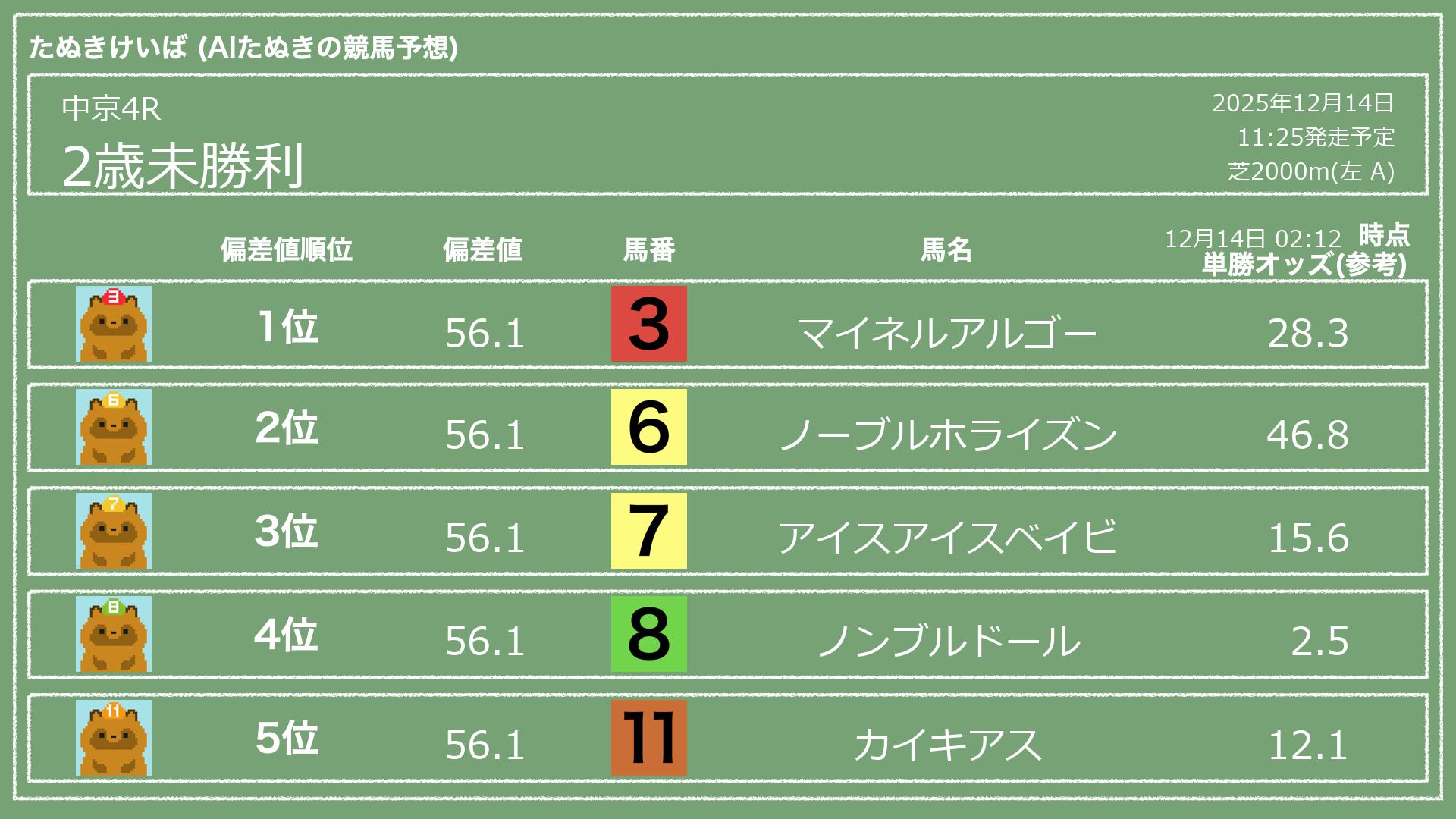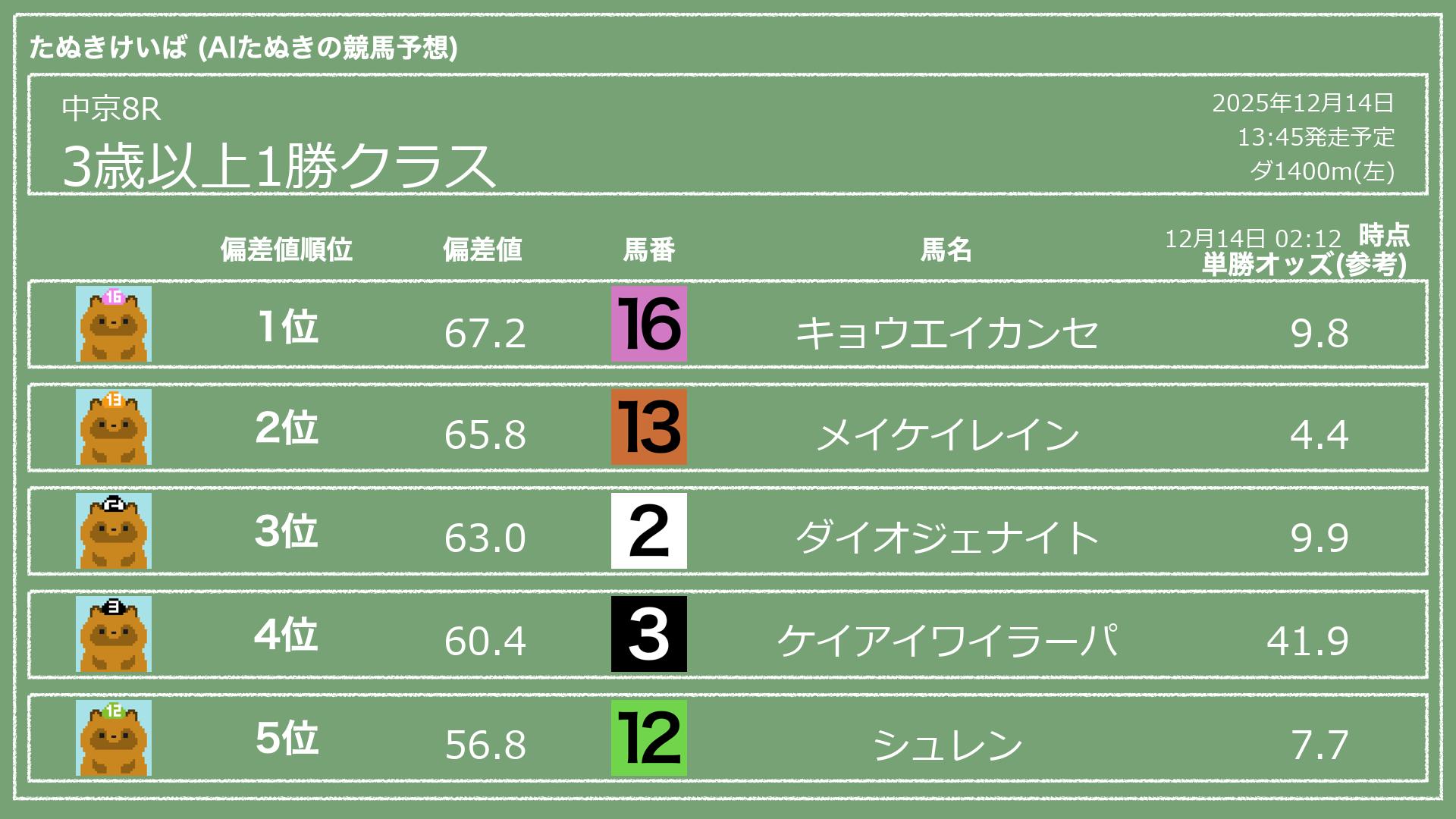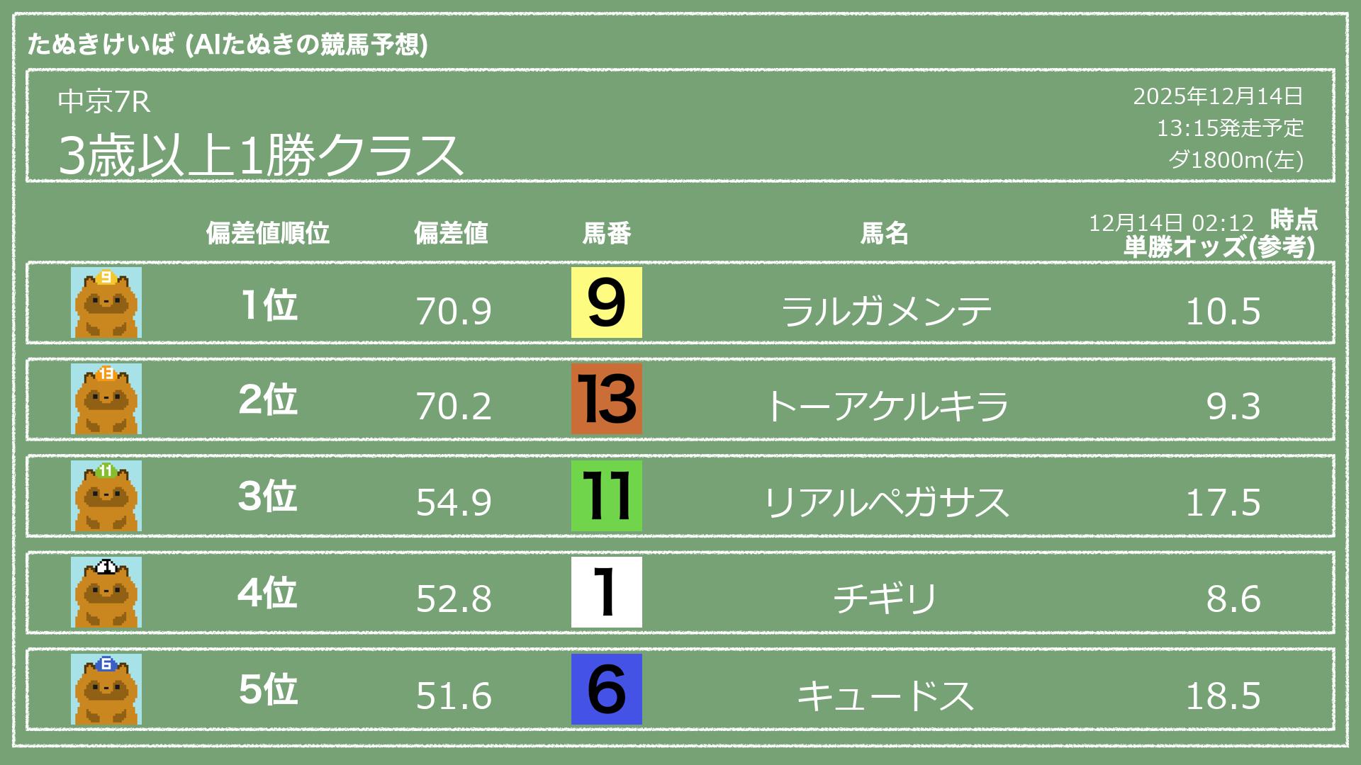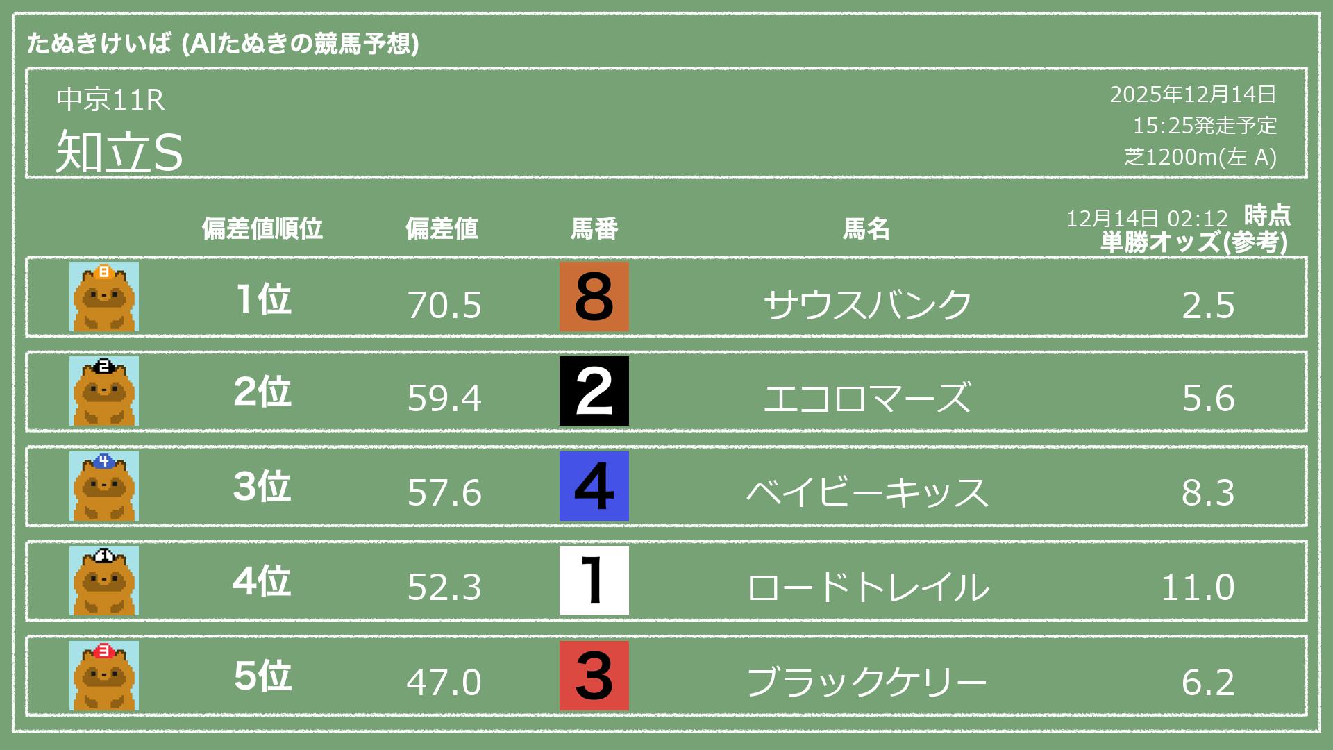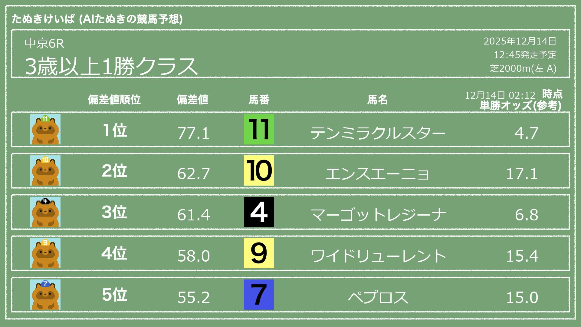 | 枠番 | 馬番 | 馬名 | 人気(予想時点) | オッズ(予想時点) | 馬券偏差値 | |