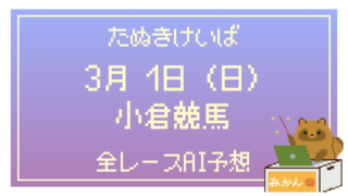予想 【全レース無料】2026年3月1日(日) 小倉競馬のAI予想 「たぬきけいば」による無料競馬予想です🥳参考にしていただけると嬉しいです! 当たりますように😆 小倉1R 3歳未勝利たぬ... 2026.03.01 予想前日予想小倉競馬