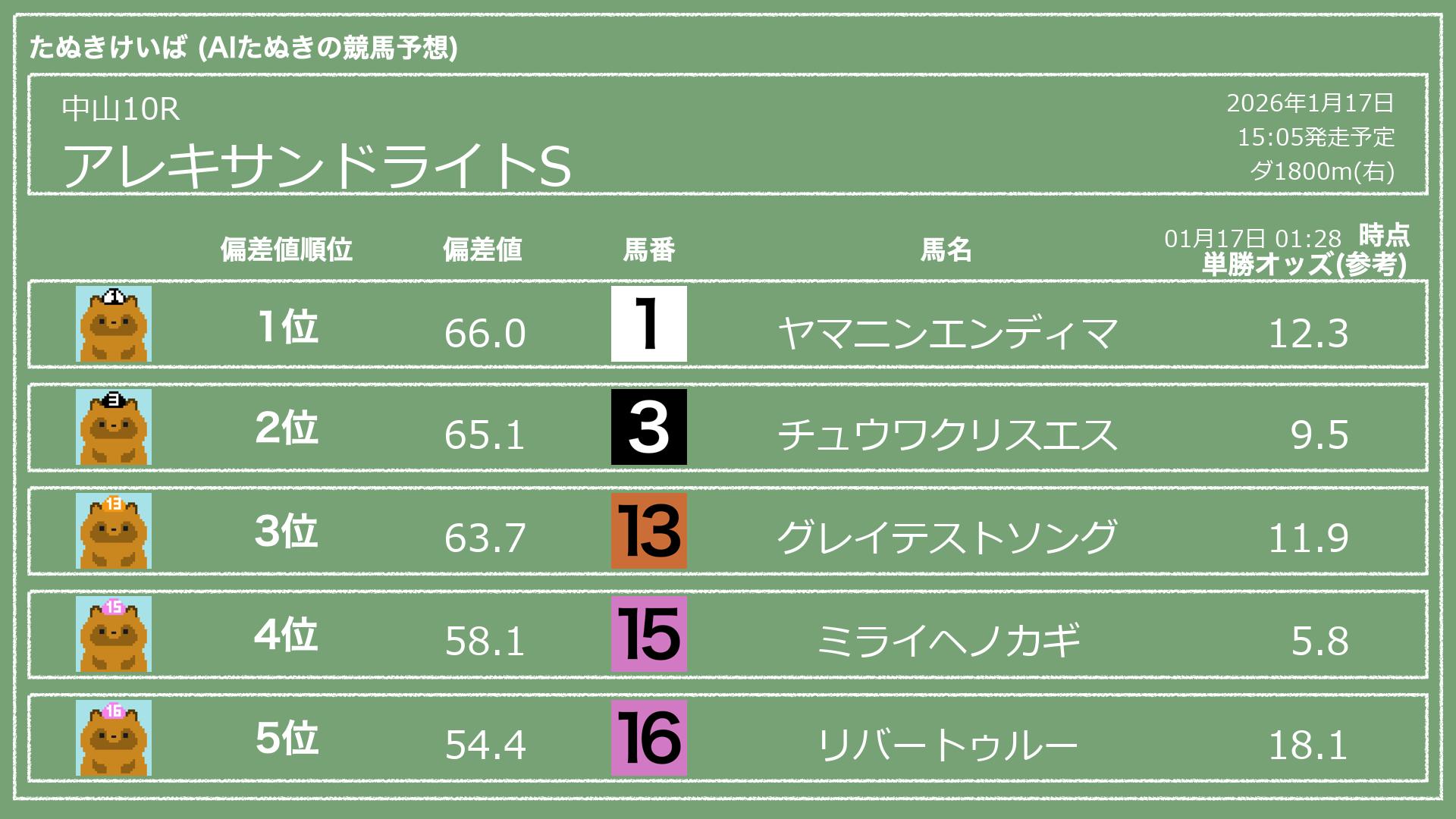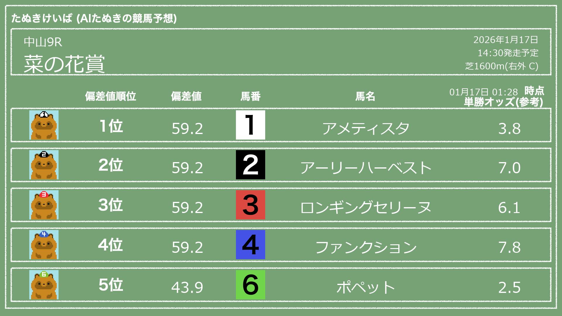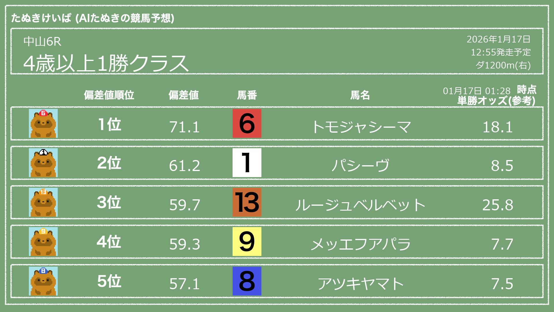 | 枠番 | 馬番 | 馬名 | 人気(予想時点) | オッズ(予想時点) | 馬券偏差値 | |