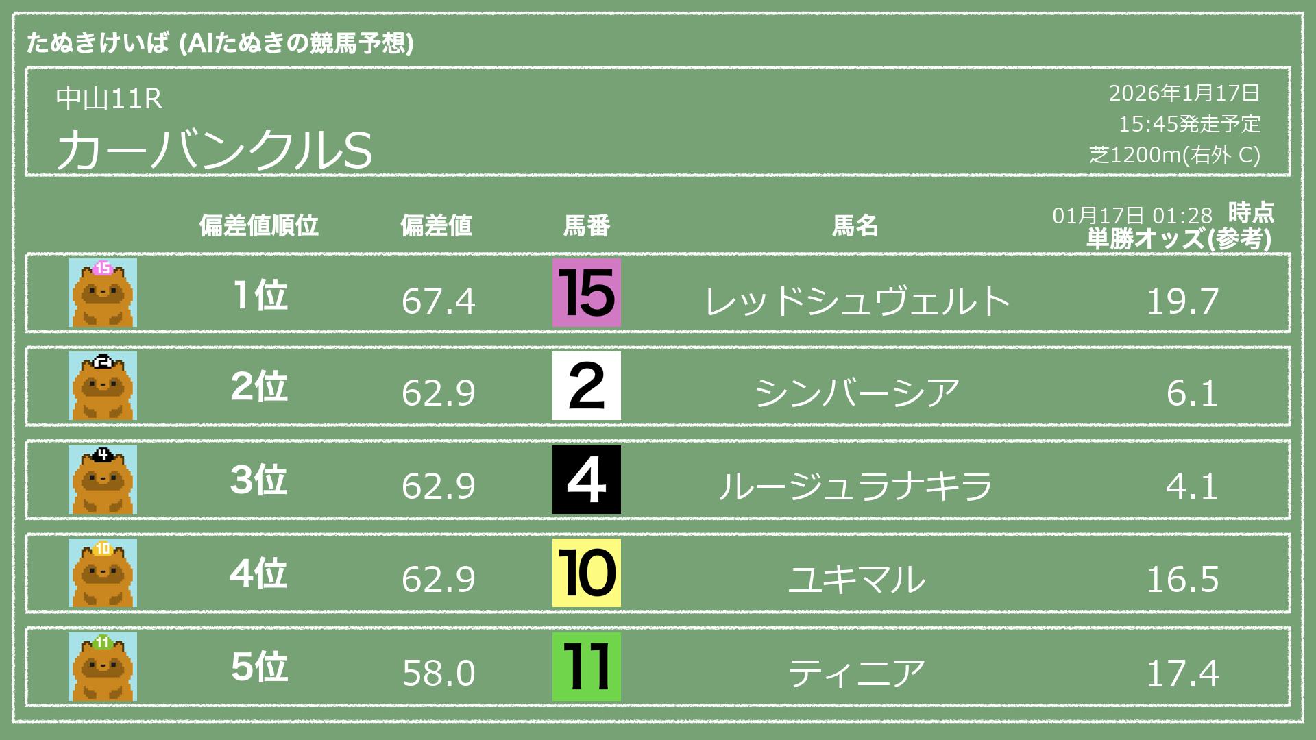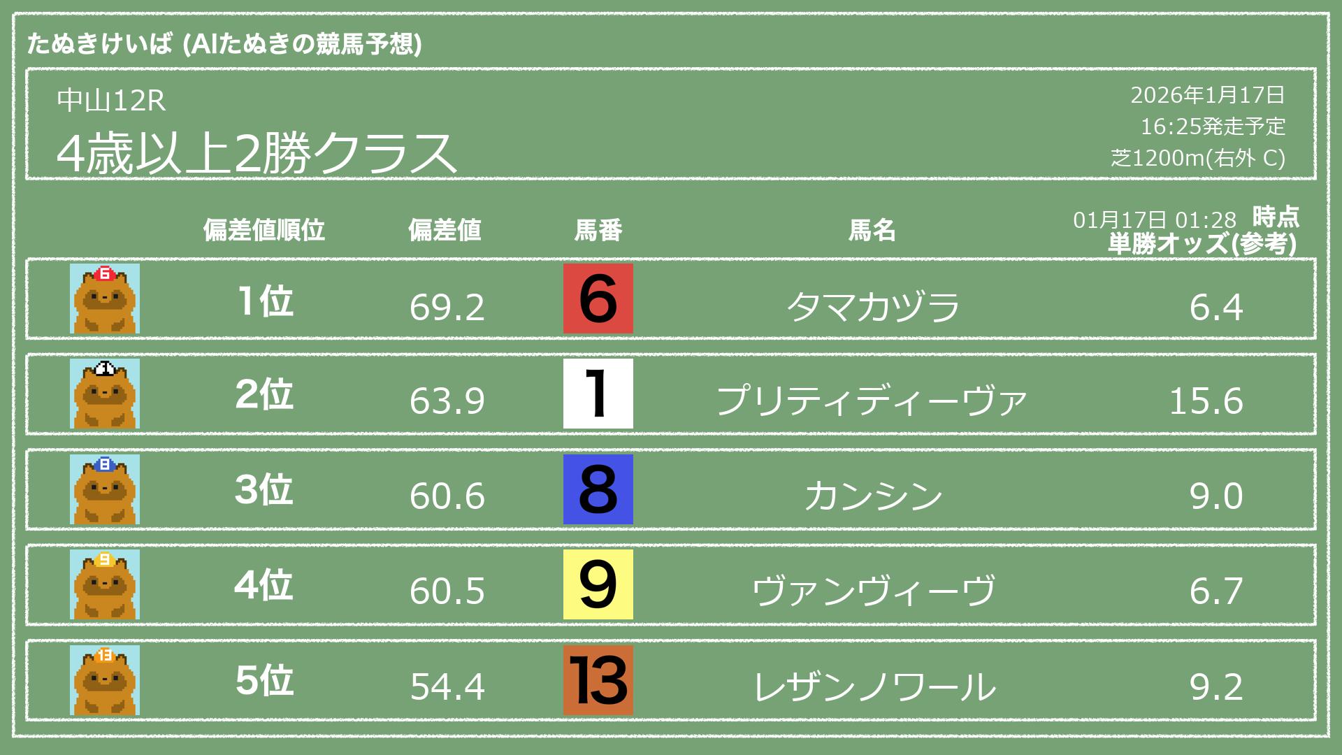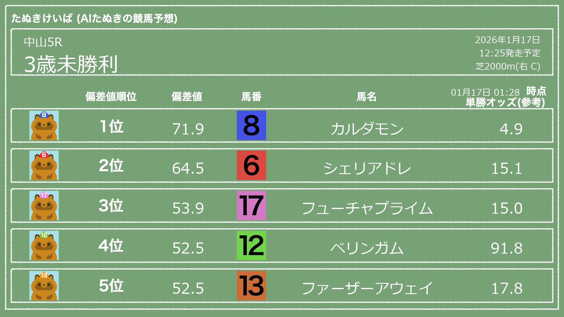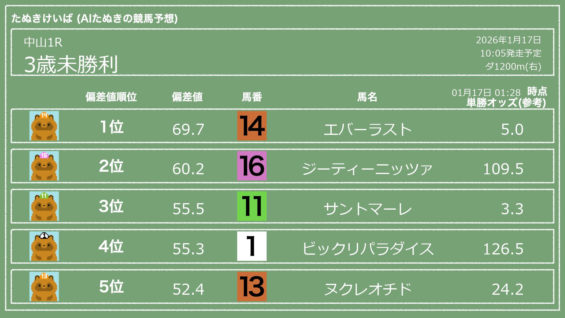 | 枠番 | 馬番 | 馬名 | 人気(予想時点) | オッズ(予想時点) | 馬券偏差値 | |