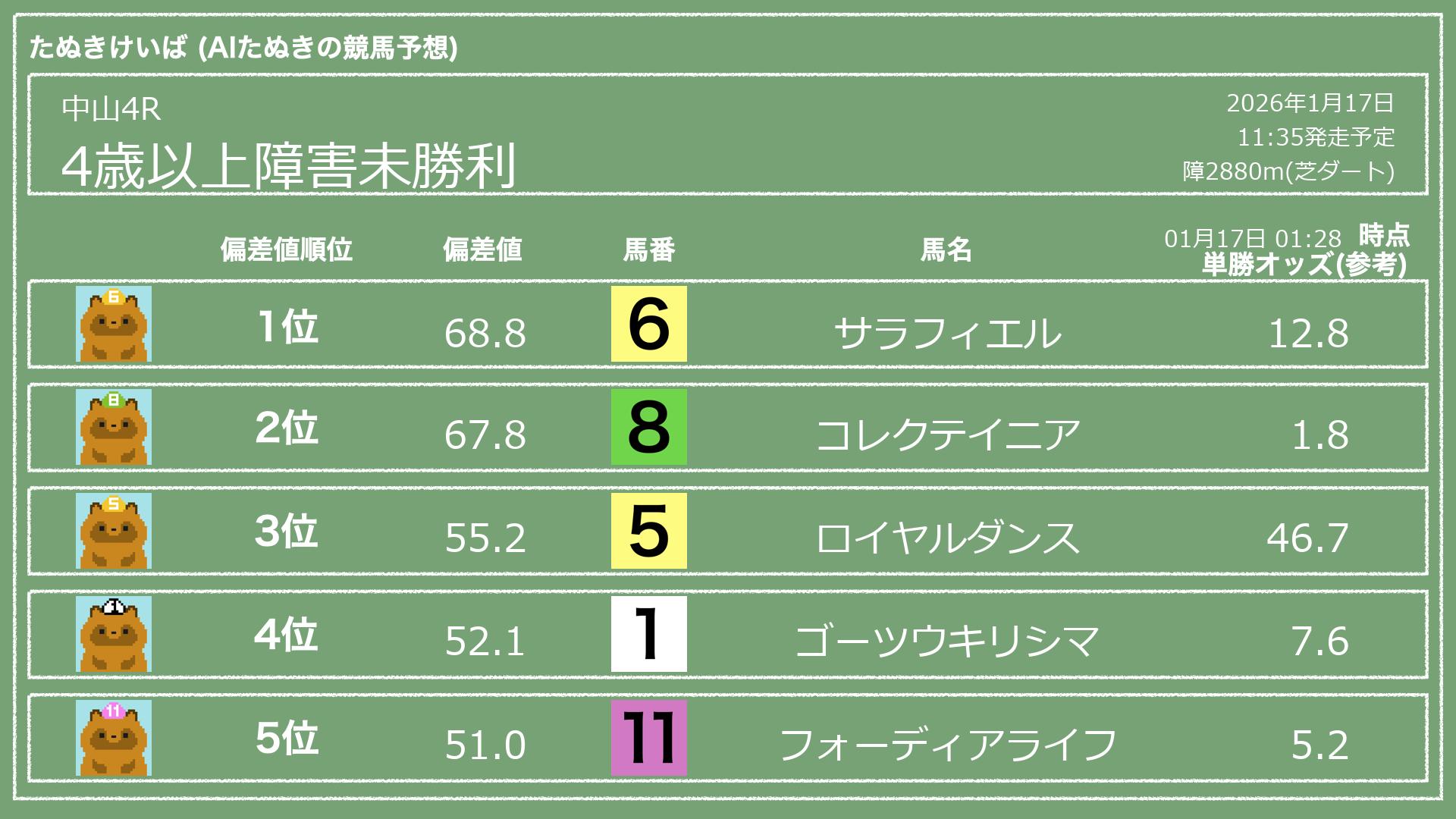 | 1 | 5 | 6 | サラフィエル | 5 | 12.8 | 68.8 |