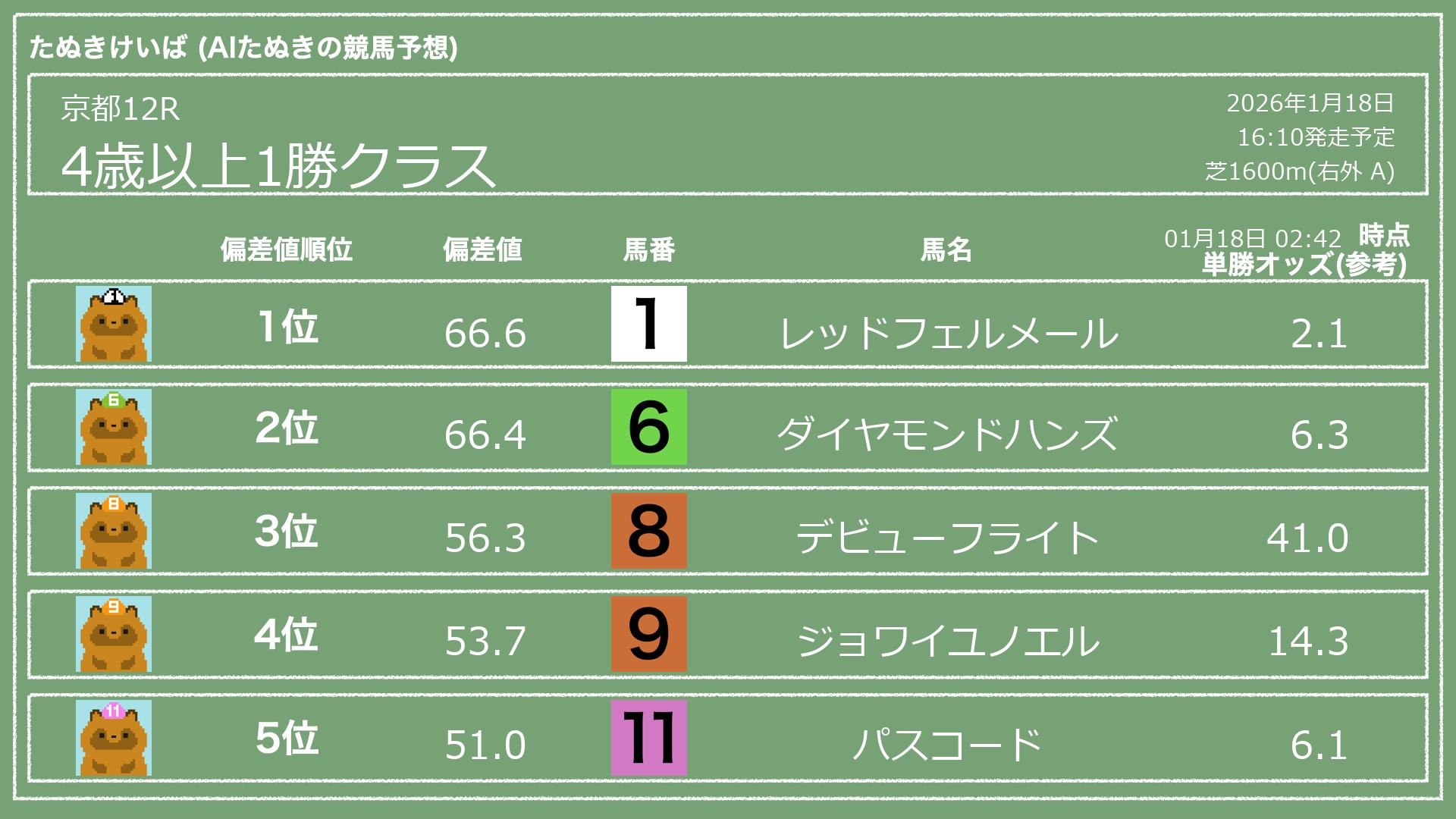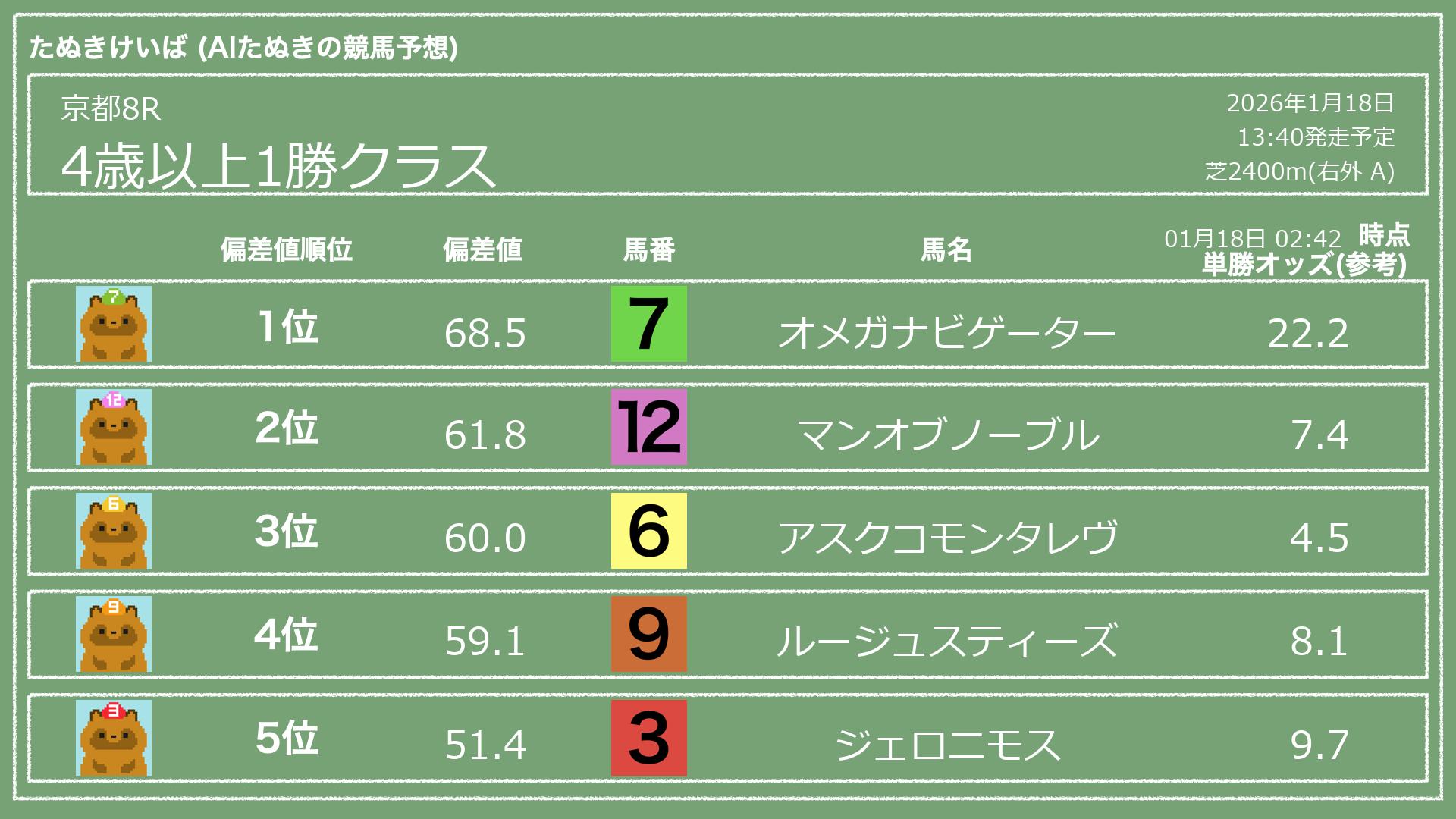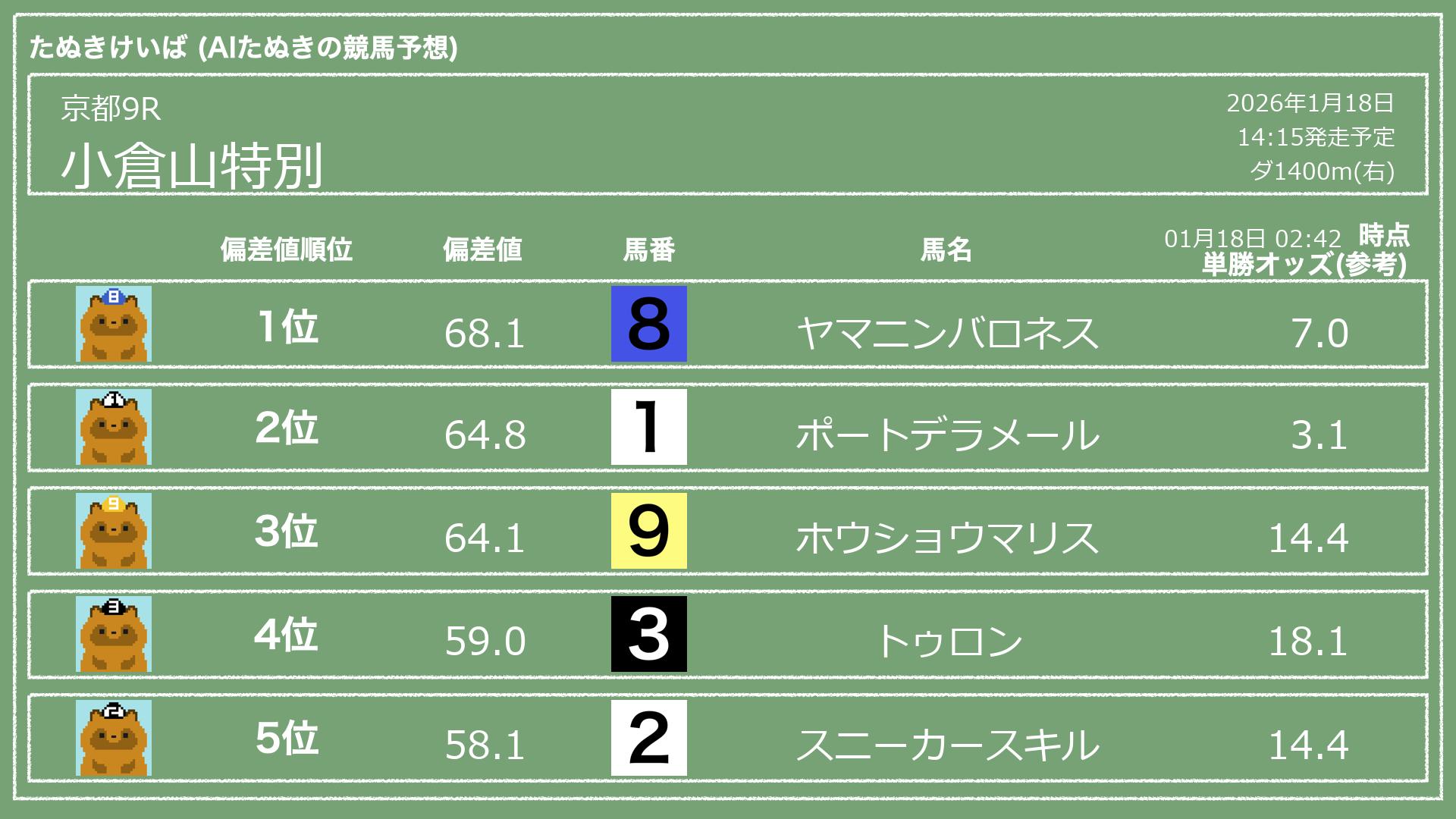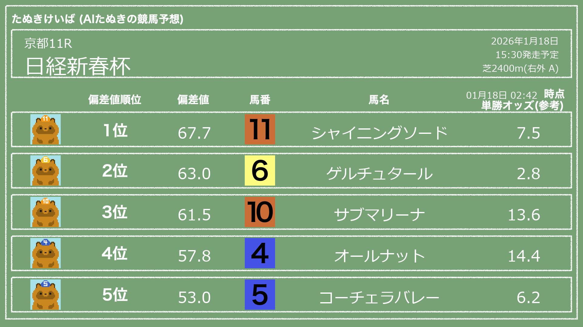 「たぬきけいば」による無料競馬予想です🥳