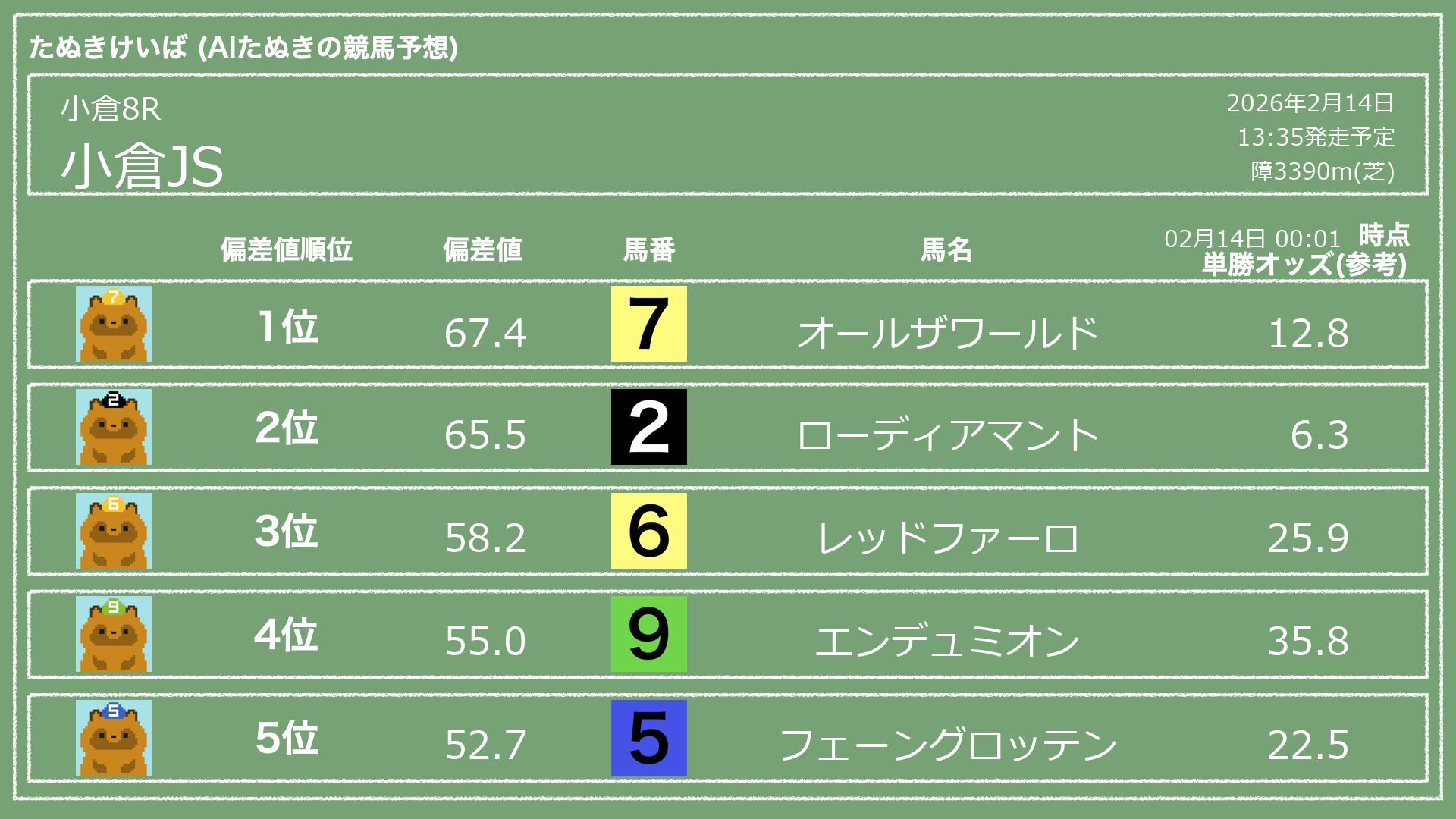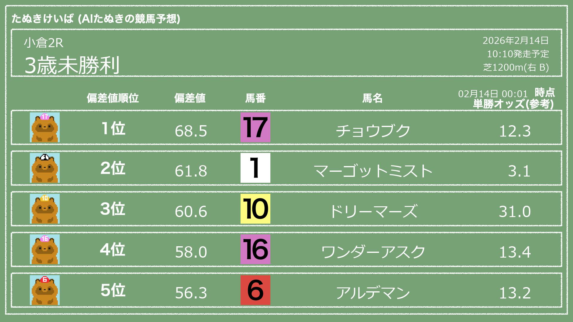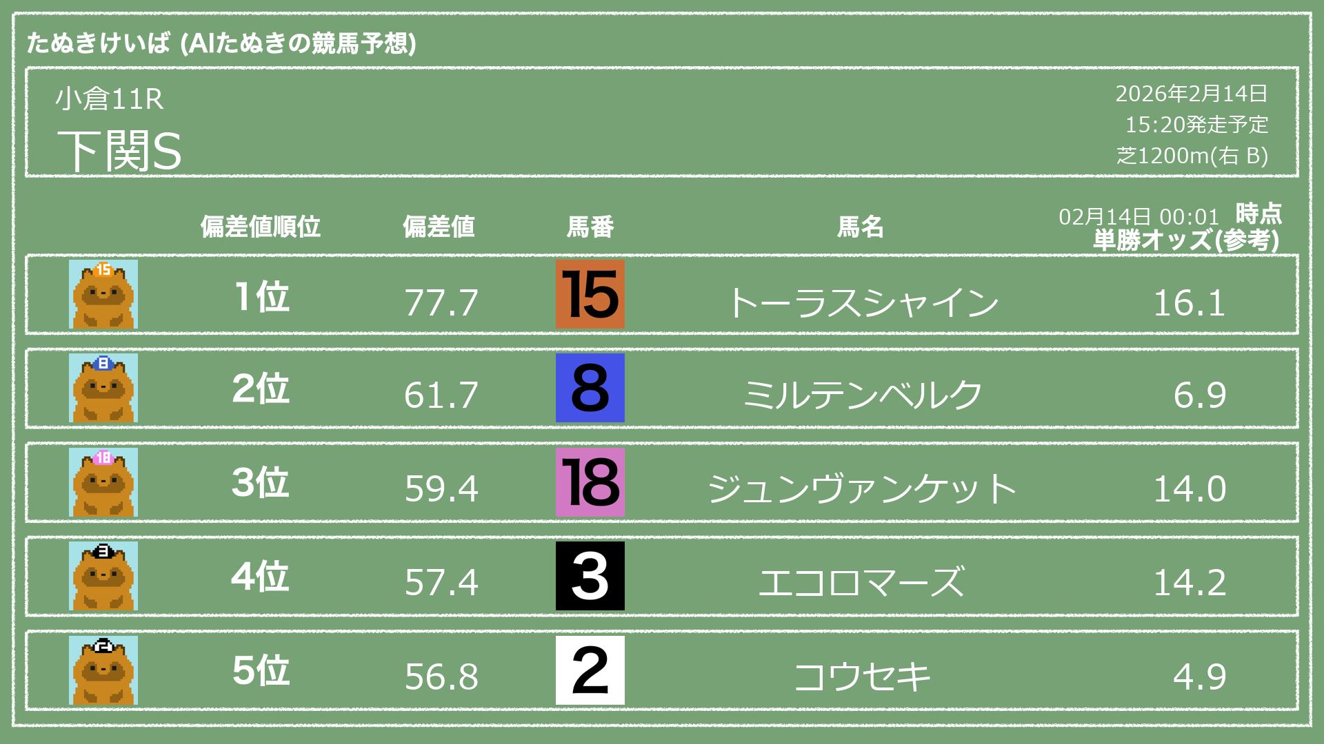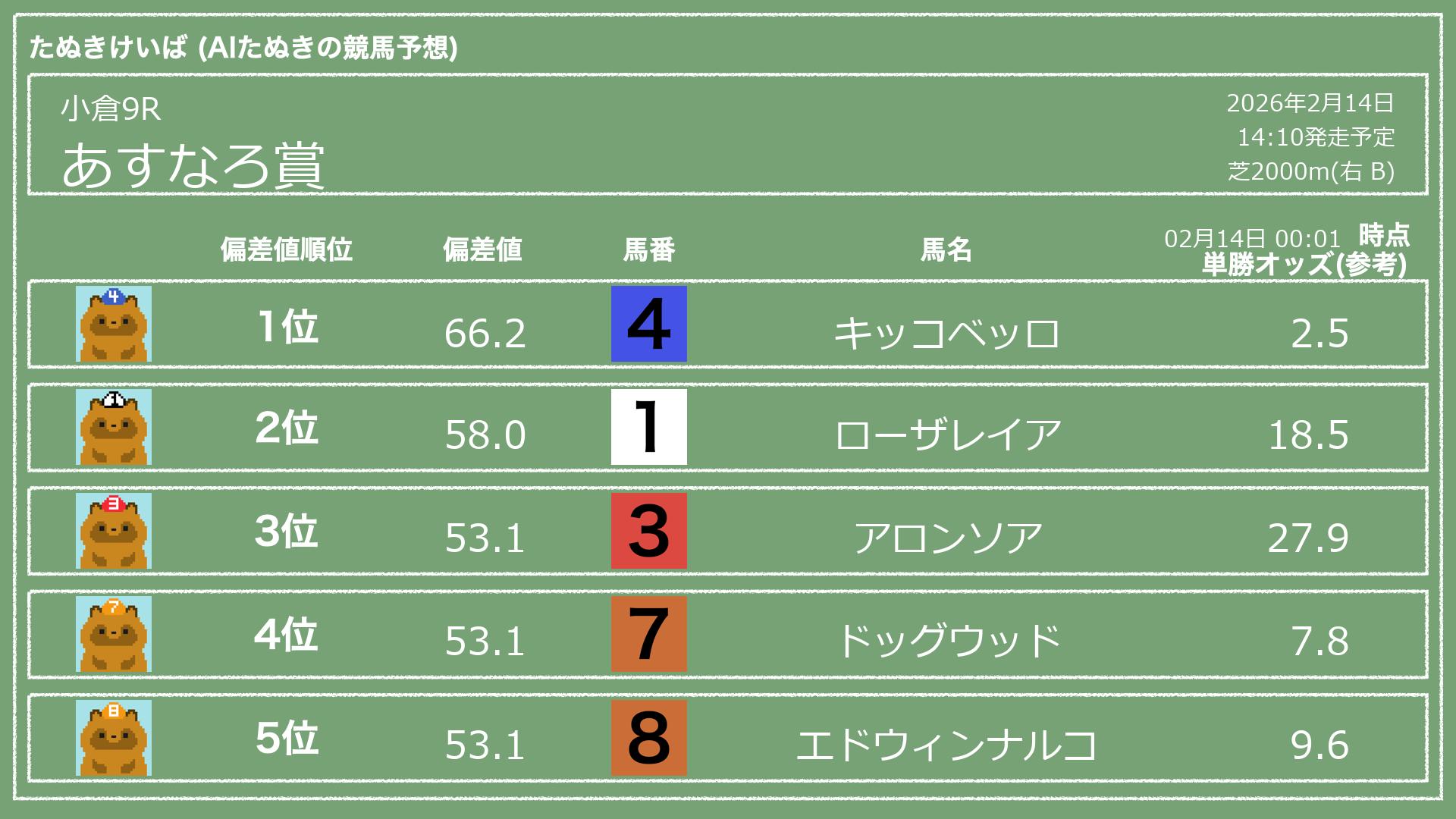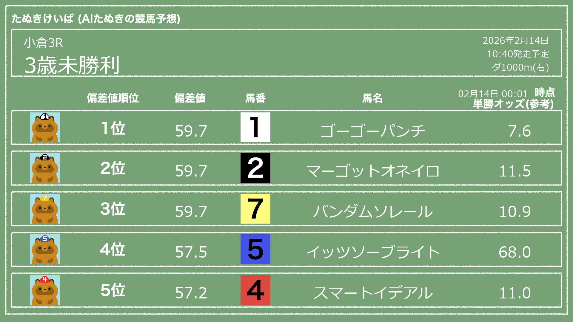 「たぬきけいば」による無料競馬予想です🥳
