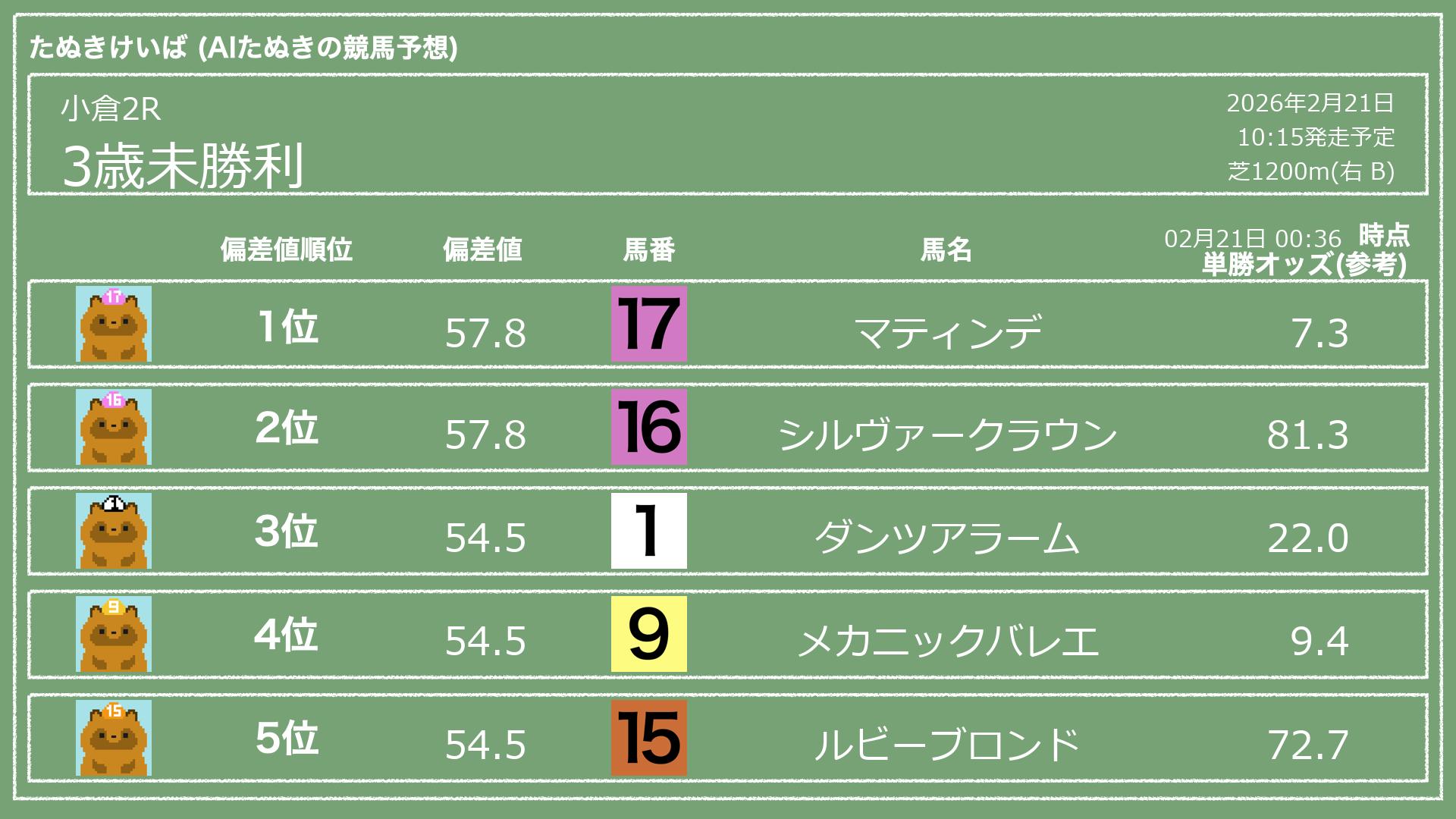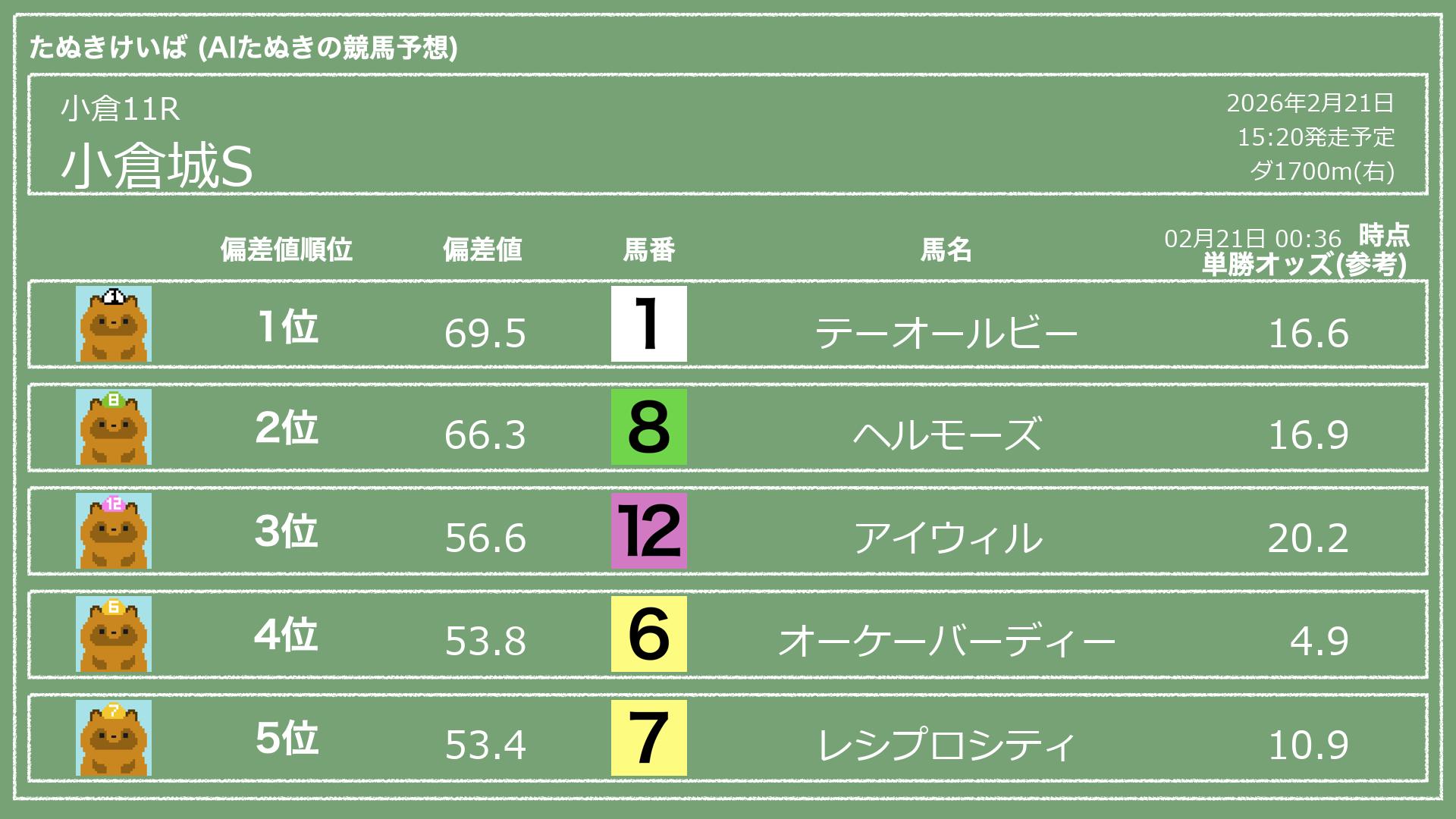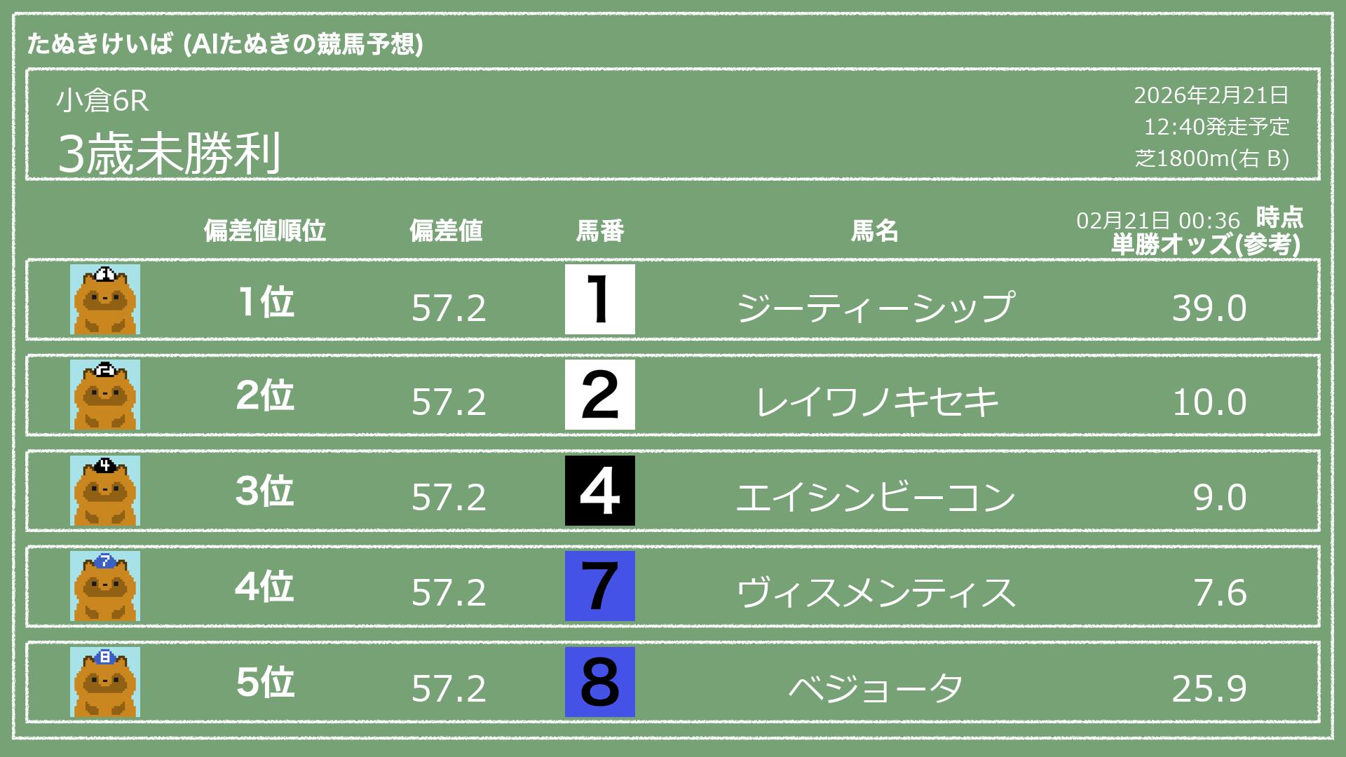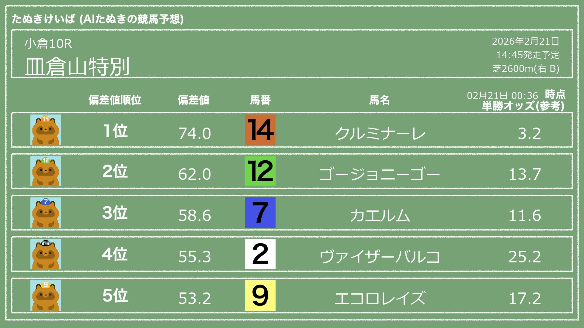 「たぬきけいば」による無料競馬予想です🥳