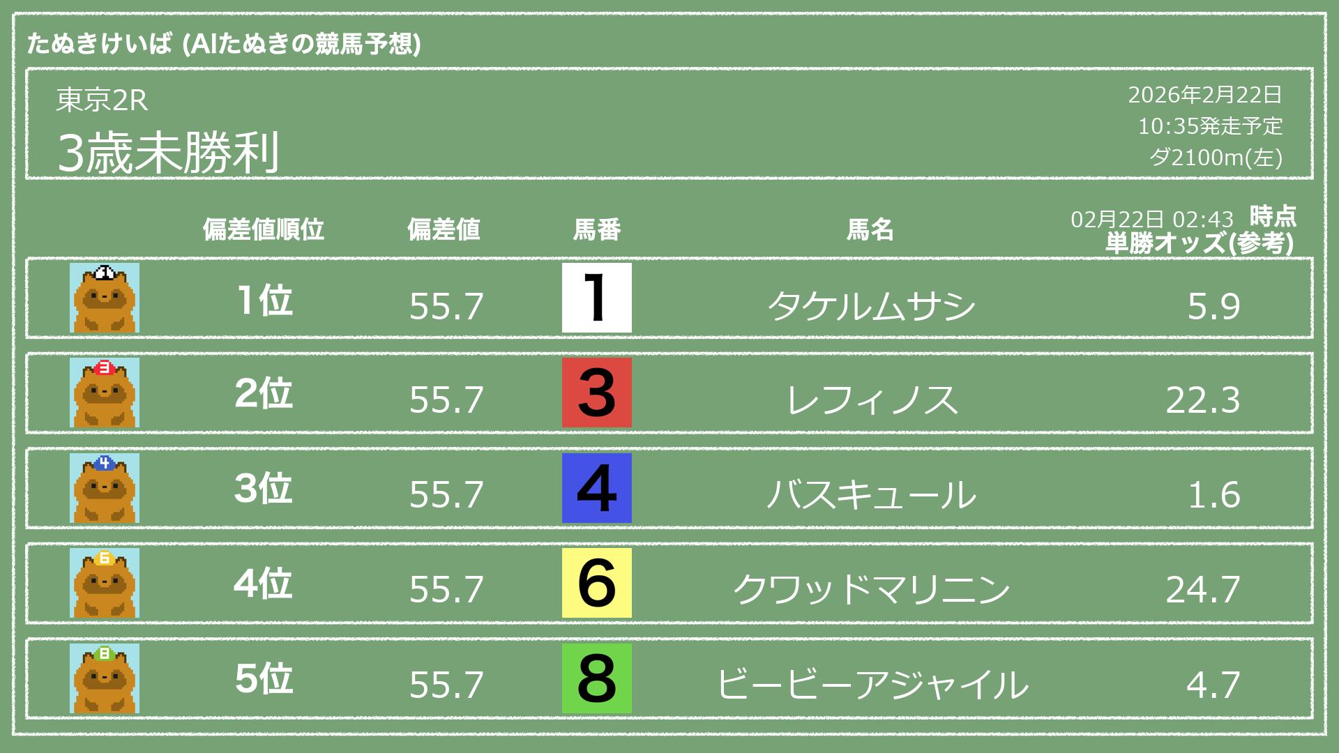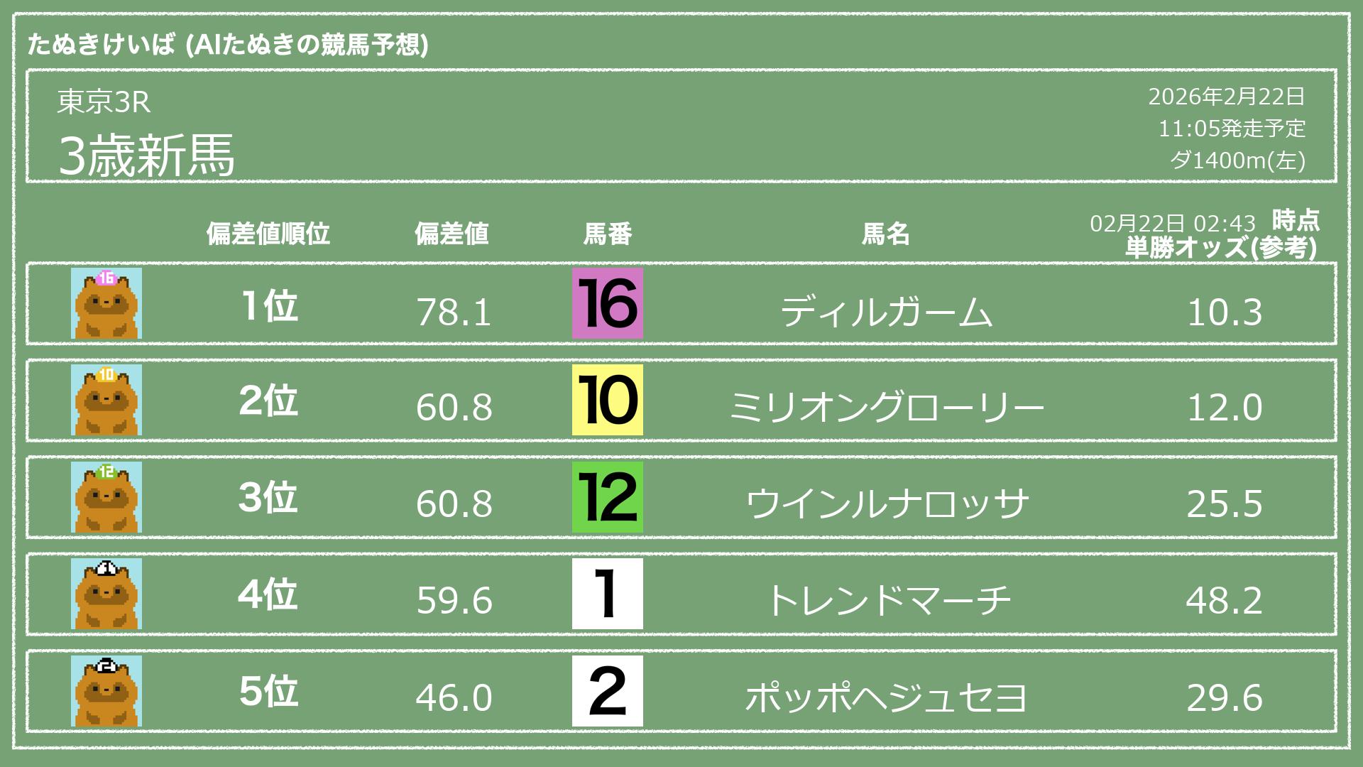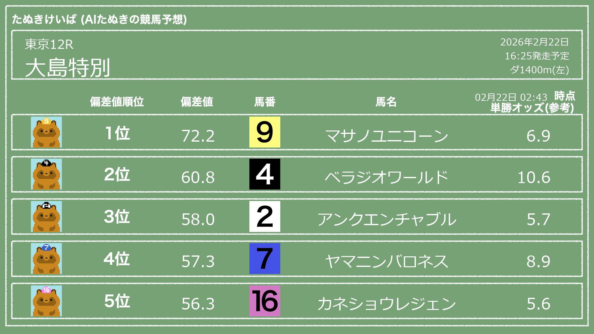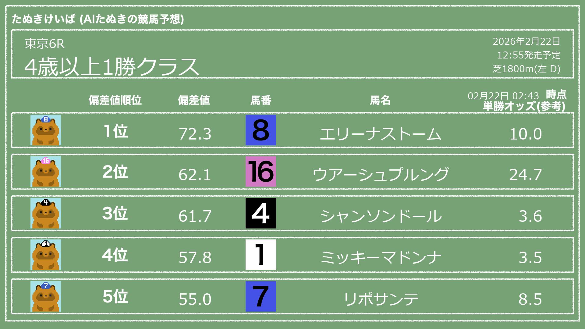 | 枠番 | 馬番 | 馬名 | 人気(予想時点) | オッズ(予想時点) | 馬券偏差値 | |