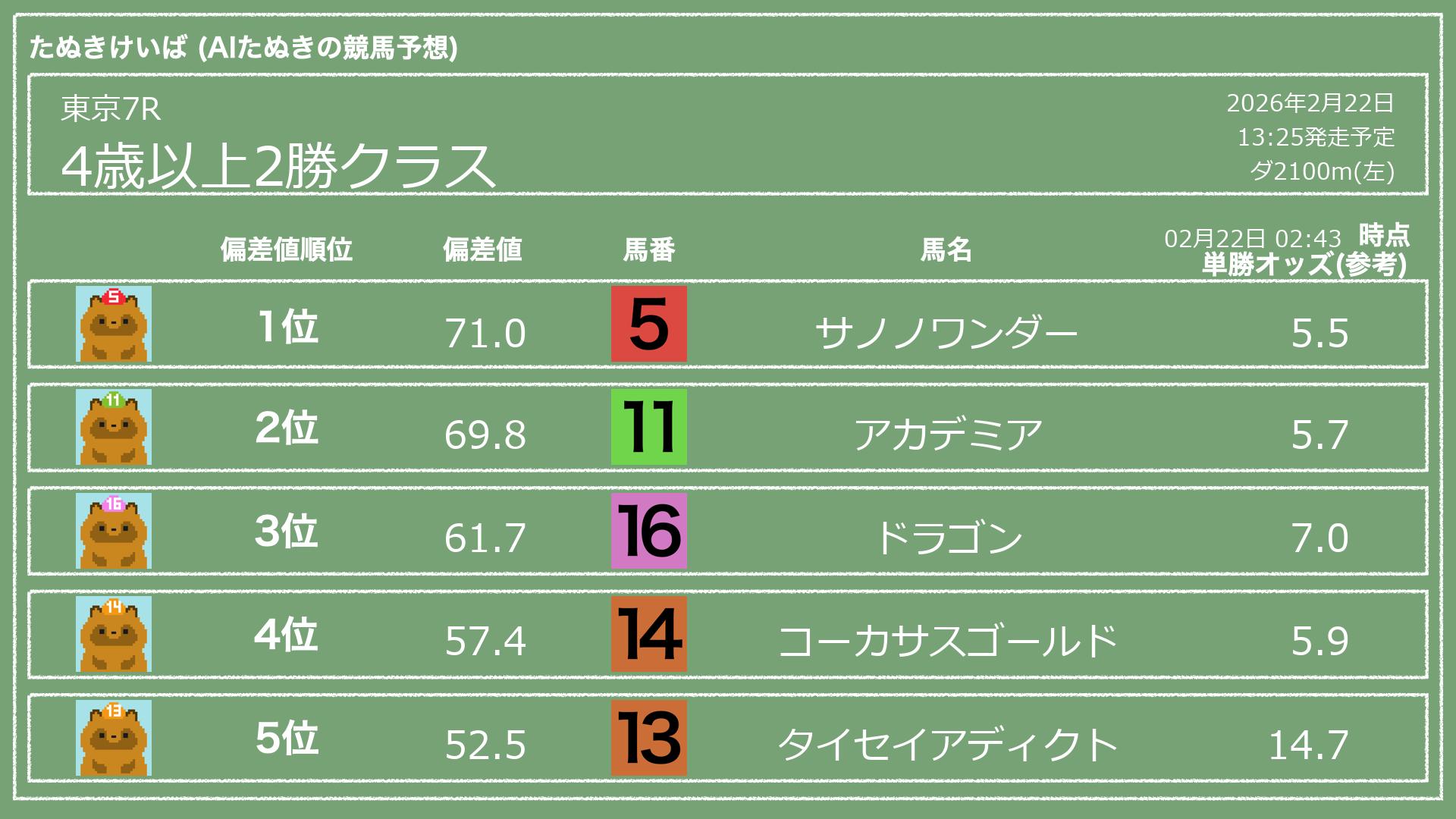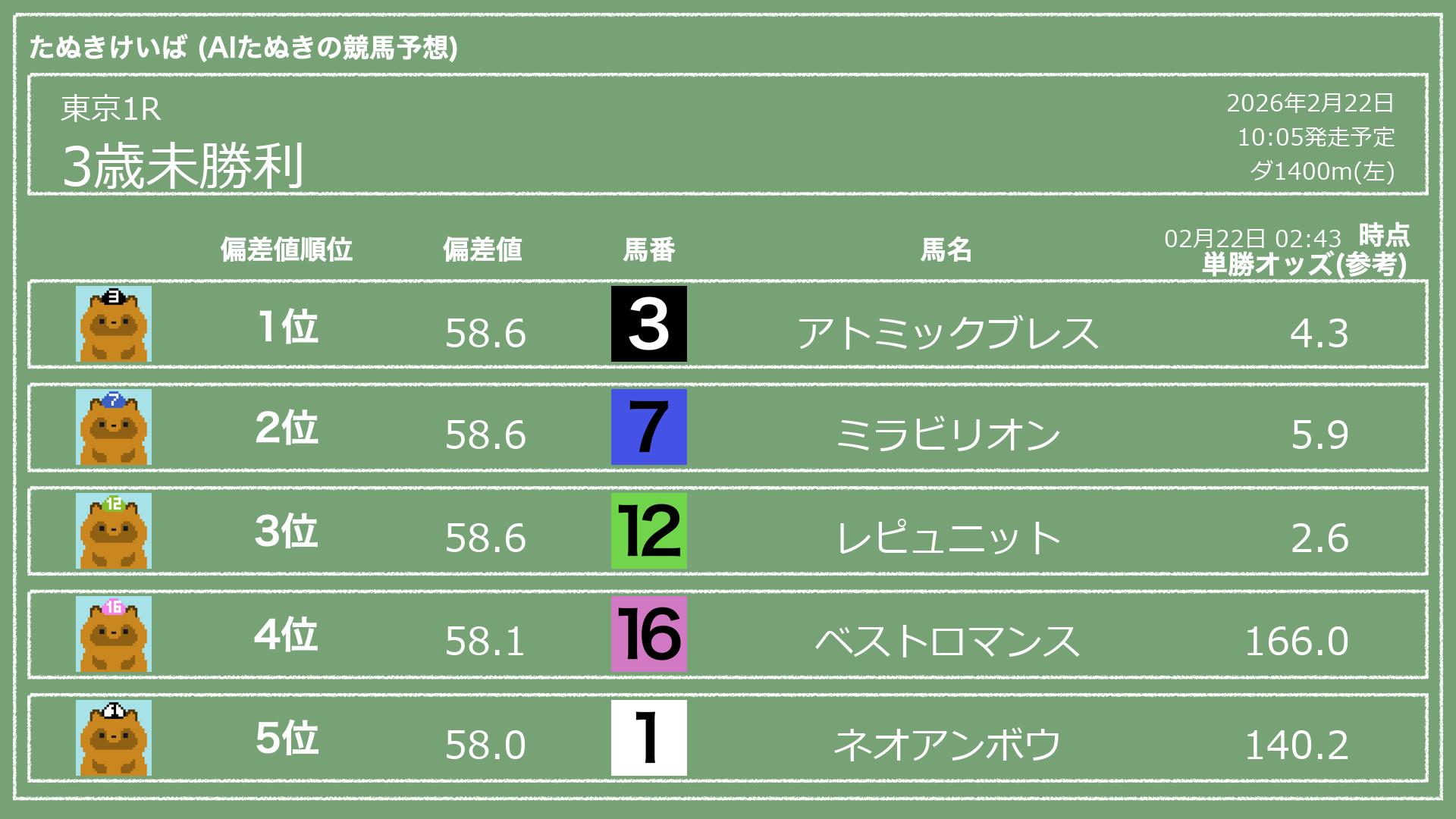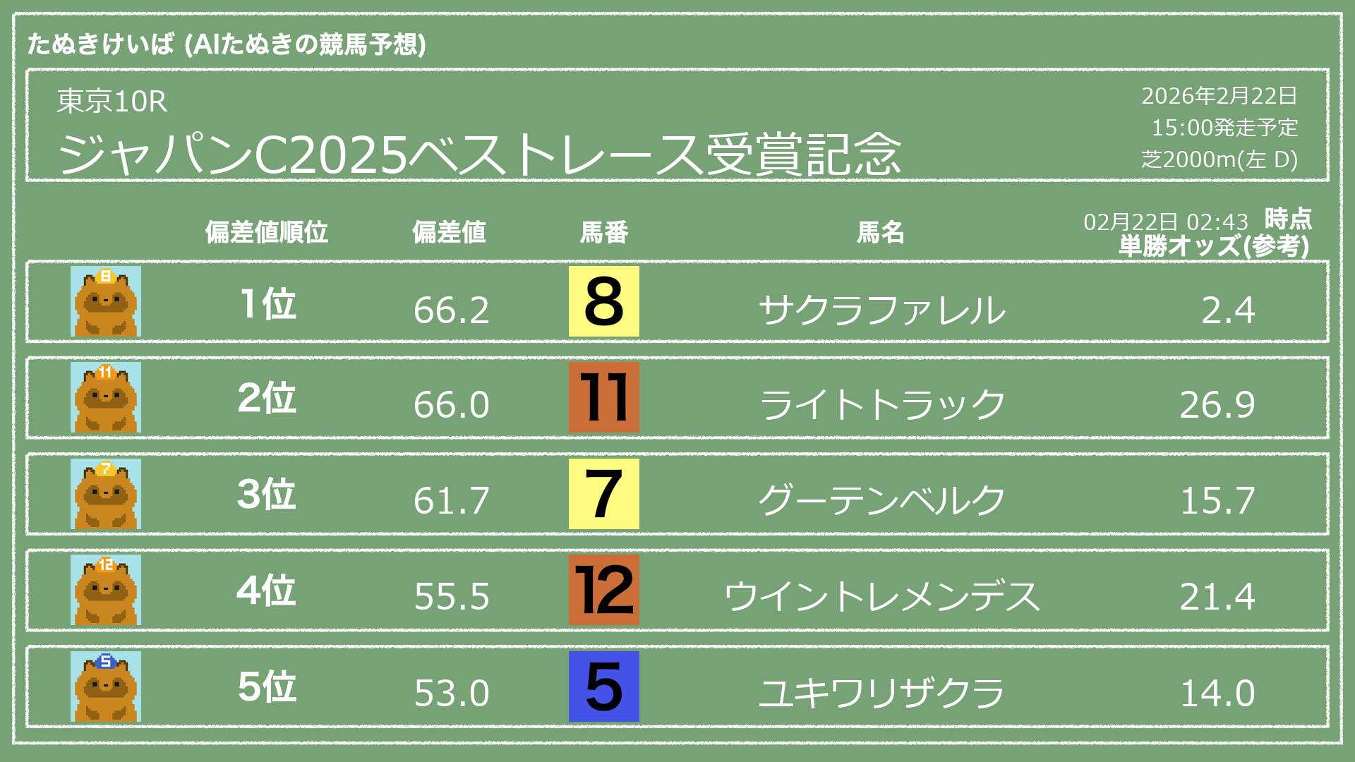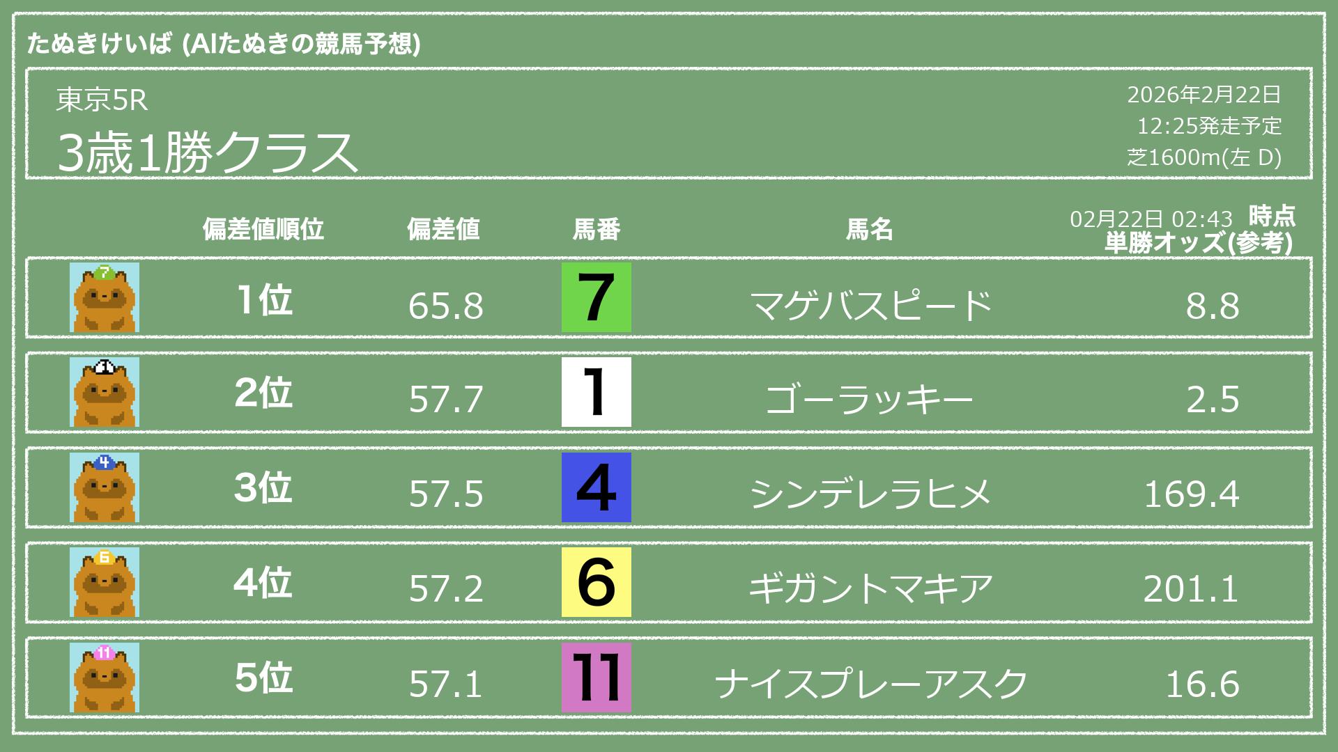 | 枠番 | 馬番 | 馬名 | 人気(予想時点) | オッズ(予想時点) | 馬券偏差値 | |