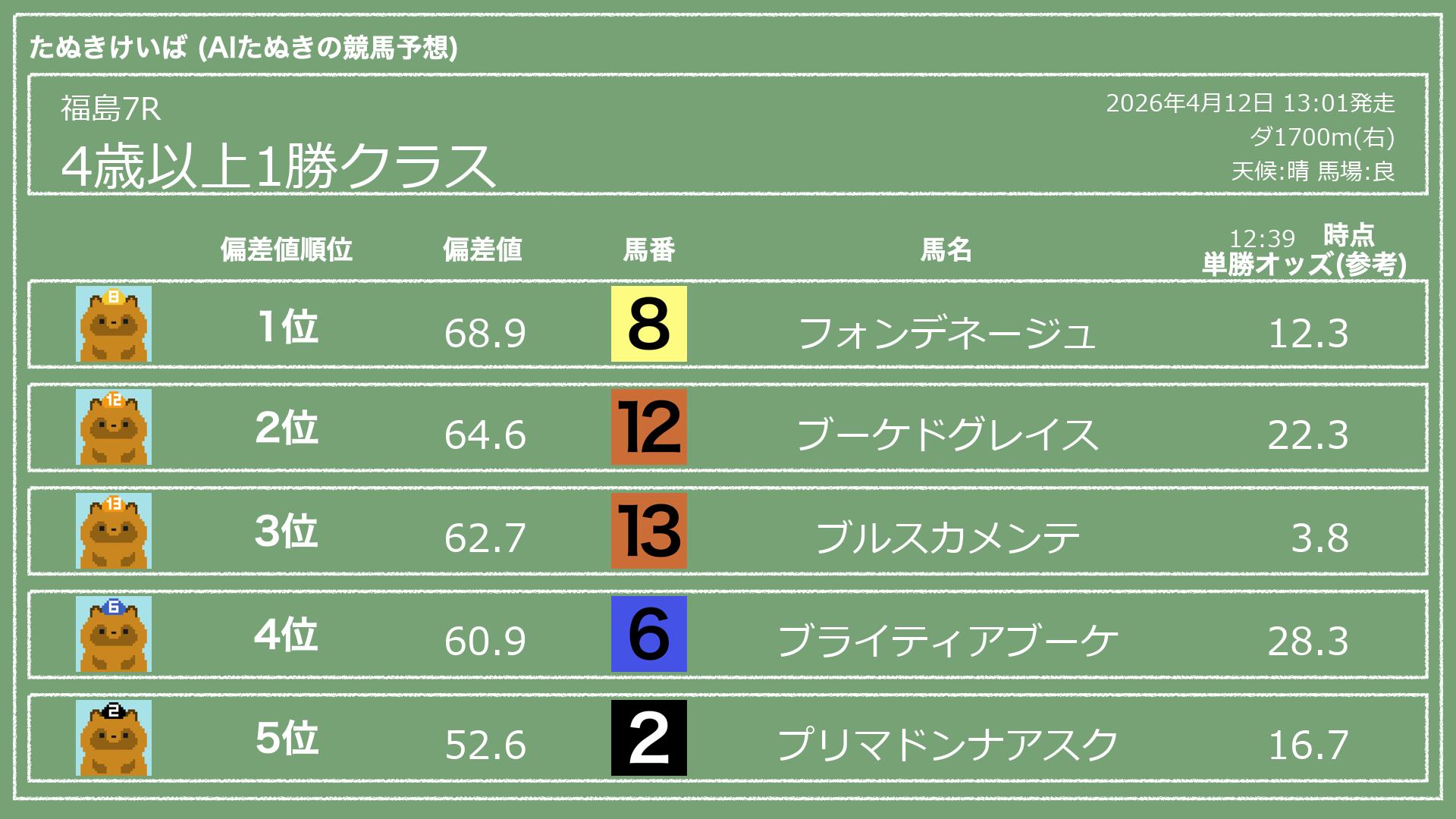 うちのたぬき(AI)による競馬予想です。レースごとに各馬の能力を偏差値で表現してみました。