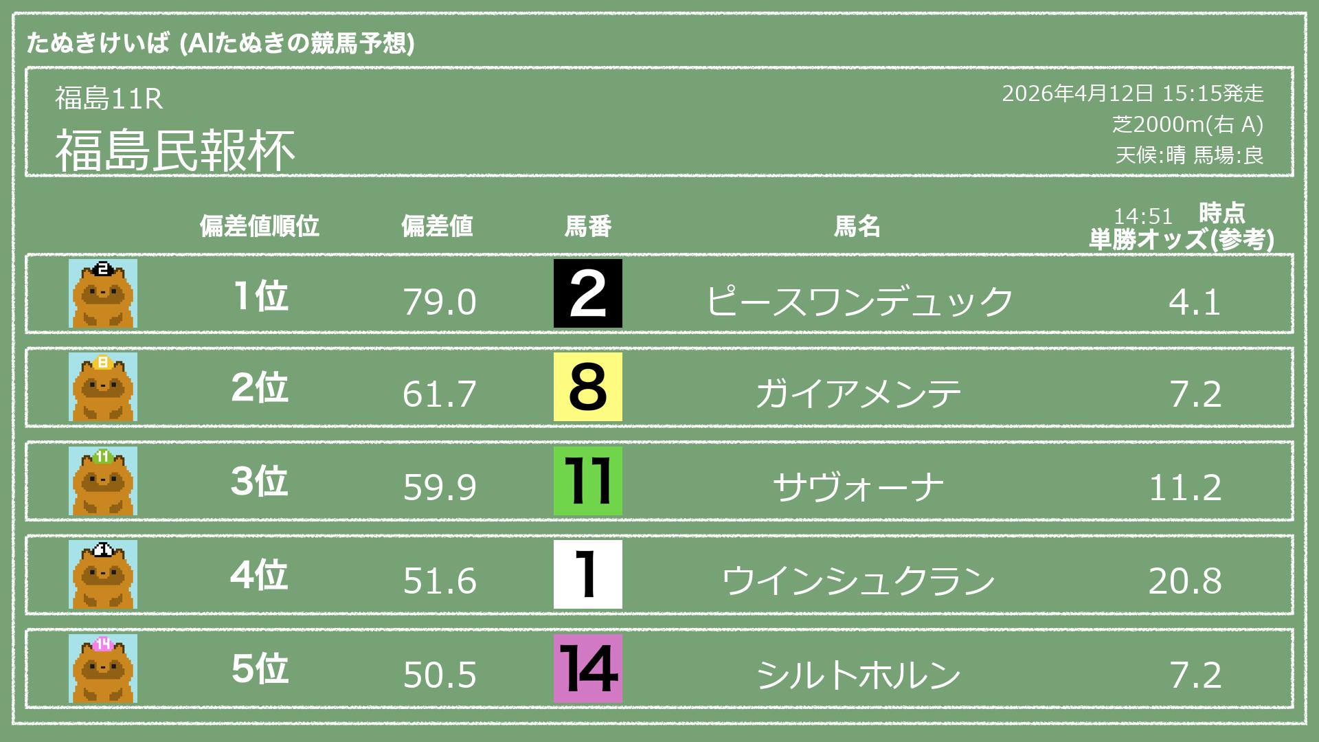 うちのたぬき(AI)による競馬予想です。レースごとに各馬の能力を偏差値で表現してみました。