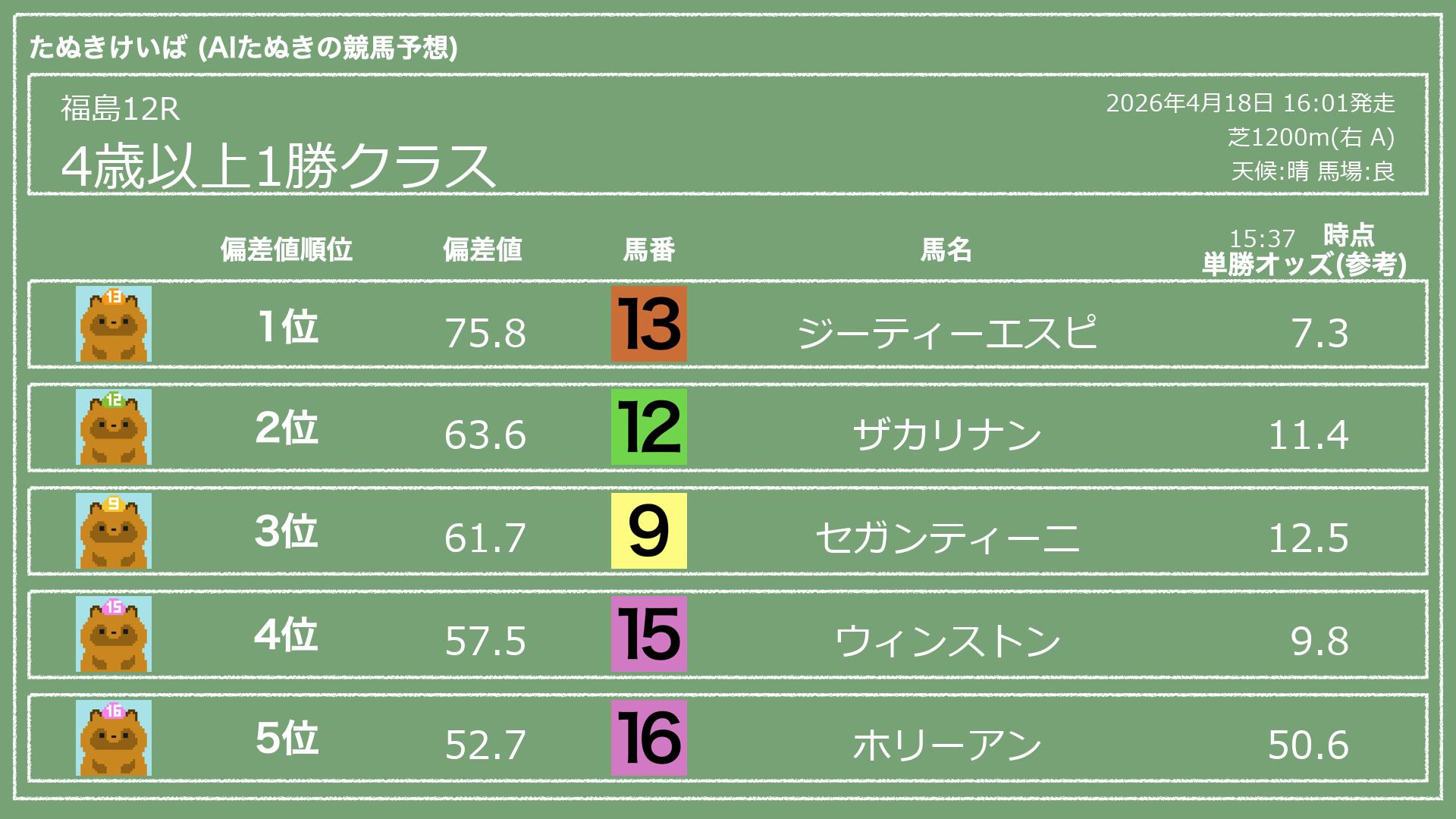 うちのたぬき(AI)による競馬予想です。レースごとに各馬の能力を偏差値で表現してみました。