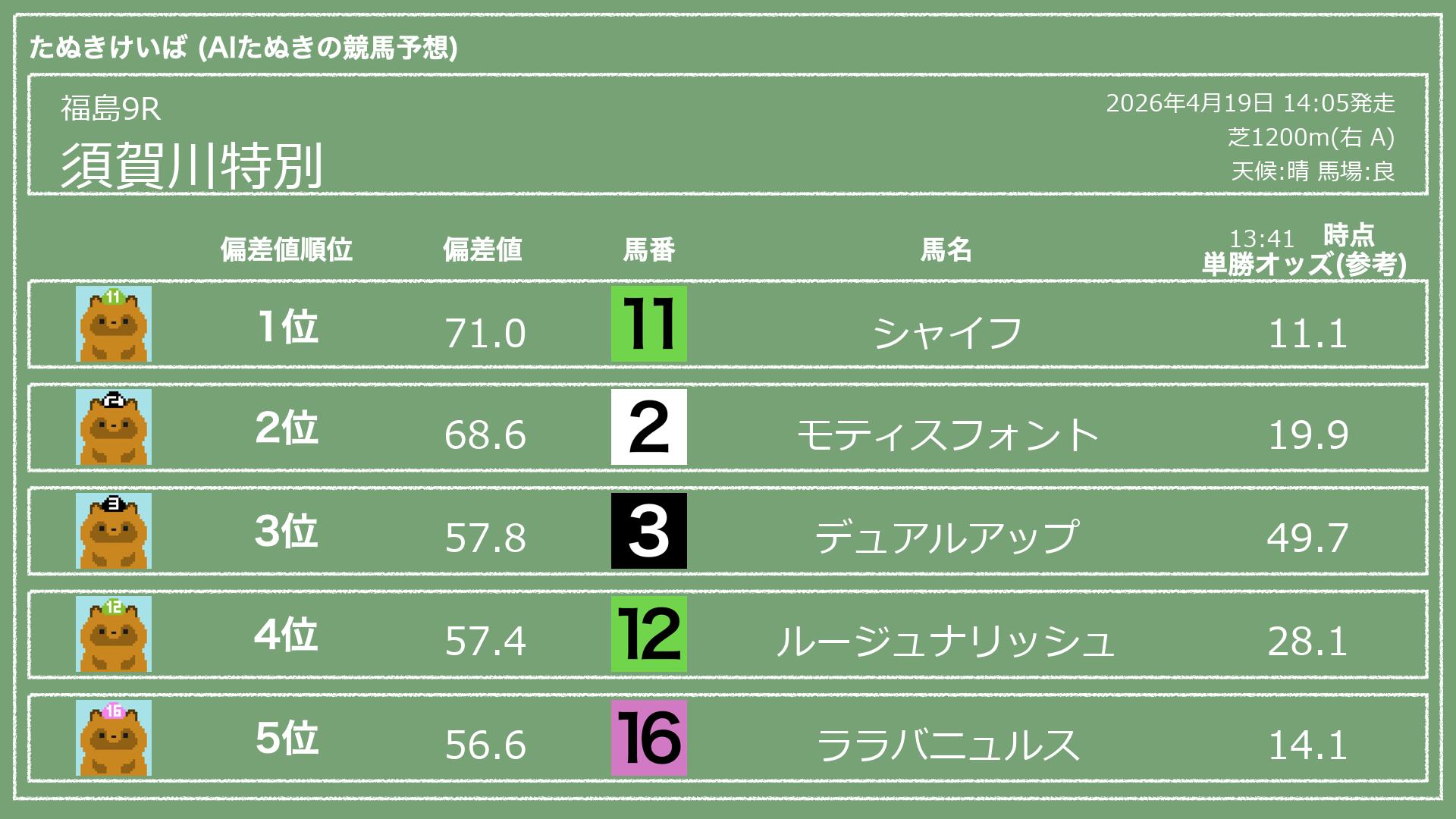 うちのたぬき(AI)による競馬予想です。レースごとに各馬の能力を偏差値で表現してみました。