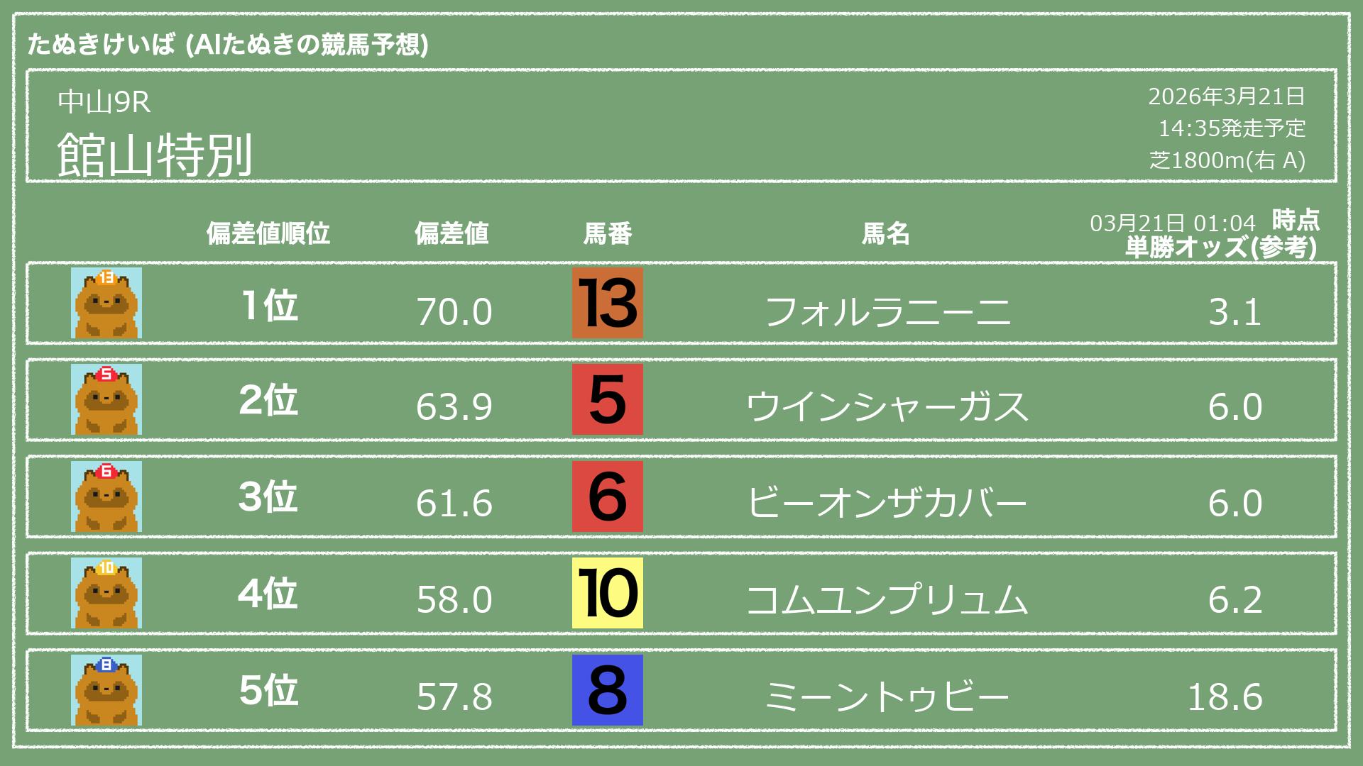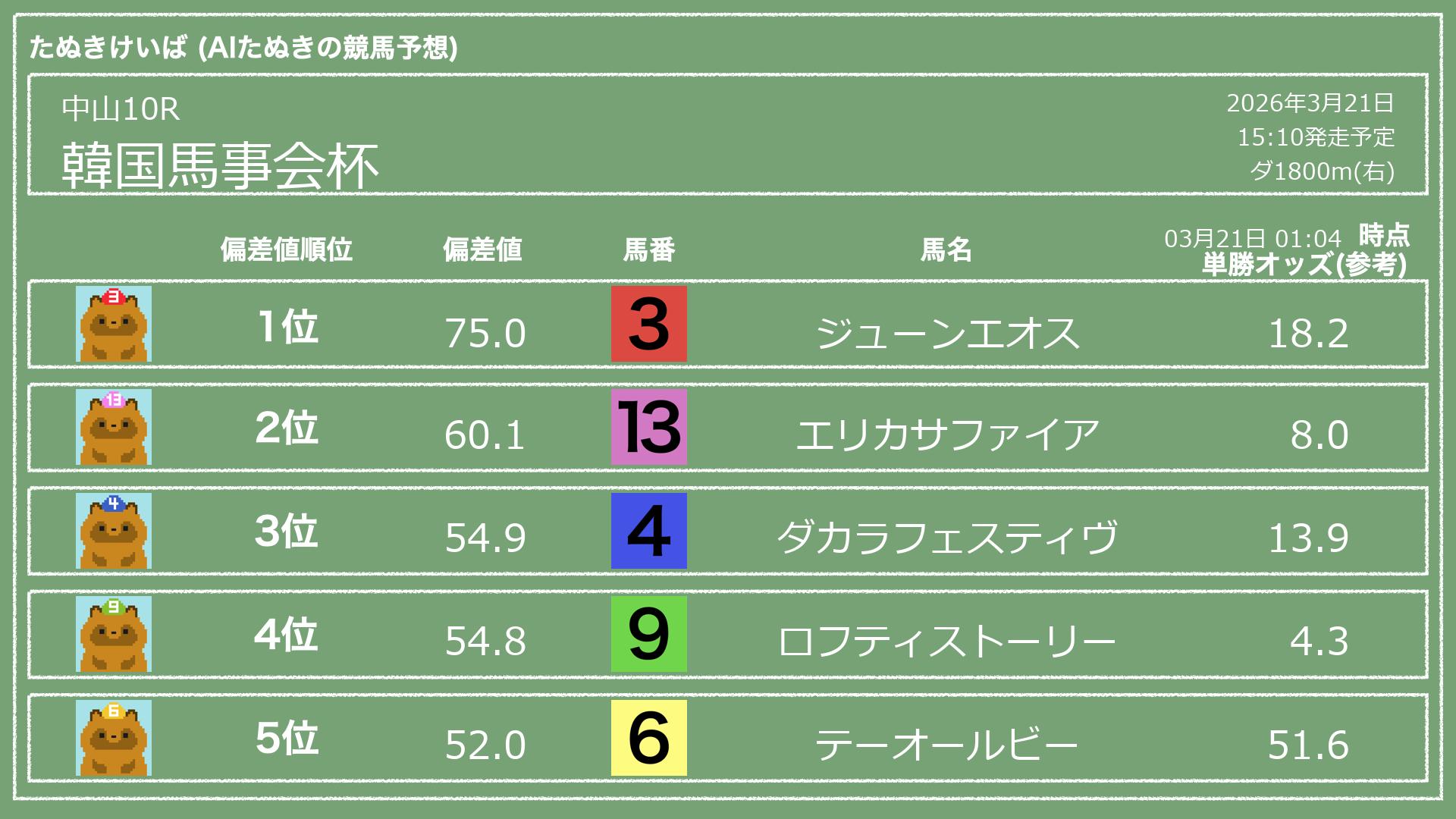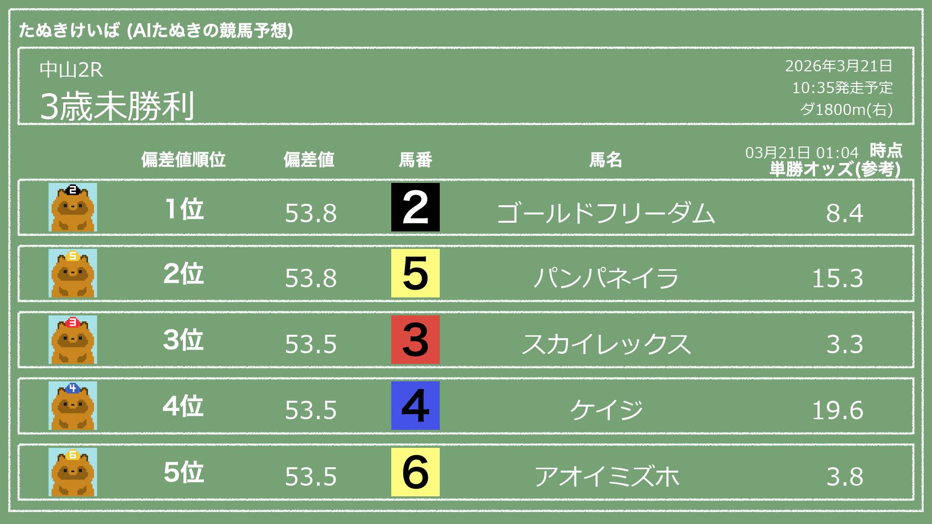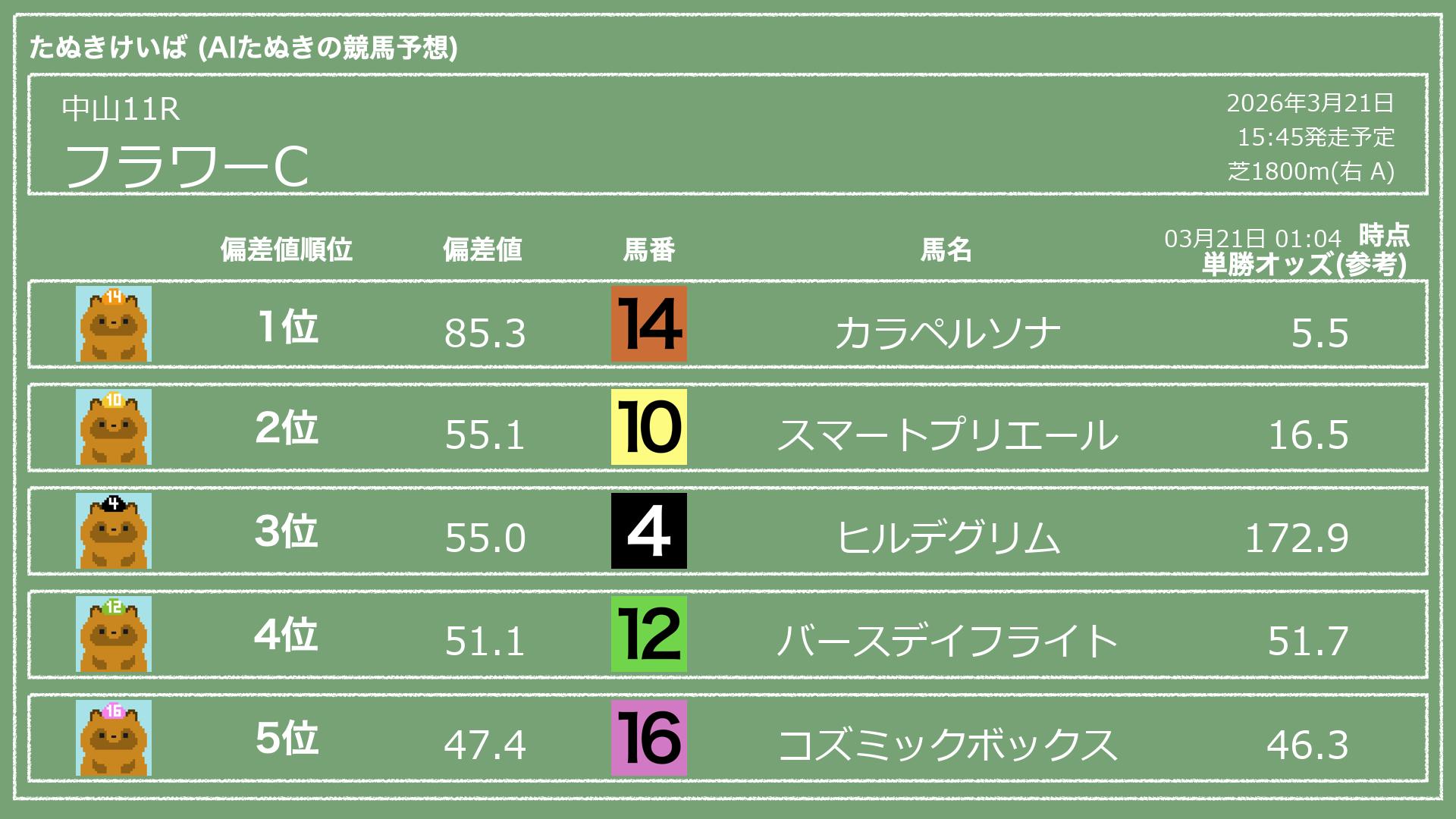 「たぬきけいば」による無料競馬予想です🥳