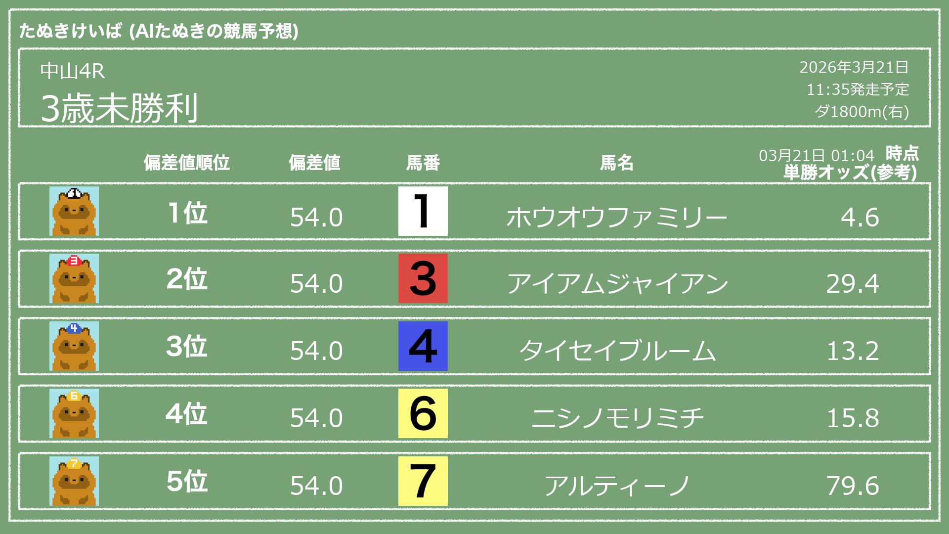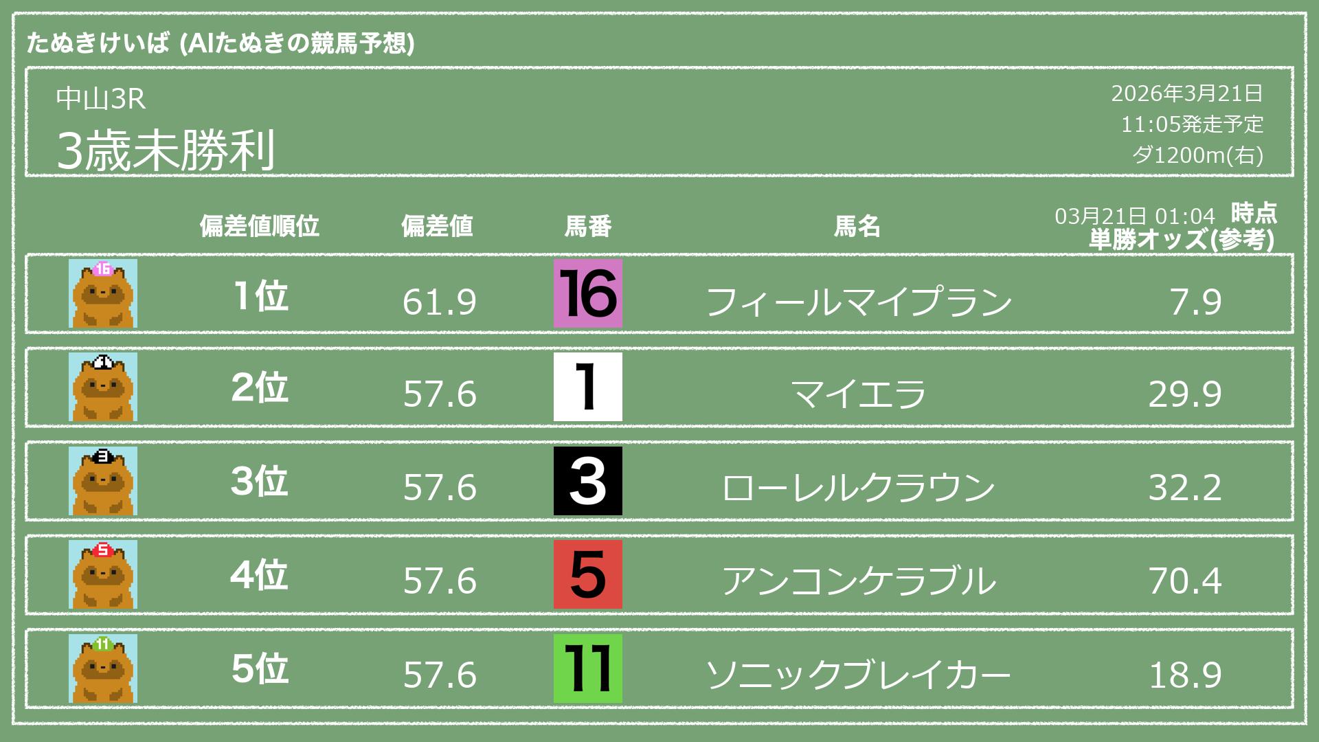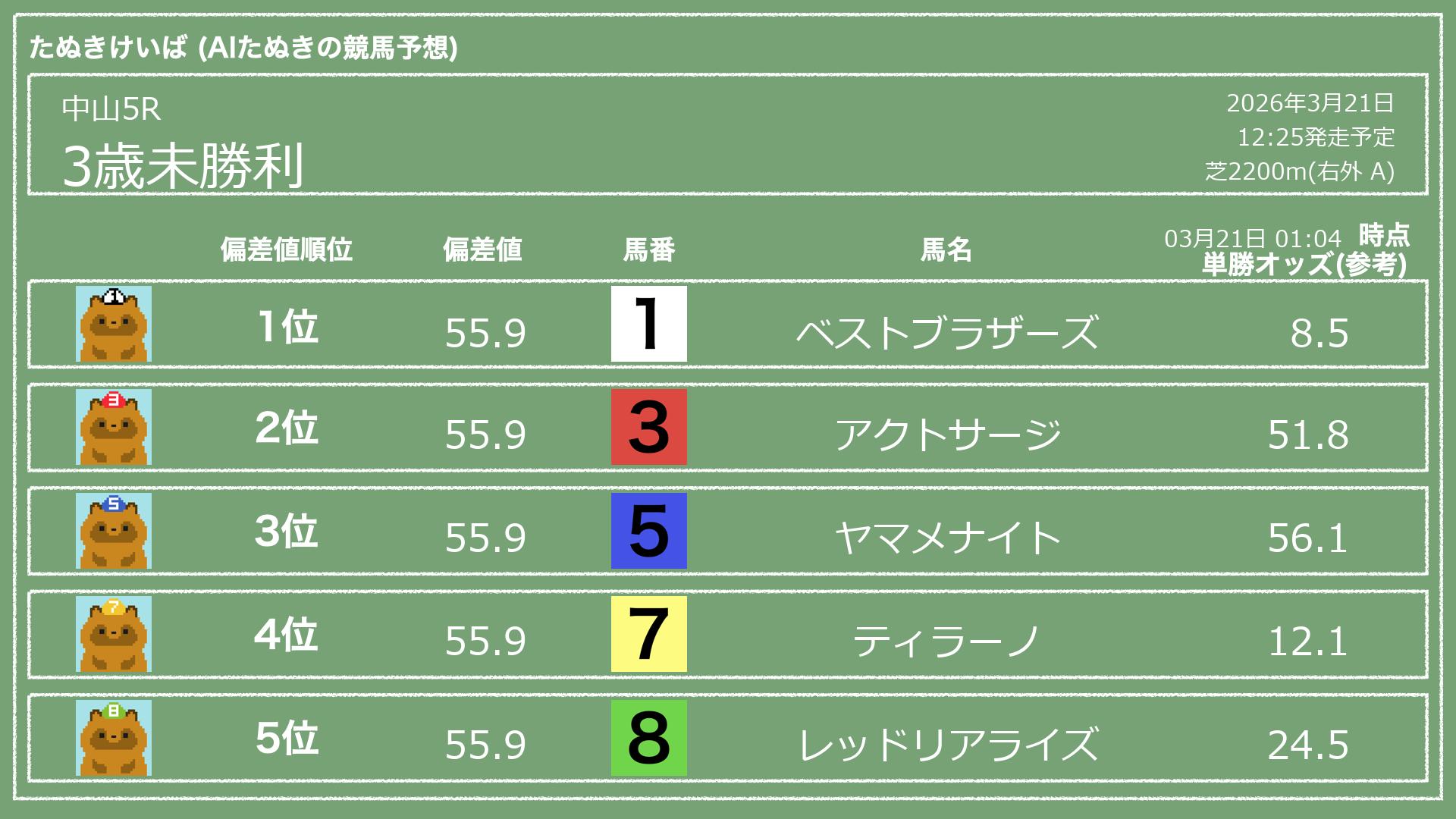 「たぬきけいば」による無料競馬予想です🥳