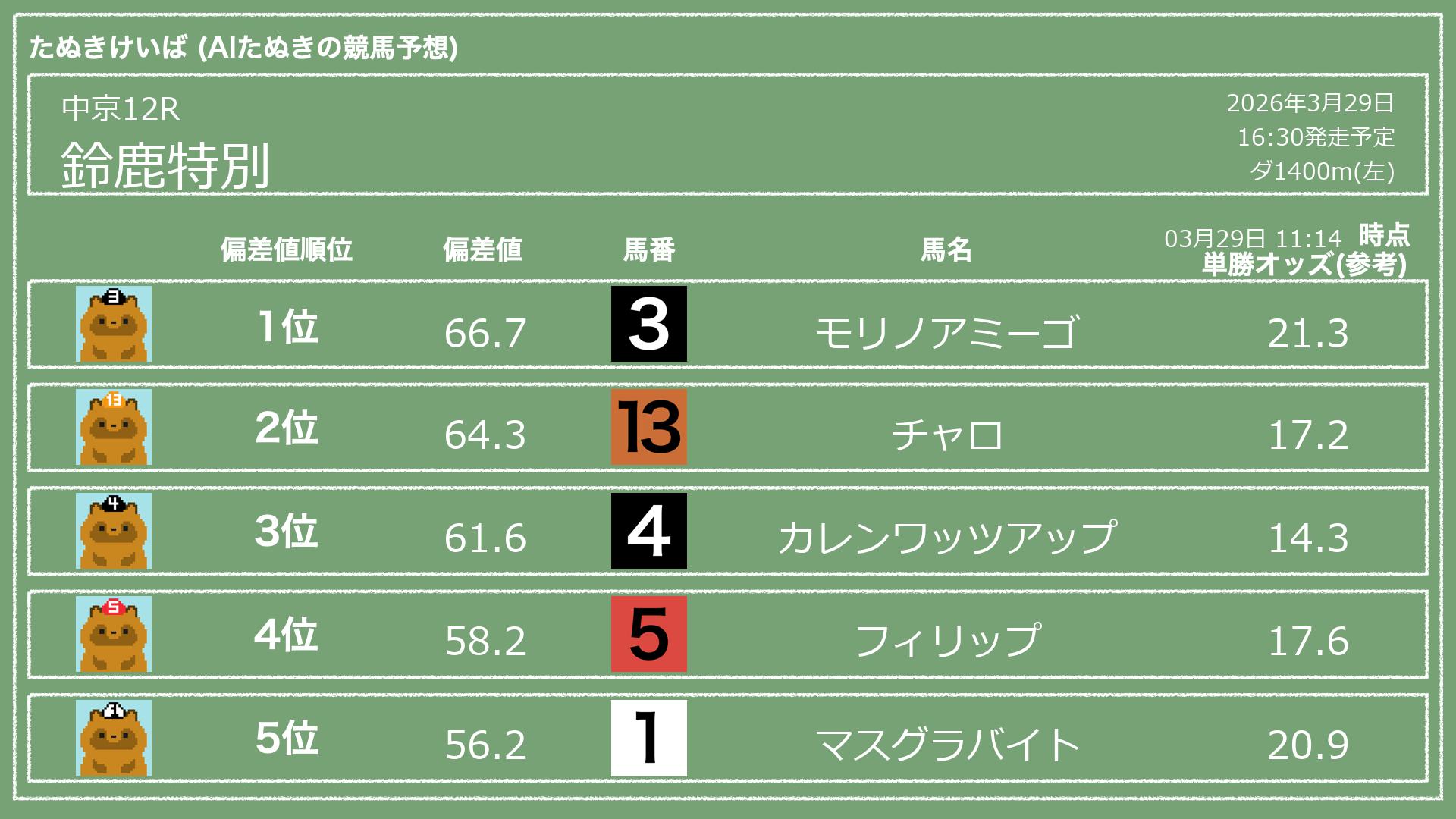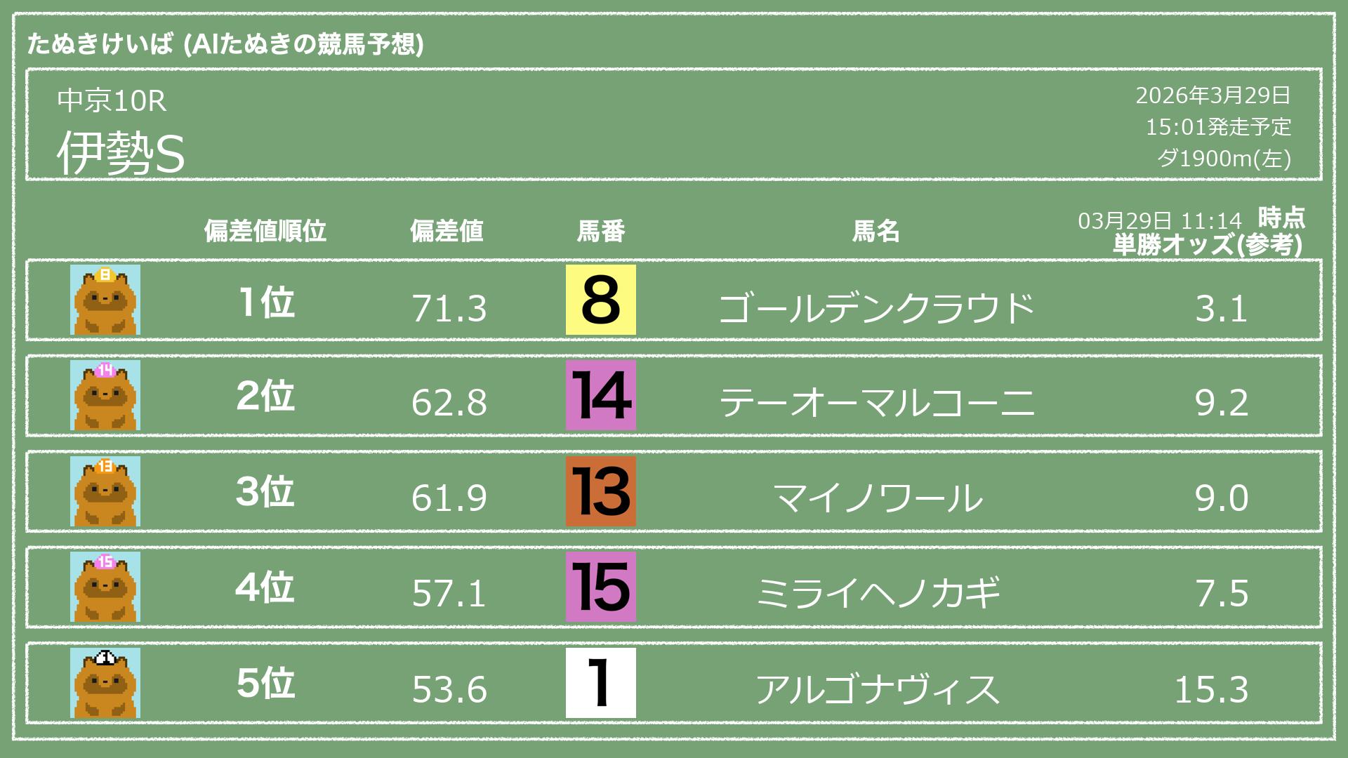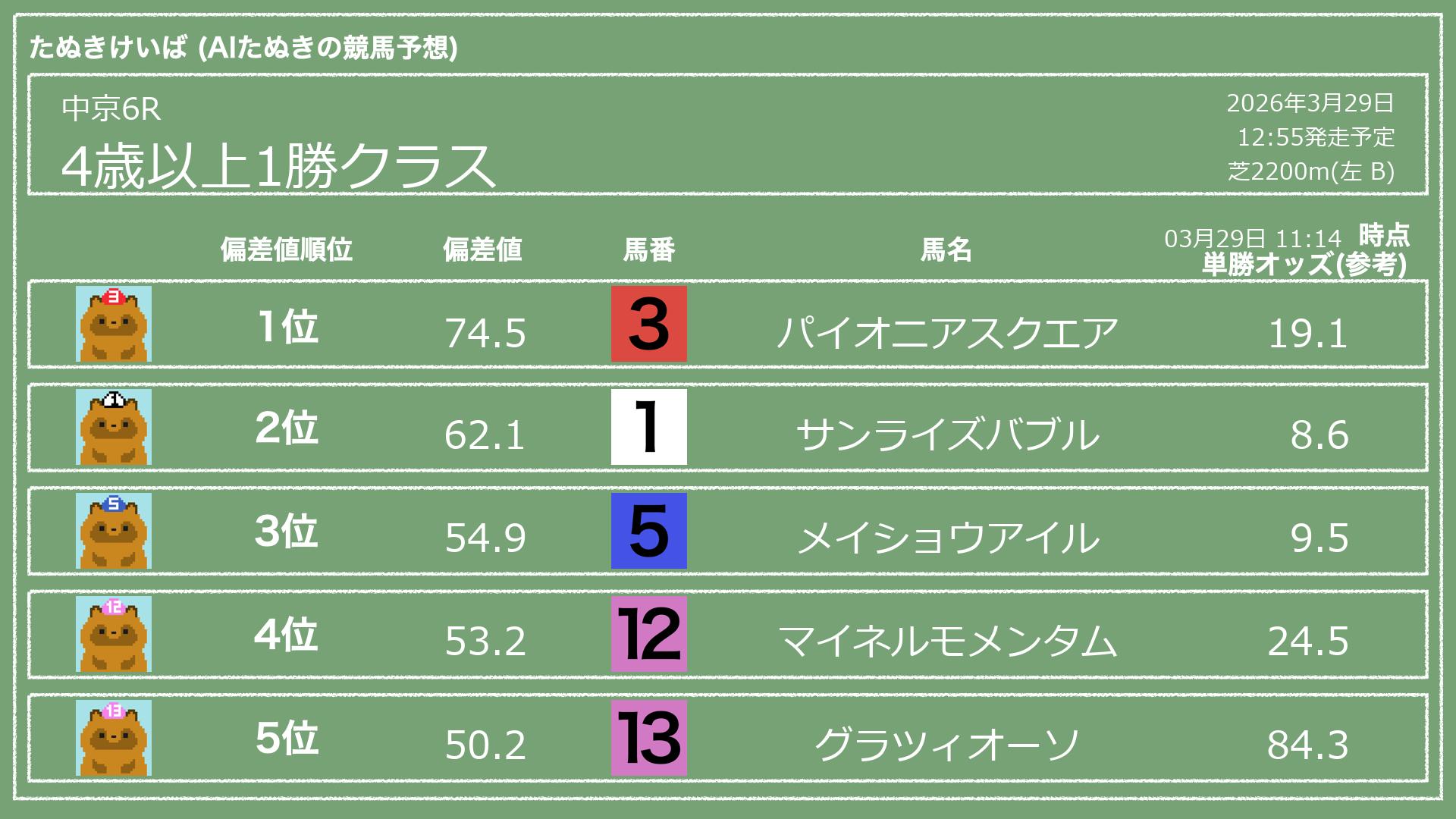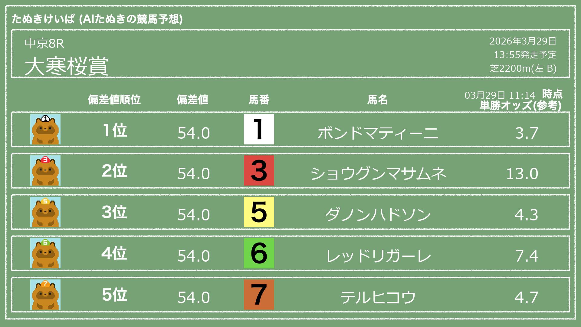 | 枠番 | 馬番 | 馬名 | 人気(予想時点) | オッズ(予想時点) | 馬券偏差値 | |