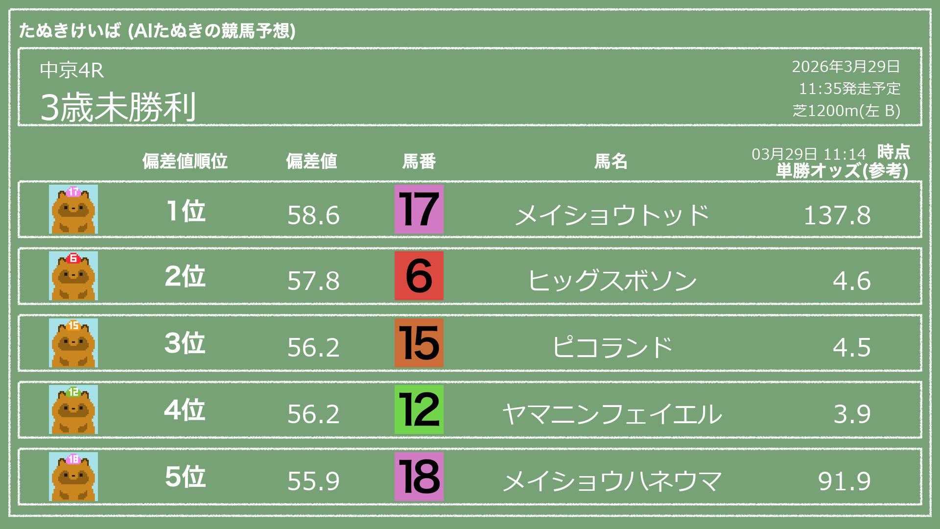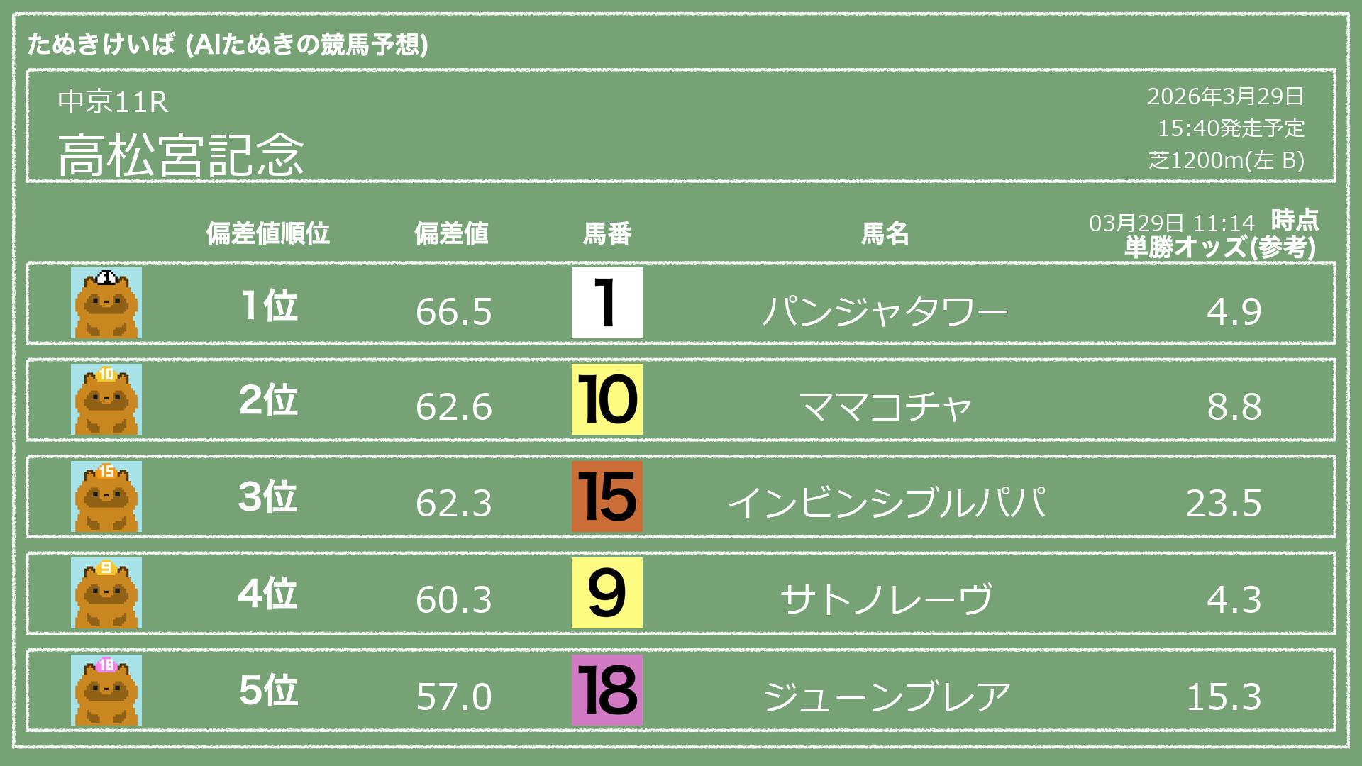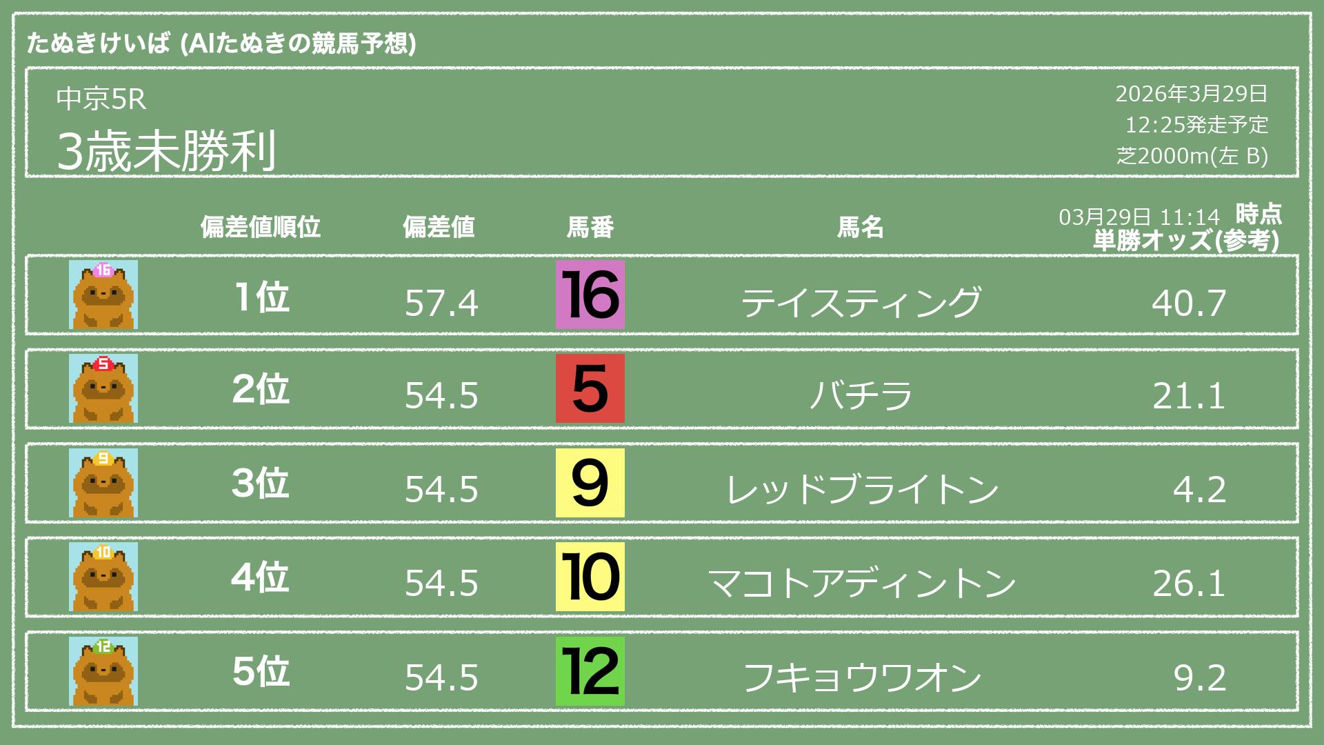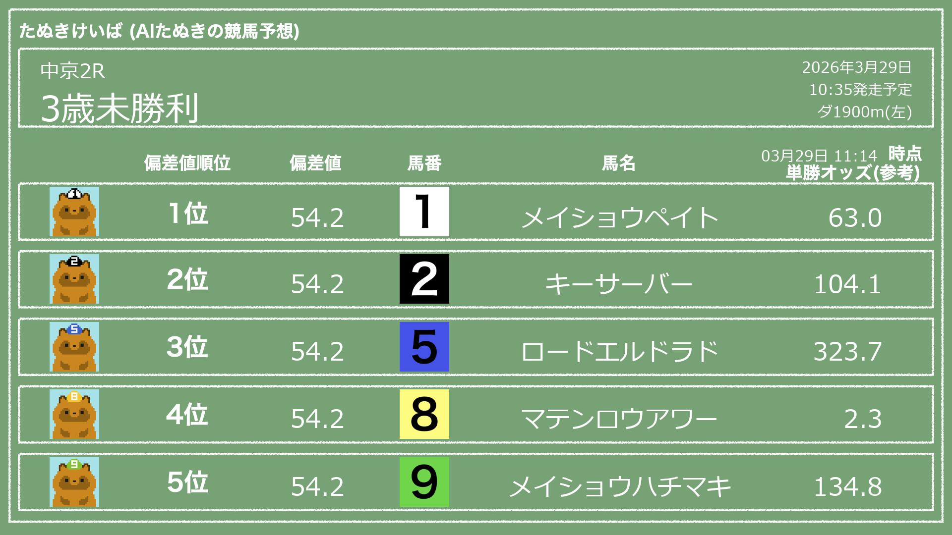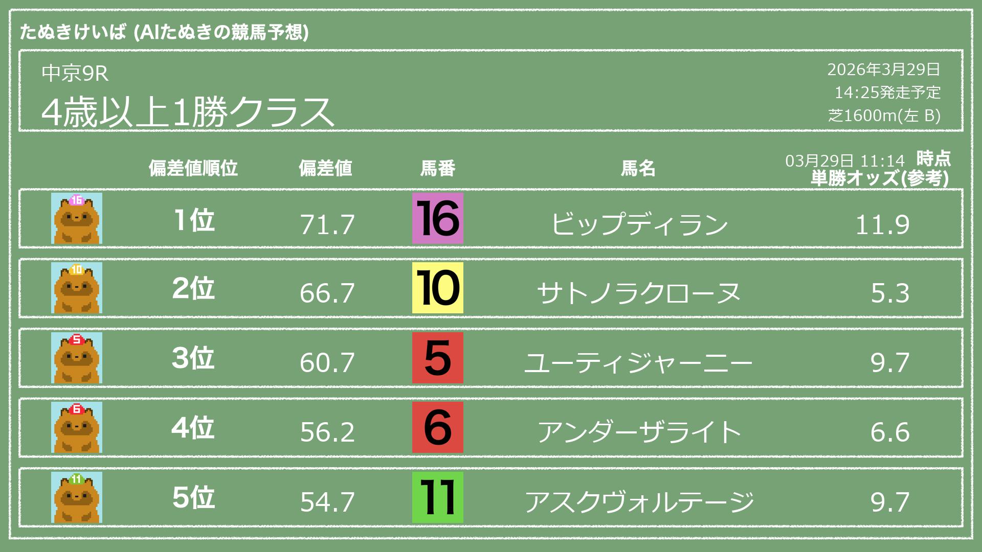 | 枠番 | 馬番 | 馬名 | 人気(予想時点) | オッズ(予想時点) | 馬券偏差値 | |