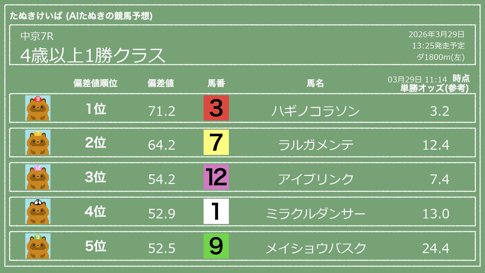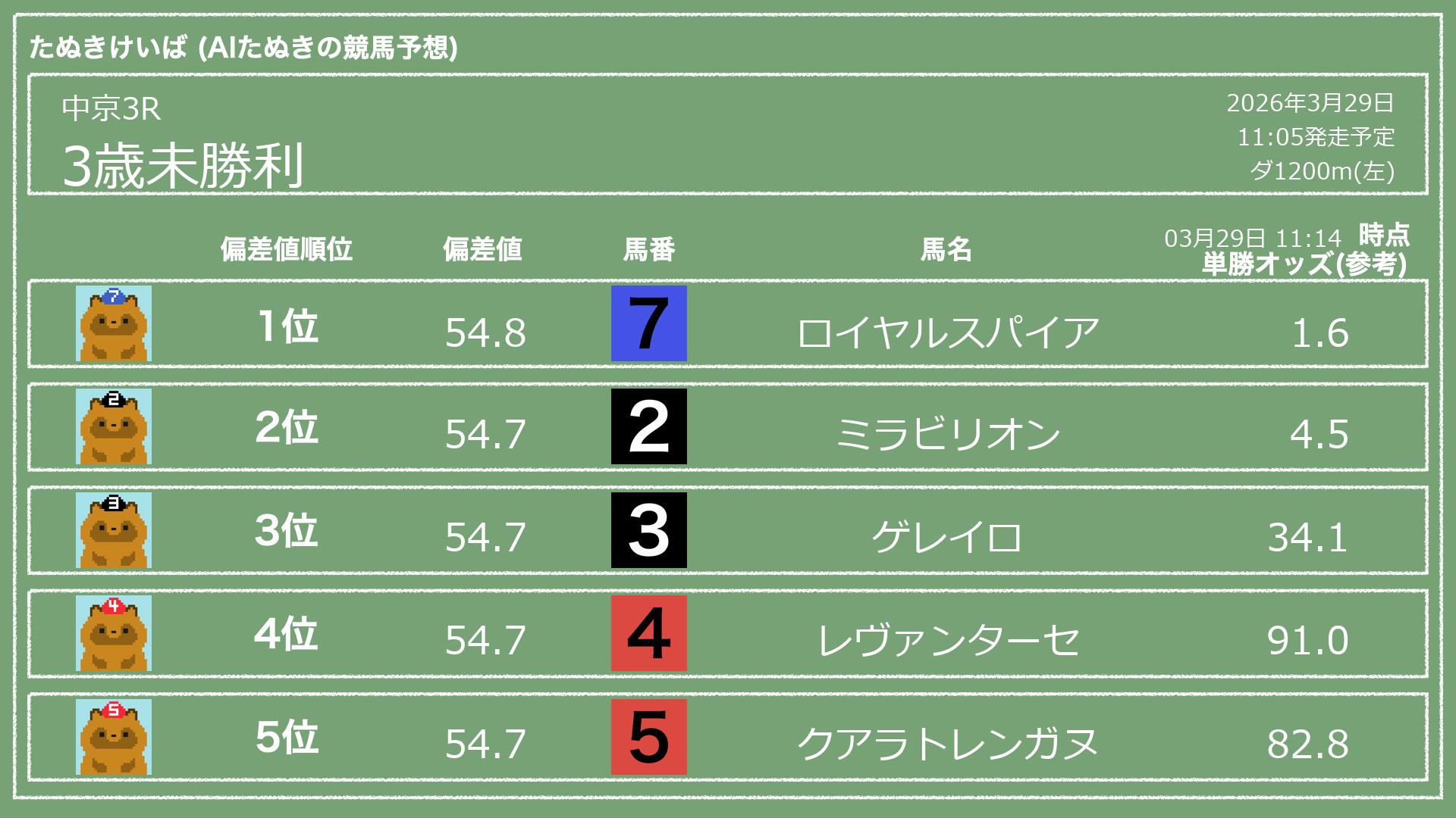 | 1 | 3 | 3 | ハギノコラソン | 1 | 3.2 | 71.2 |