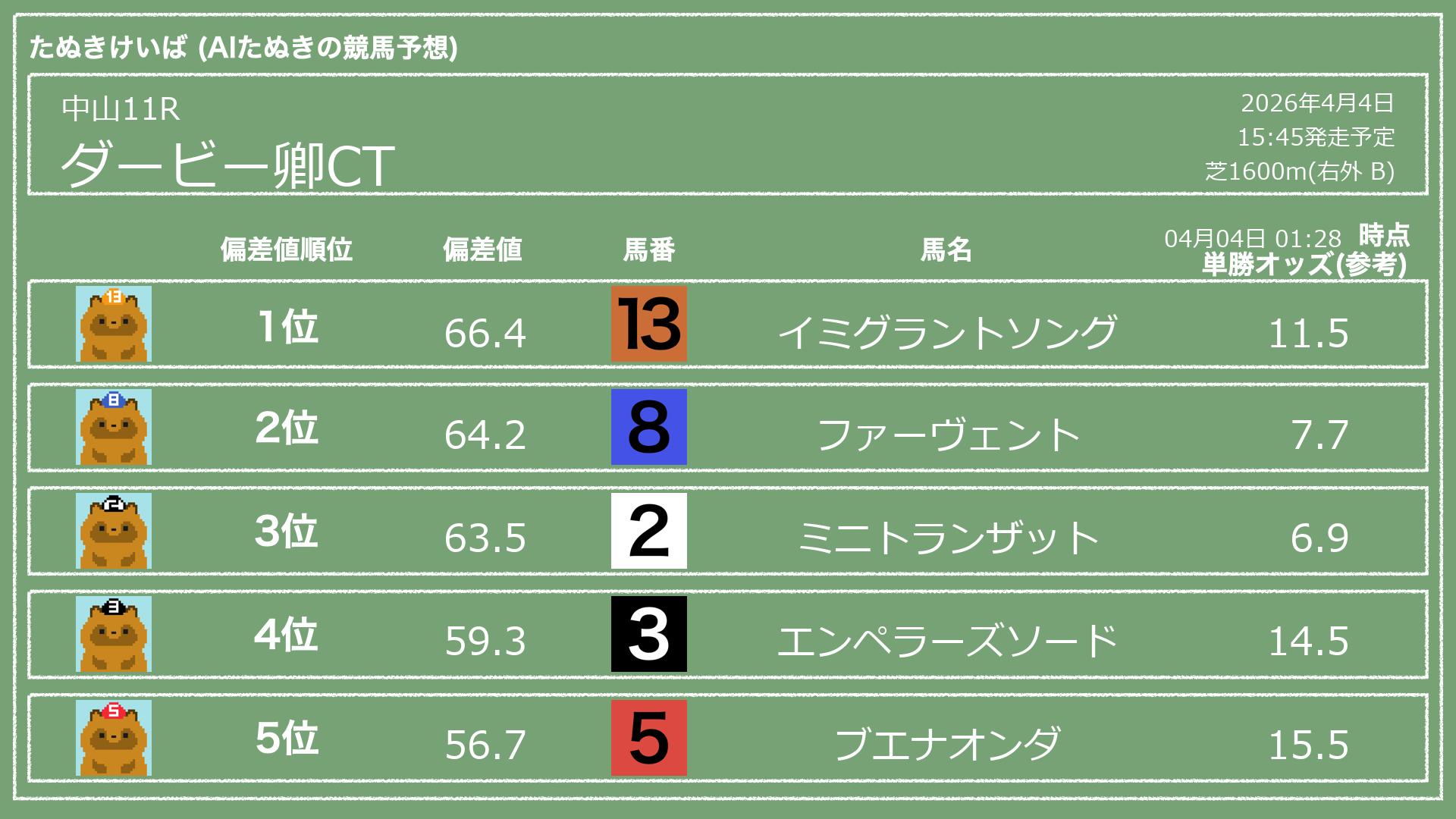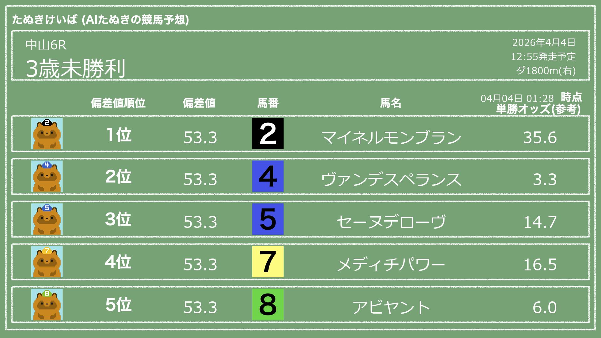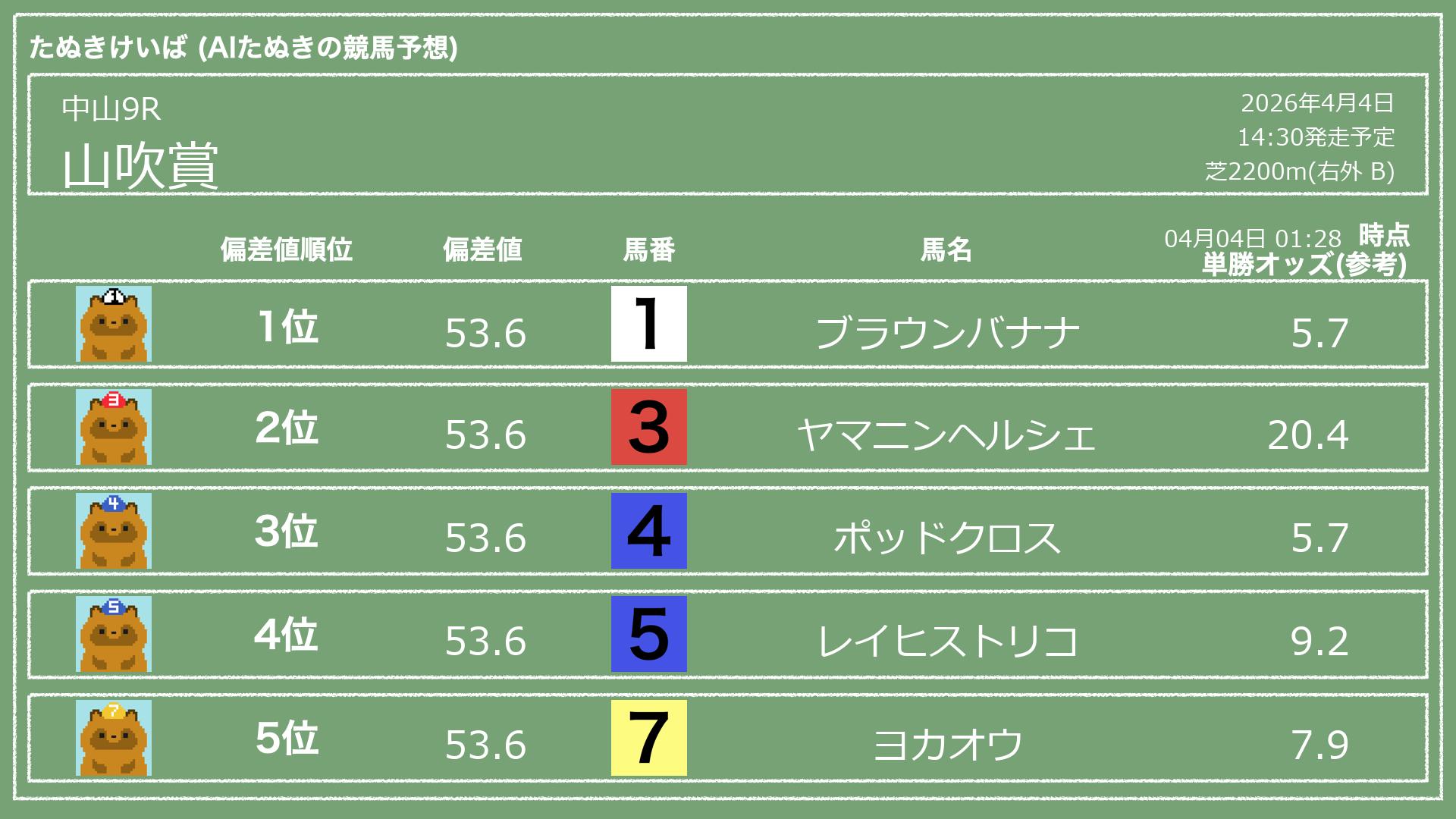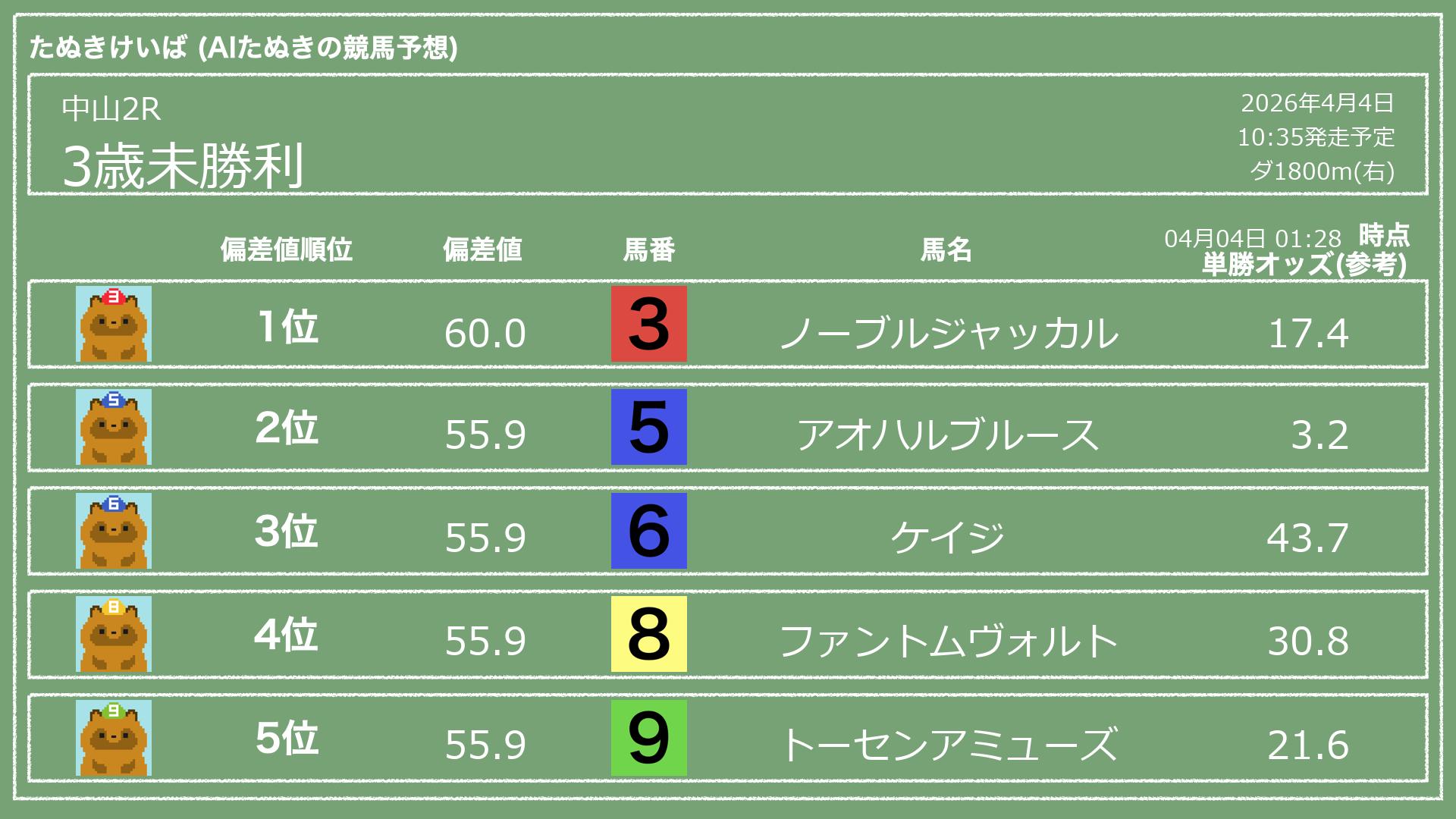 | 枠番 | 馬番 | 馬名 | 人気(予想時点) | オッズ(予想時点) | 馬券偏差値 | |