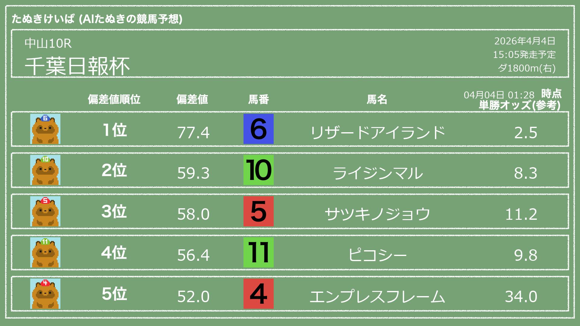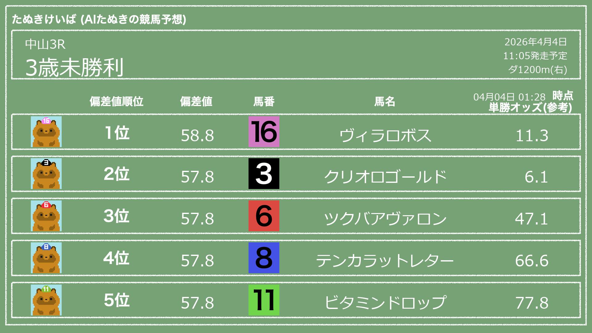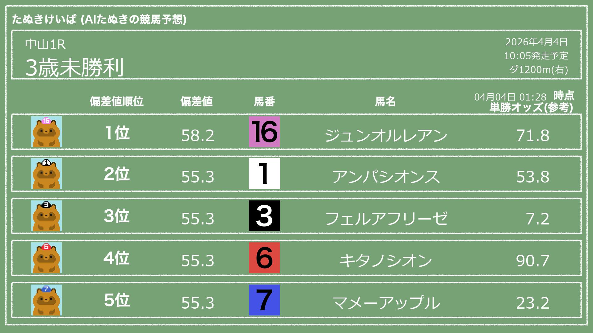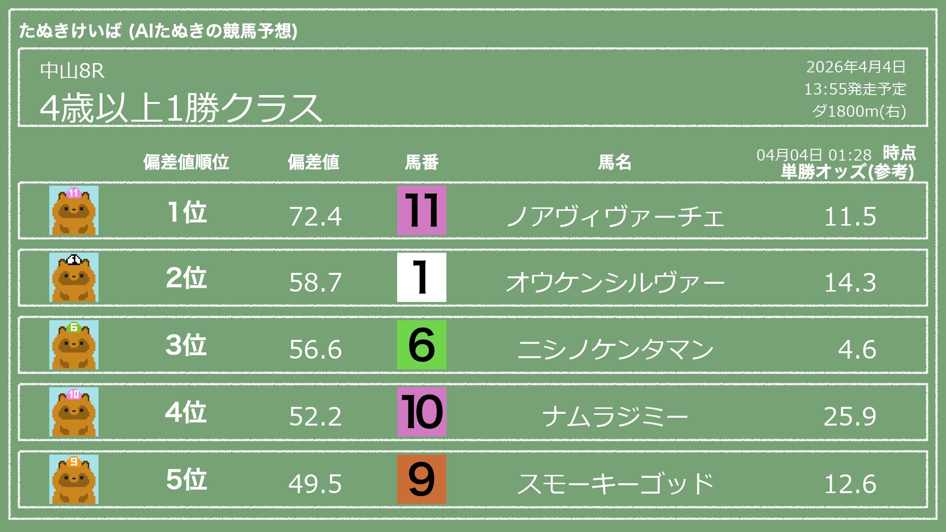 | 枠番 | 馬番 | 馬名 | 人気(予想時点) | オッズ(予想時点) | 馬券偏差値 | |