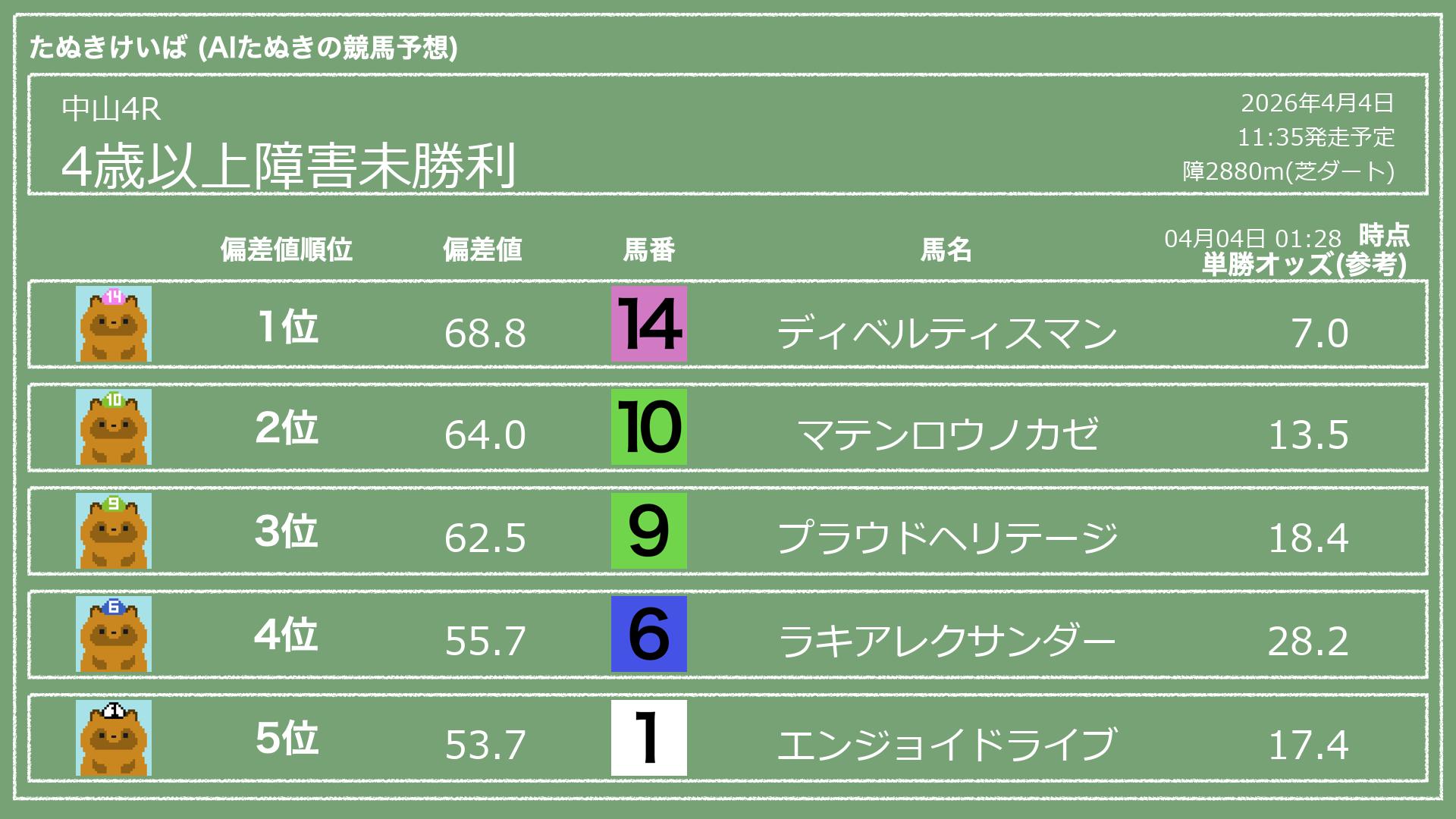 | 14 | 7 | 11 | モンツァフレイバー | 4 | 7.8 | 37.1 |