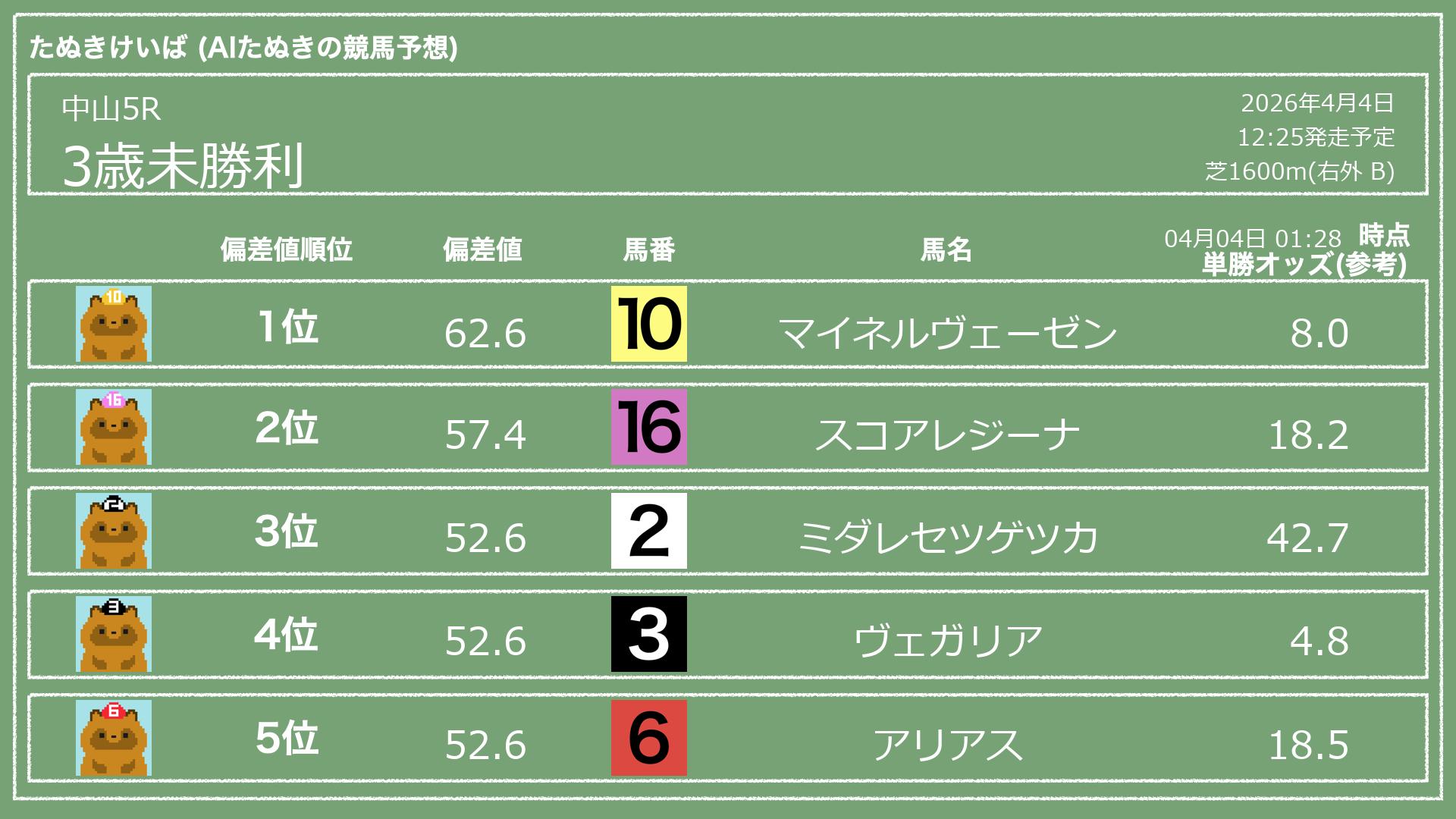 | 1 | 5 | 10 | マイネルヴェーゼン | 4 | 8.0 | 62.6 |