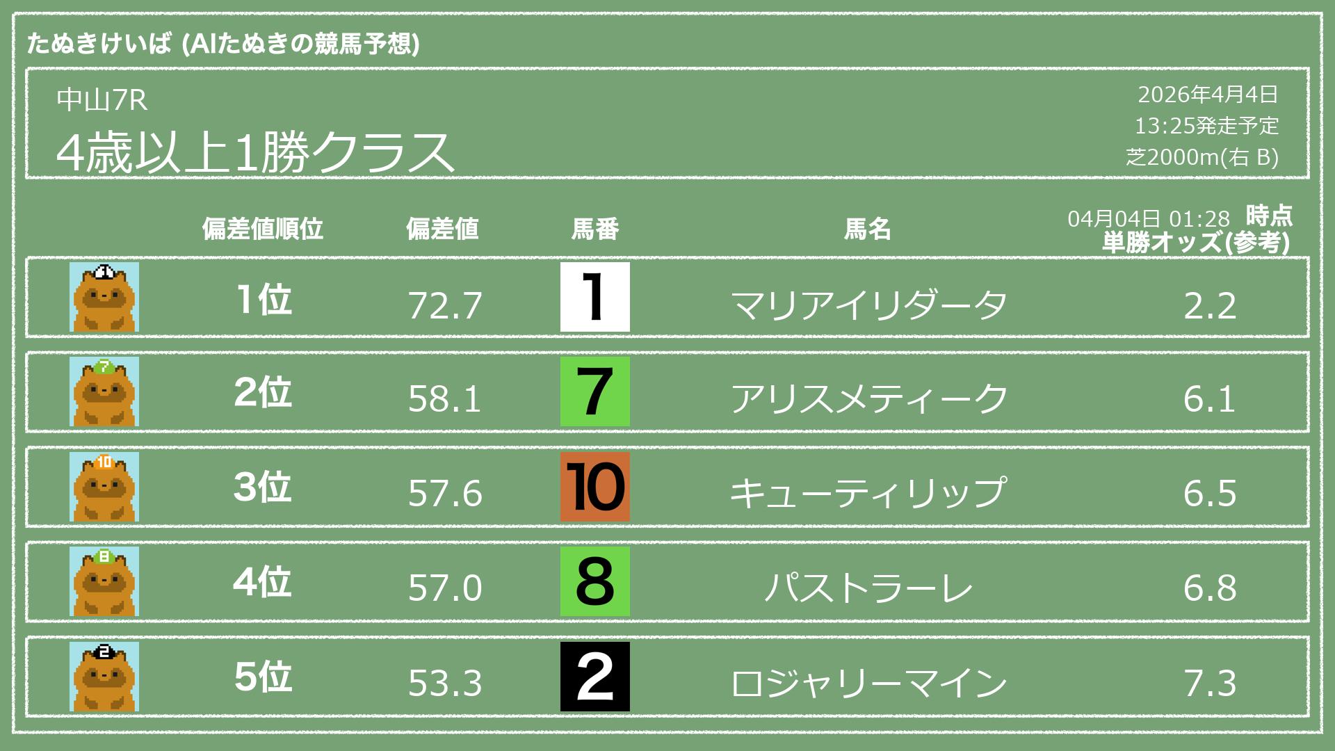 | 13 | 7 | 13 | ヤマニンアレシス | 1 | 3.3 | 50.5 |